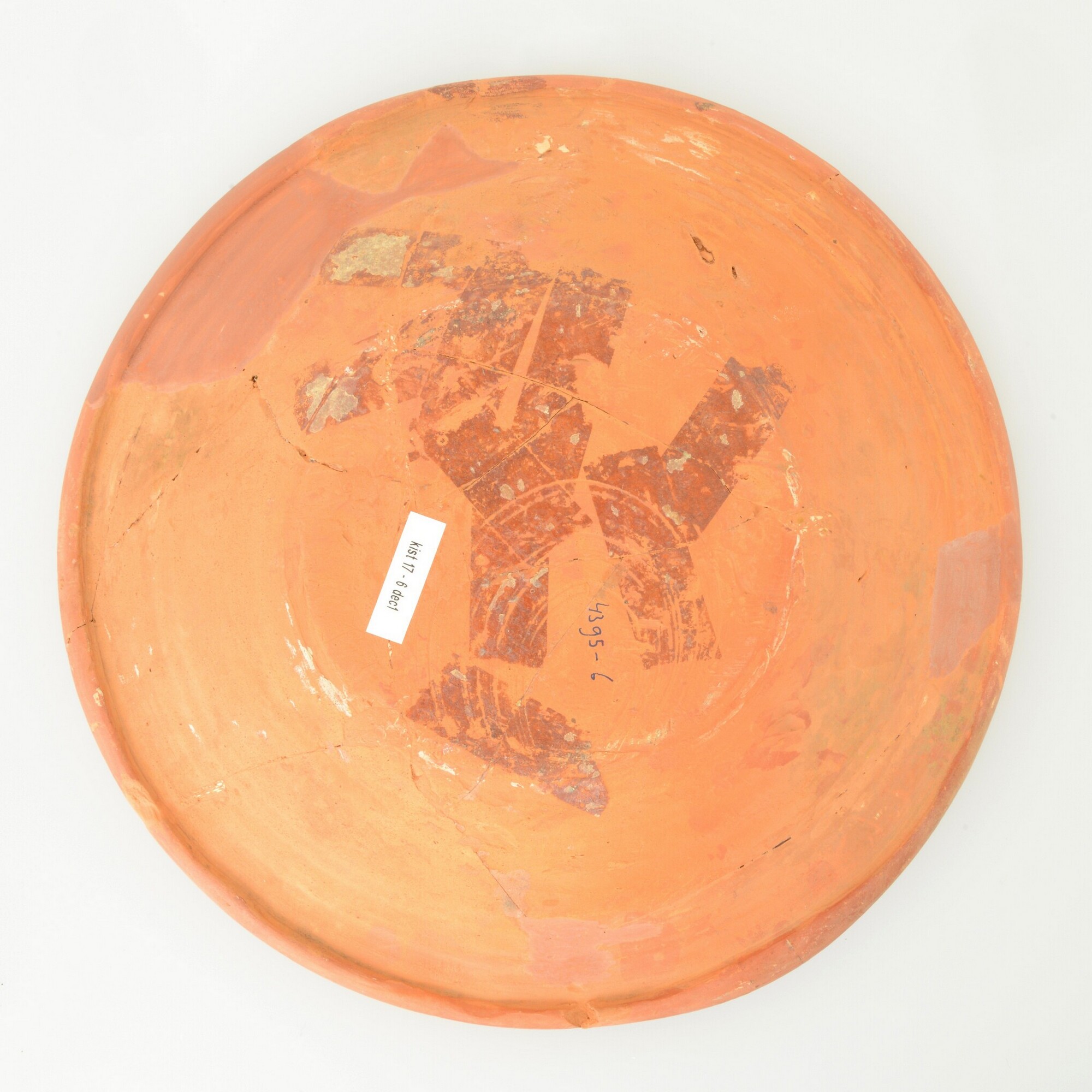Schotel; wa-bor-1; roodbakkend; halffabricaat, biscuit; slibversiering, slib-krastechniek; vl: concentrische cirkels, ornamentbanden, sp: kussen, initialen DCS en jaartal 1605; standvlak; productieplaats: Enkhuizen