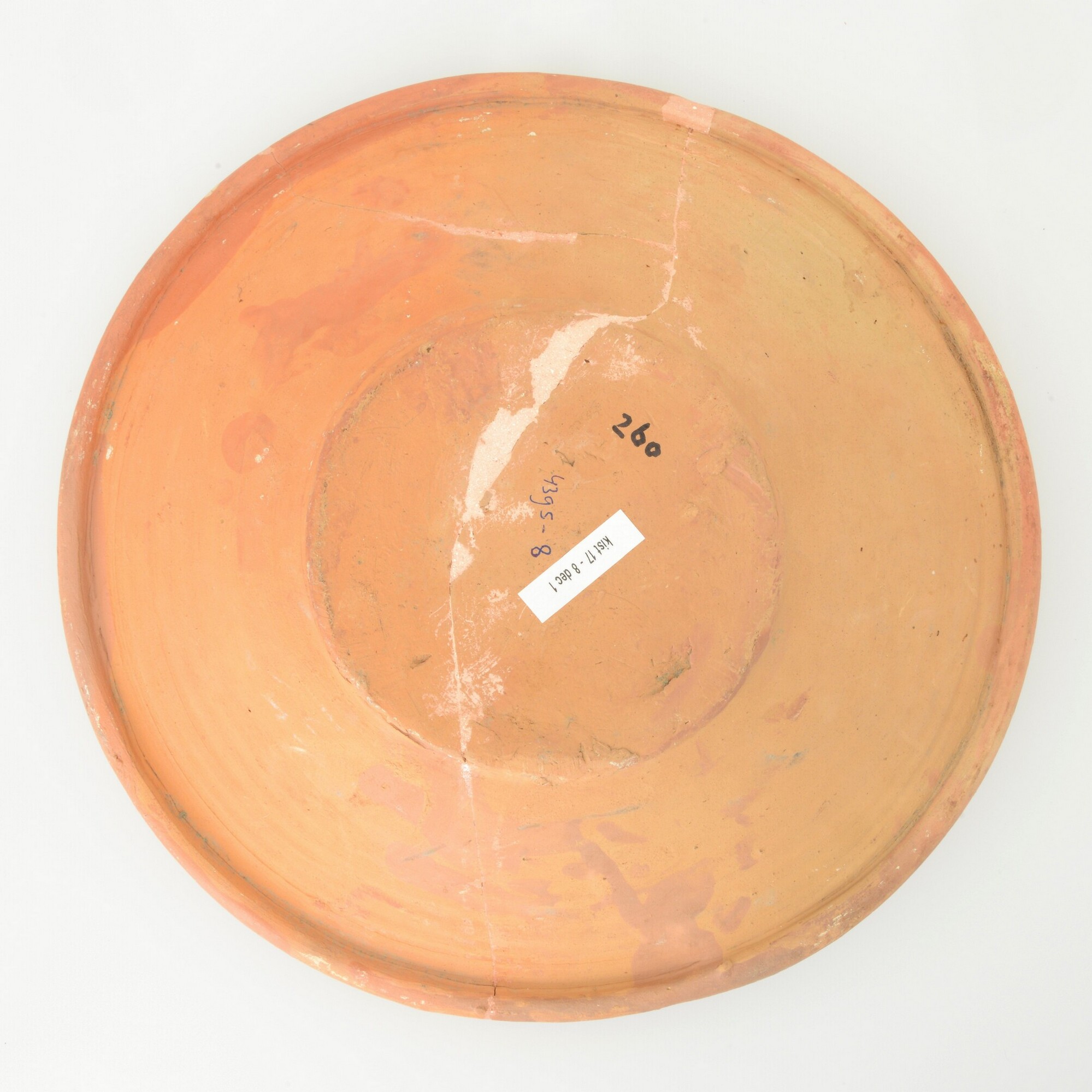 Schotel; wa-bor-1; roodbakkend; halffabricaat, biscuit; slibversiering, slib-krastechniek; vl: concentrische cirkels, ornamentbanden, sp: springende hinde, initialen DCS en jaartal 1605; standvlak; productieplaats: Enkhuizen