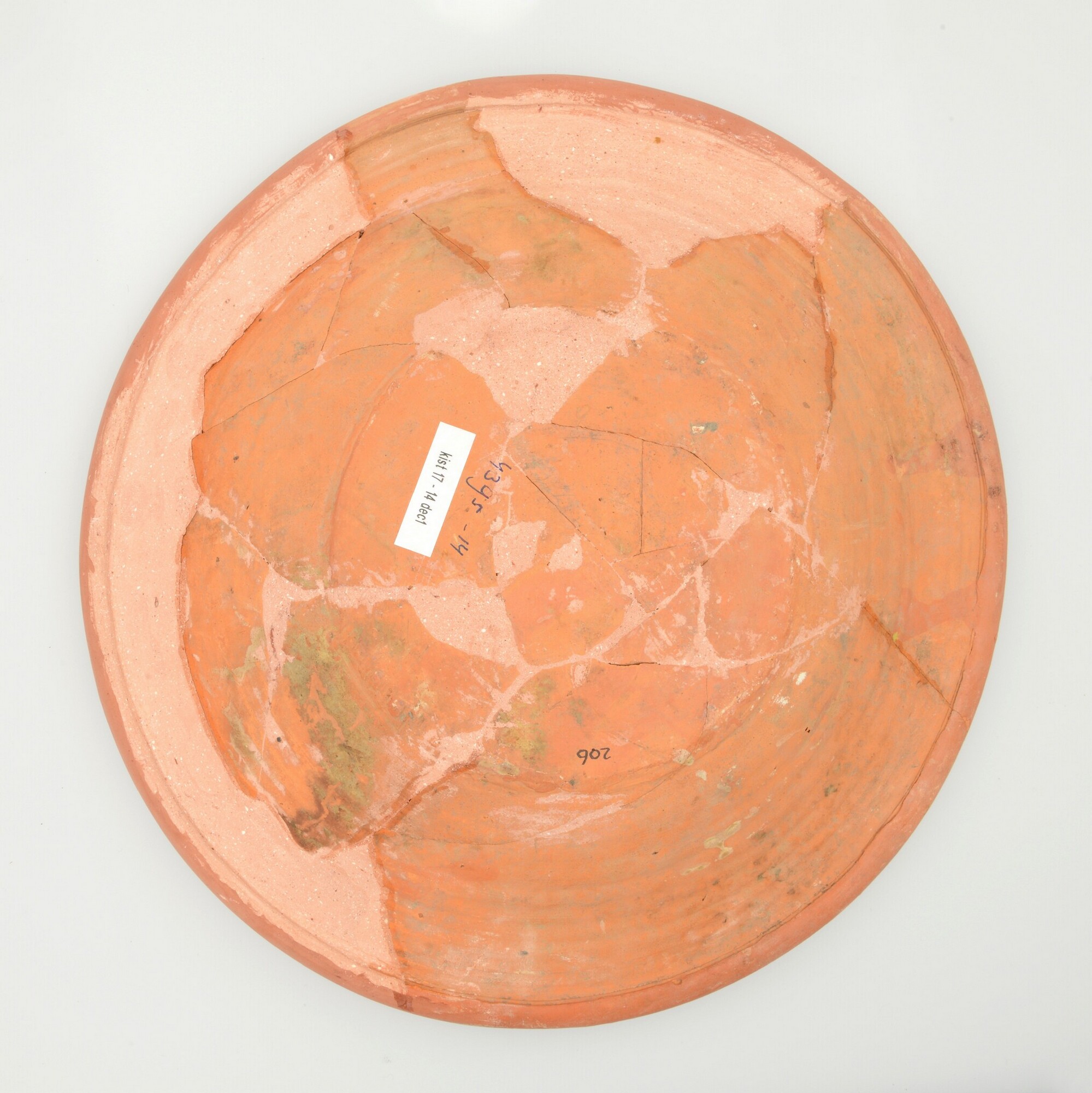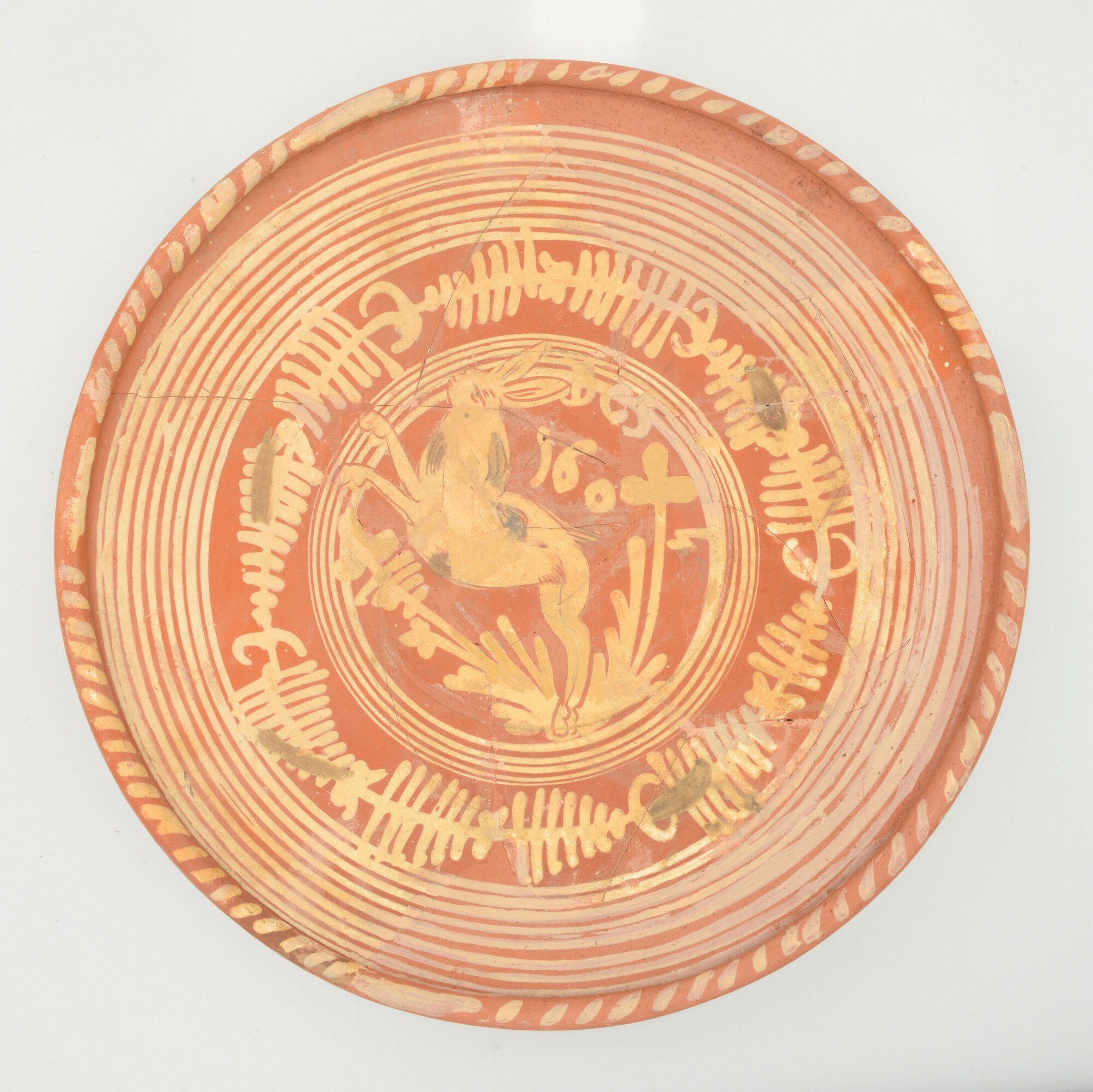 Aardewerk; roodbakkend; koperoxide; vl: concentrische cirkels, ornamentbanden, sp: springende haas, initialen DCS 1605; standvlak; productieplaats: Enkhuizen