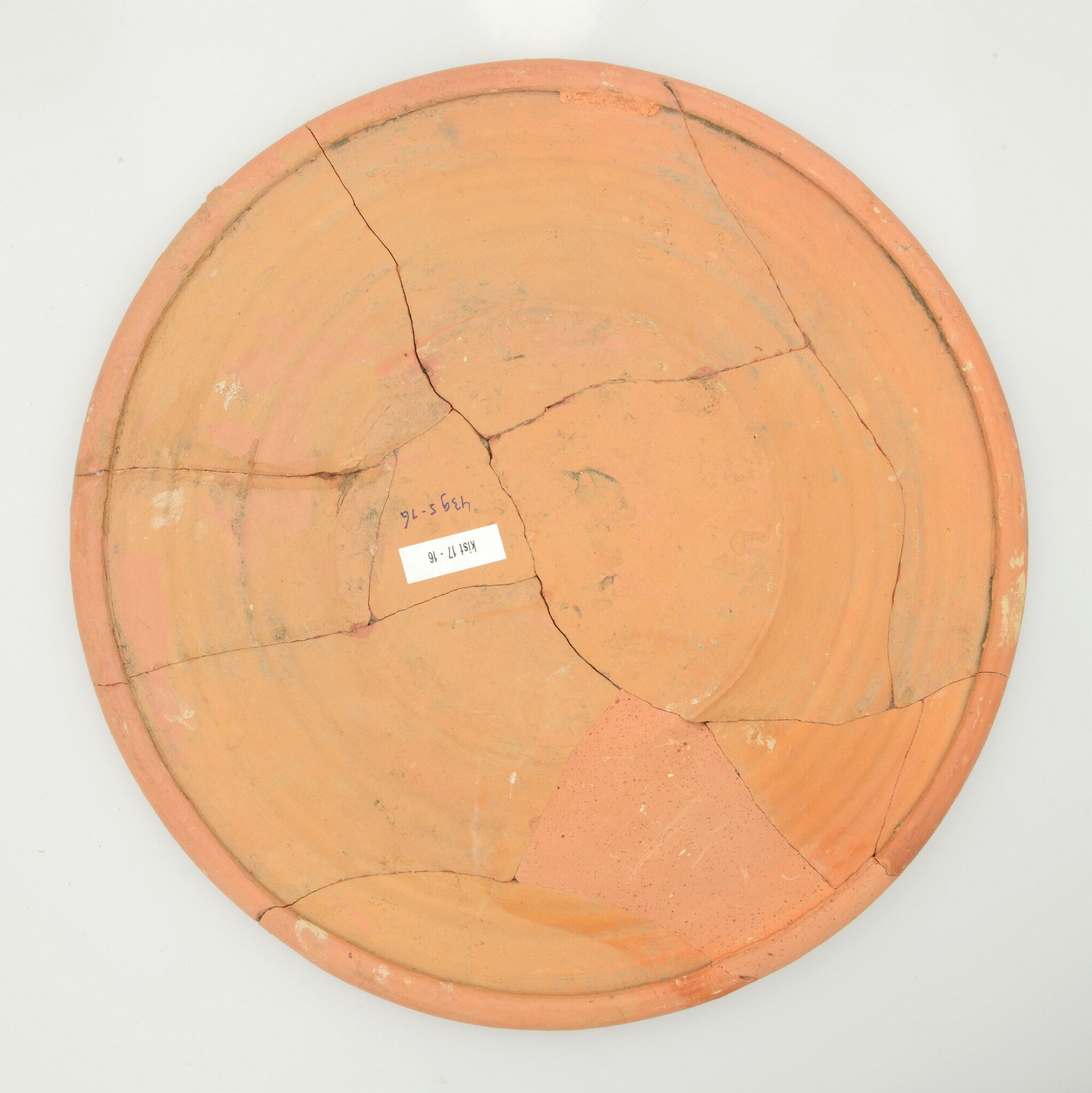 Schotel; wa-bor-1; roodbakkend; halffabricaat, biscuit; slibversiering, slib-krastechniek; vl: concentrische cirkels, ornamentbanden, sp: Heilige Thomas, initialen DCS en jaartal 1605; standvlak; productieplaats: Enkhuizen
