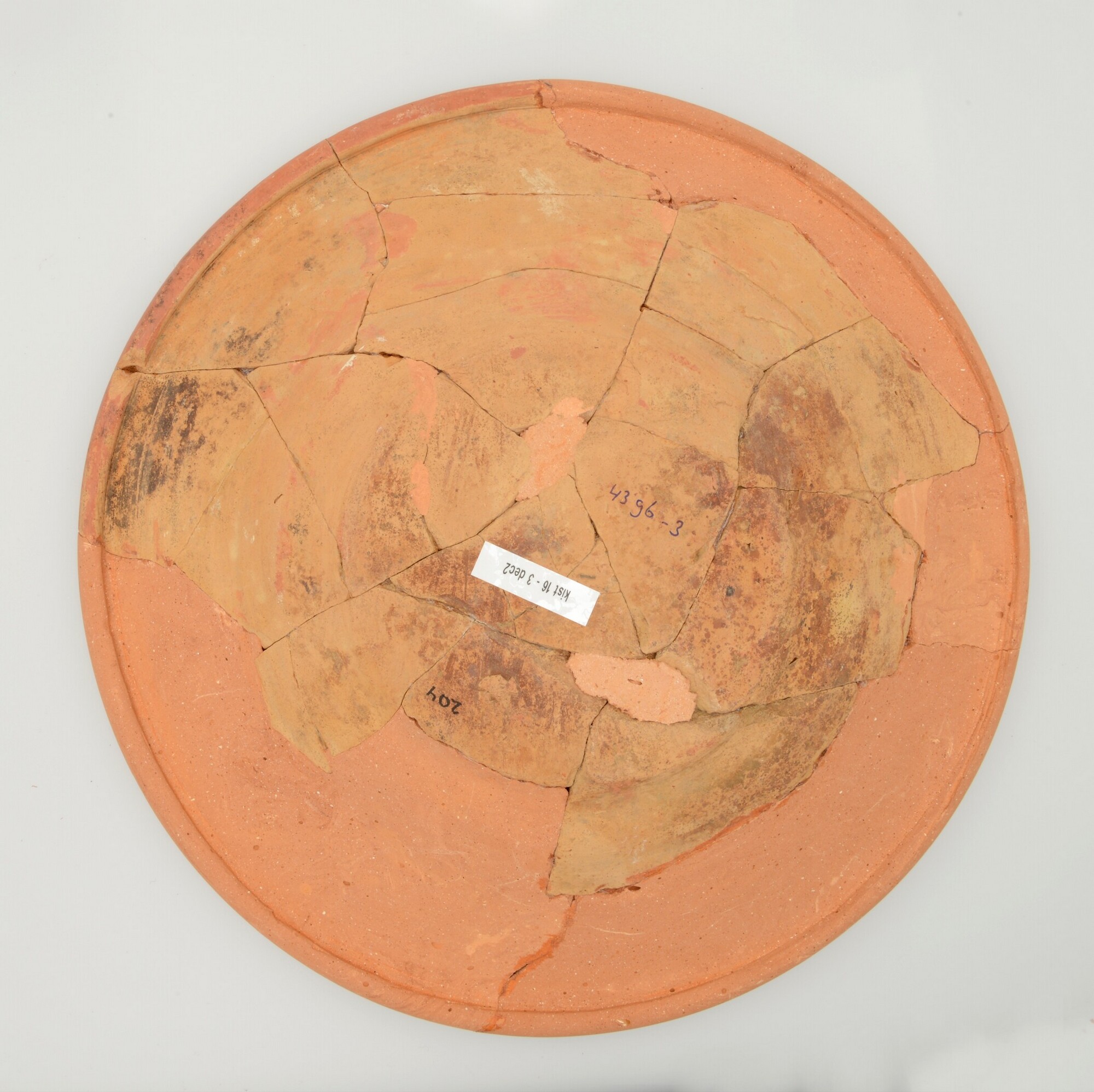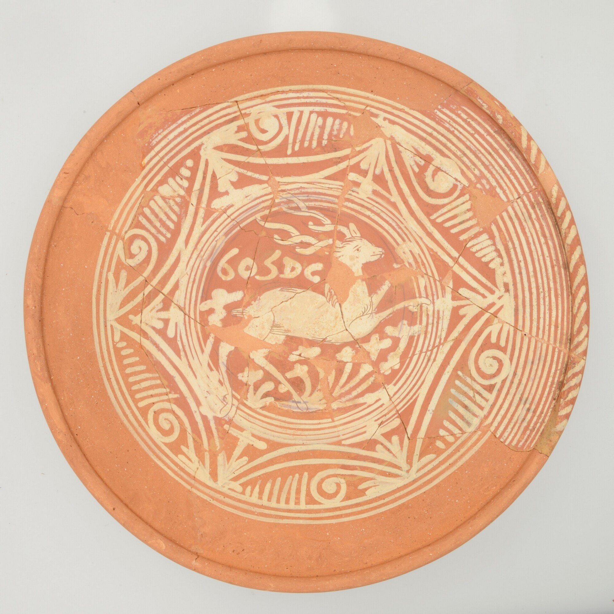 Schotel; wa-bor-1; roodbakkend; halffabricaat, biscuit; slibversiering, slib-krastechniek; vl: concentrische cirkels, ornamentbanden, sp: hert, initialen DCS en jaartal 1605; standvlak; productieplaats: Enkhuizen