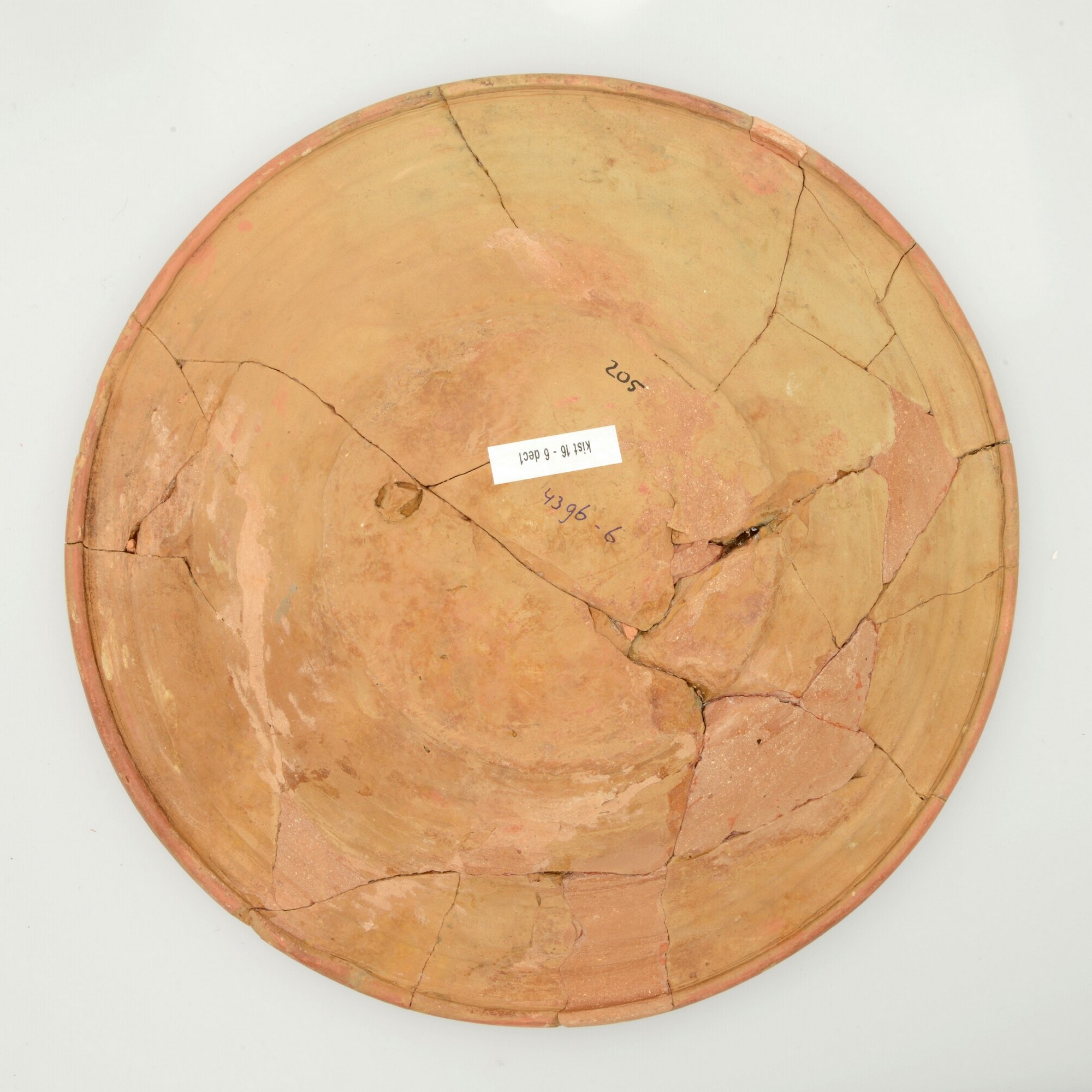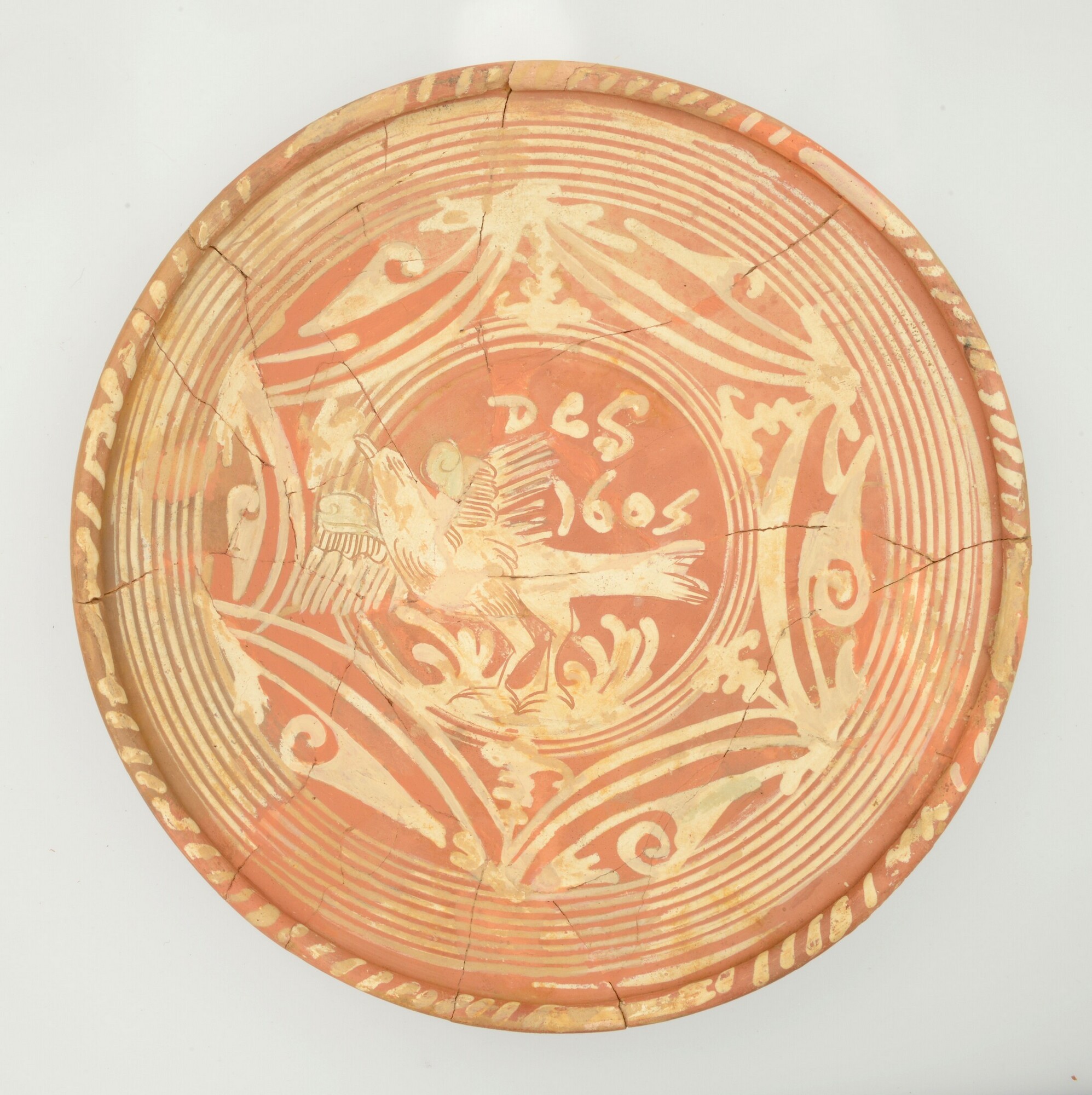 Schotel; wa-bor-1; roodbakkend; halffabricaat, biscuit; slibversiering, slib-krastechniek; vl: concentrische cirkels, ornamentbanden, sp: vogel met gespreide vleugels, initialen DCS en jaartal 1605; standvlak; productieplaats: Enkhuizen