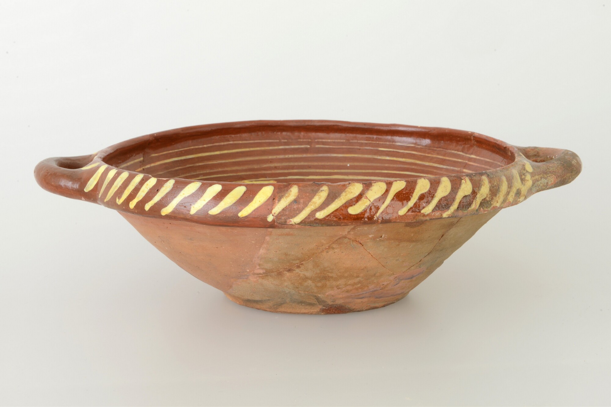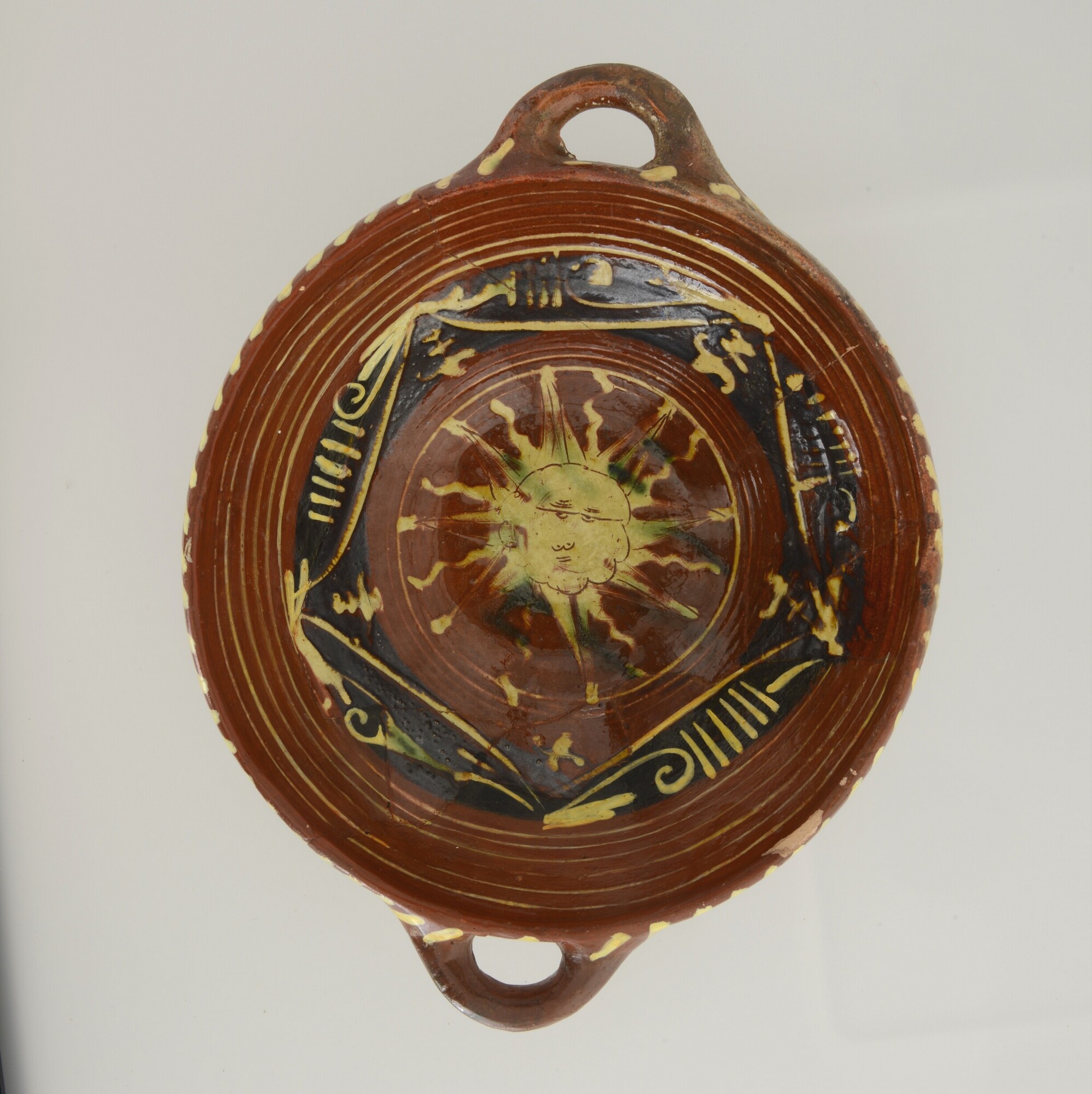 Kom; wa-kom-1; roodbakkend; verbrand; loodglazuur; slibversiering, slib-krastechniek; vl: concentrische cirkels, ornamentbanden, sp: zon; standvlak; twee horizontale worstoren; productieplaats: Enkhuizen