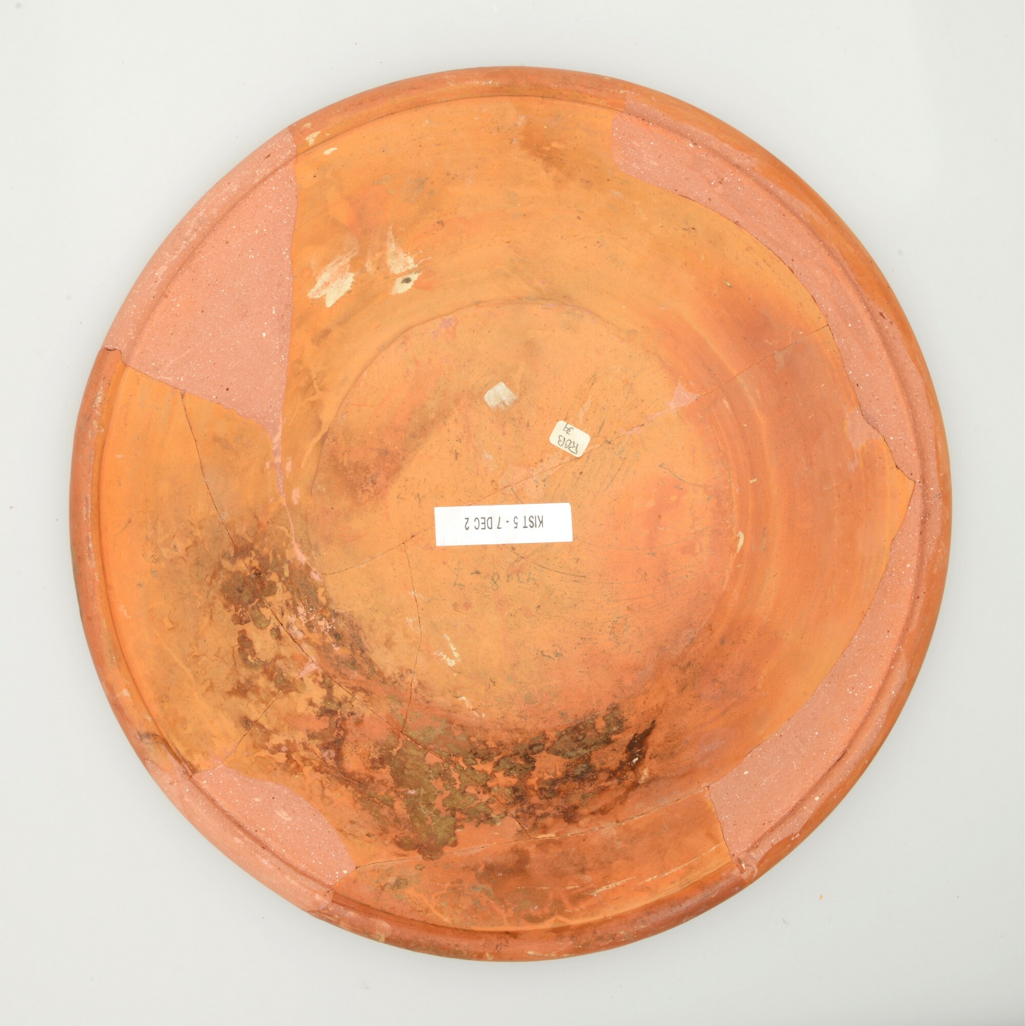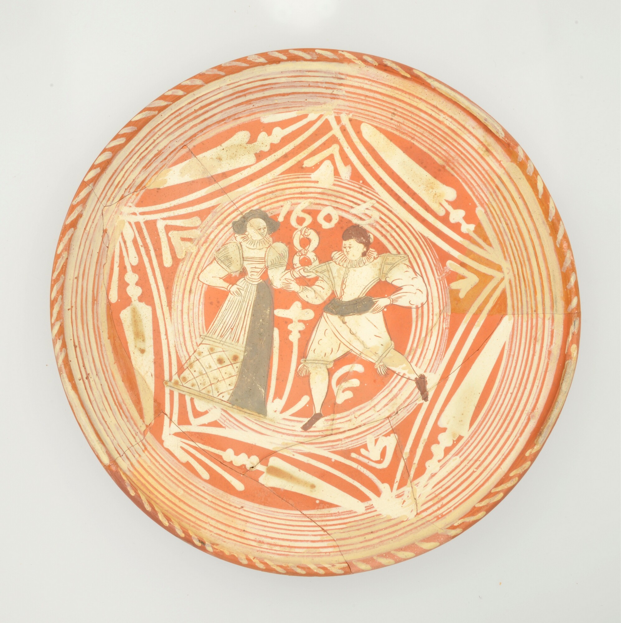 Bord; wa-bor-1; roodbakkend; halffabricaat, biscuit; slibversiering; slib-krastechniek; vlag: concentrische cirkels en ornamentbanden, spiegel: dansend paar en jaartal 1605; standvlak; productieplaats: Enkhuizen