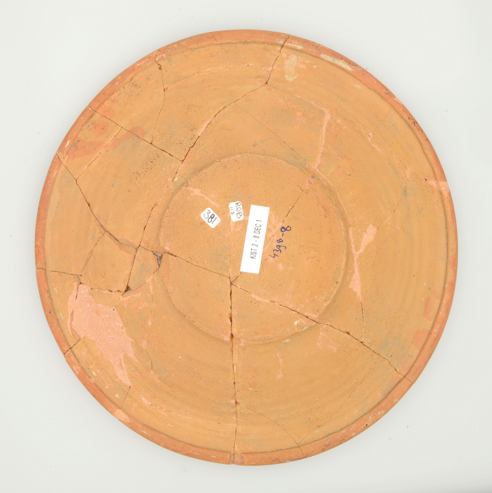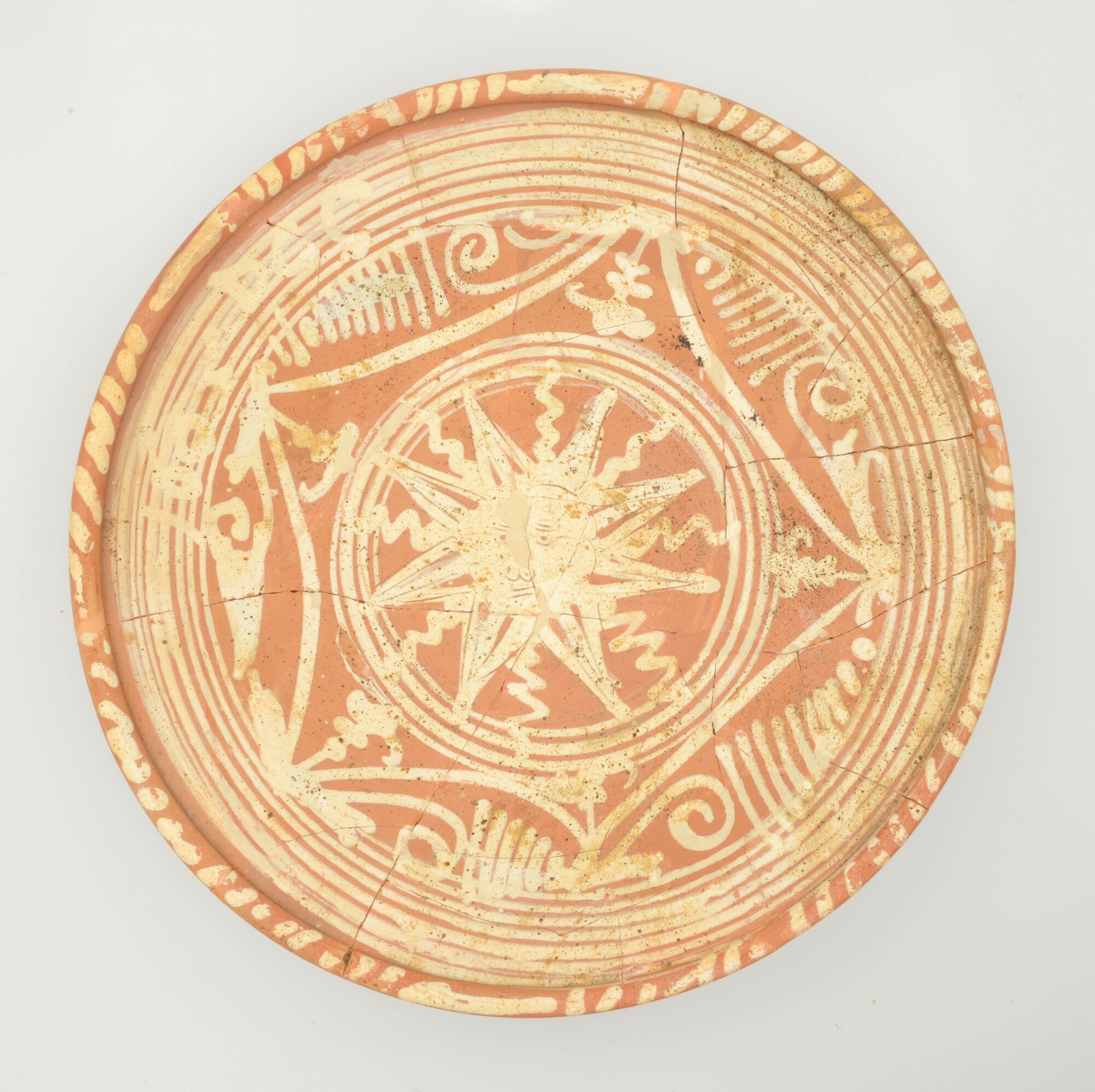 Schotel; wa-bor-1; roodbakkend; halffabricaat, biscuit; slibversiering, slib-krastechniek; vl: concentrische cirkels, ornamentbanden, sp: zon, achtpuntig; standvlak; productieplaats: Enkhuizen