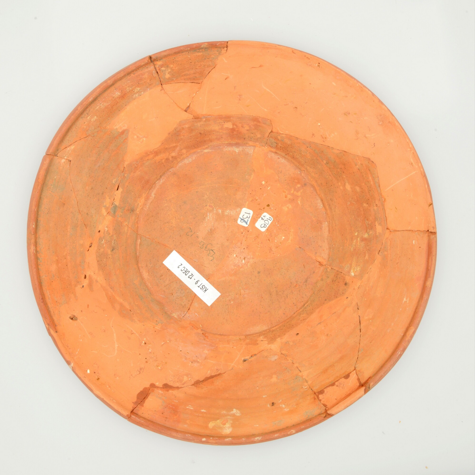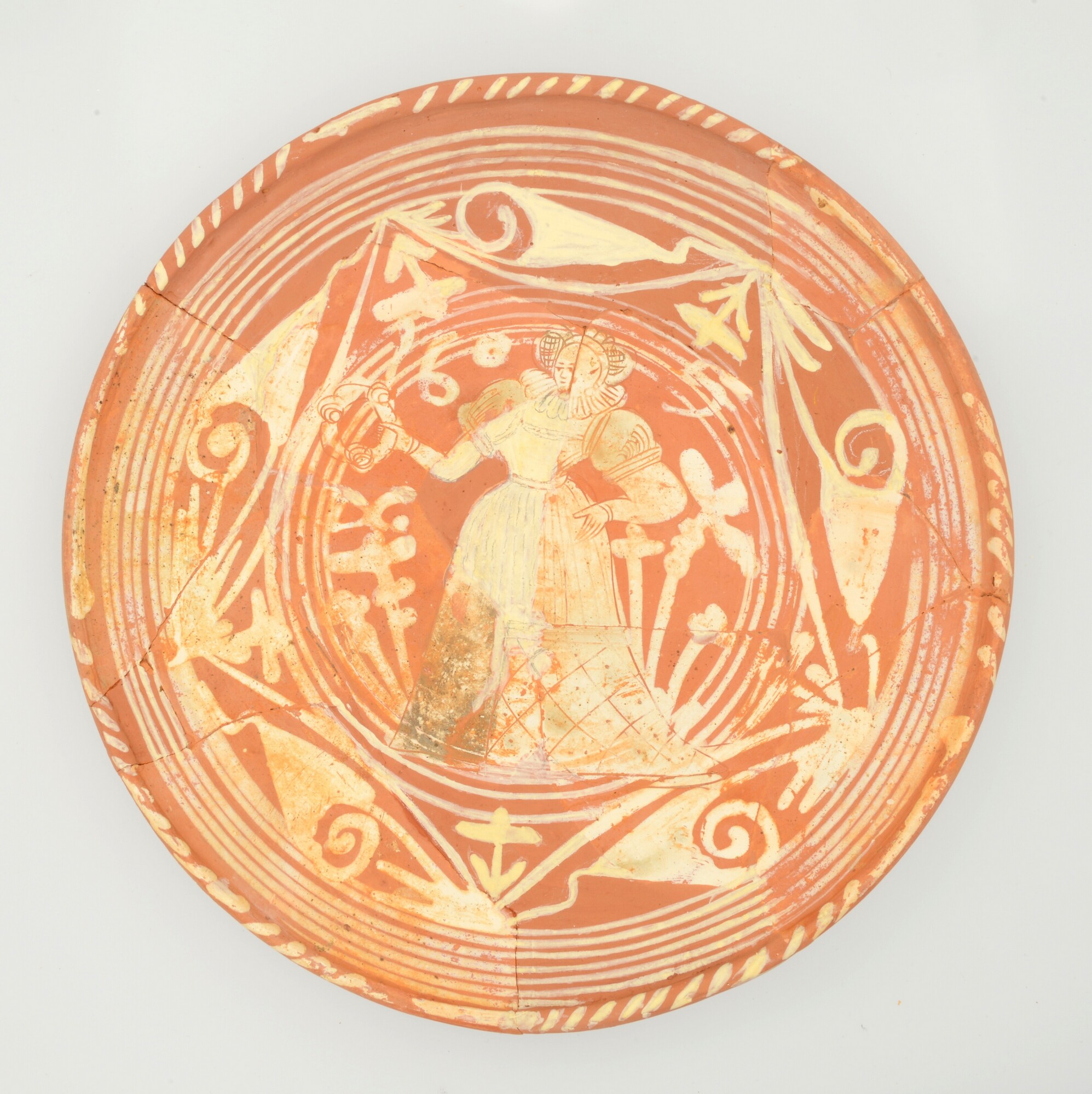 Schotel; wa-bor-1; roodbakkend; halffabricaat, biscuit; slibversiering, slib-krastechniek; vl: concentrische cirkels, ornamentbanden, sp: dame met krans of krans of tamboerijn en jaartal 1605; standvlak; productieplaats: Enkhuizen