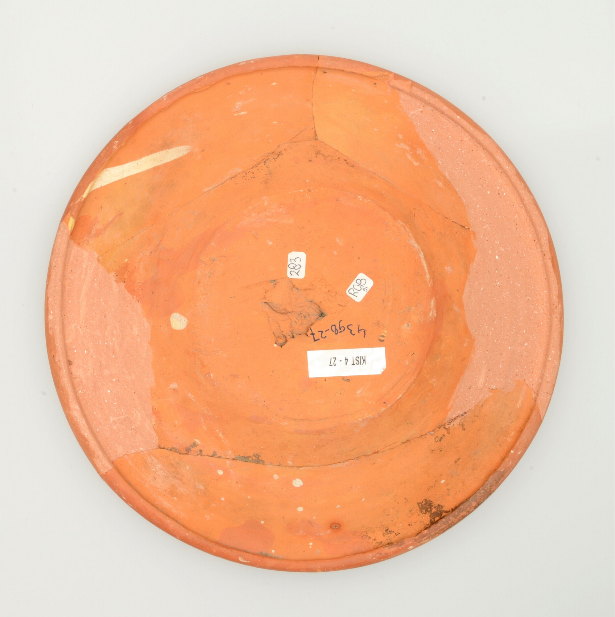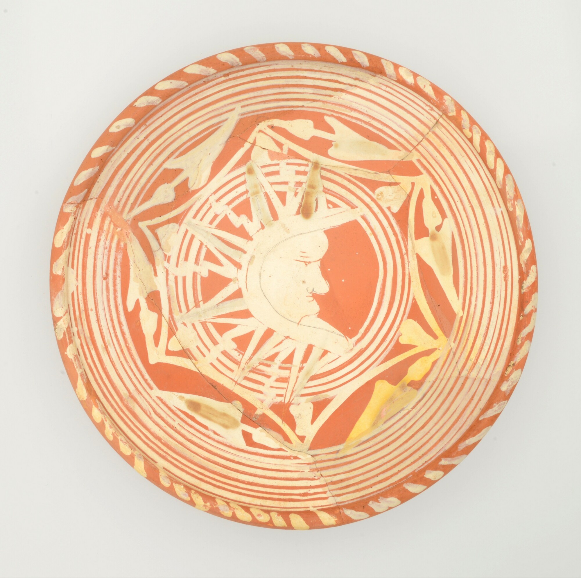 Schotel; wa-bor-1; roodbakkend; halffabricaat, biscuit; slibversiering, slib-krastechniek; vl: concentrische cirkels, ornamentbanden, sp: maansikkel humeurig kijkende maan, zespuntig; standvlak; productieplaats: Enkhuizen