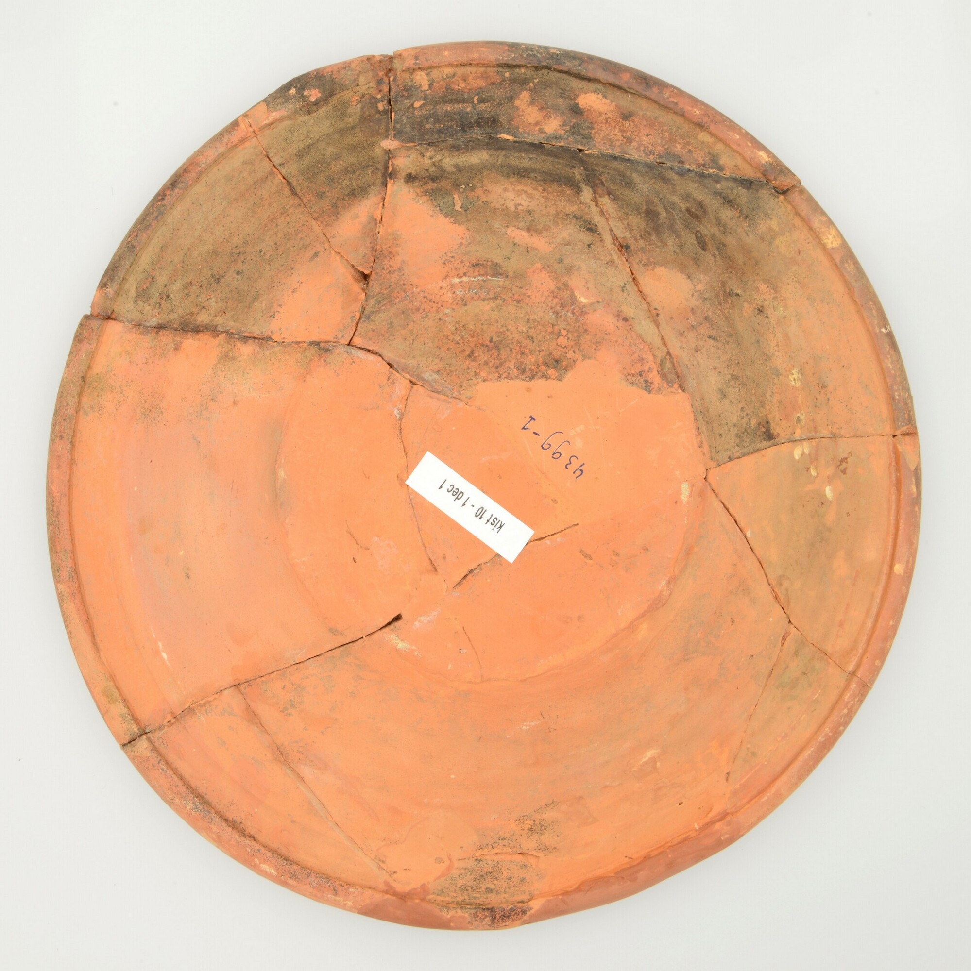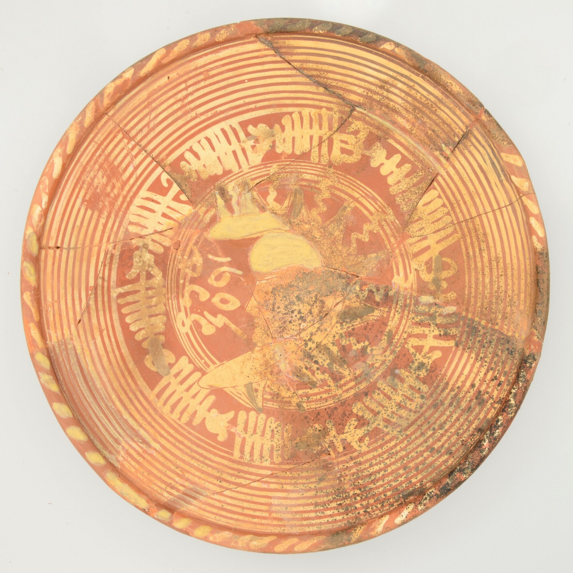 Schotel; wa-bor-1; roodbakkend; halffabricaat, biscuit; slibversiering, slib-krastechniek; vl: concentrische cirkels, ornamentbanden, sp: achtpuntige maan, initialen DCS en jaartal 1605; standvlak; productieplaats: Enkhuizen