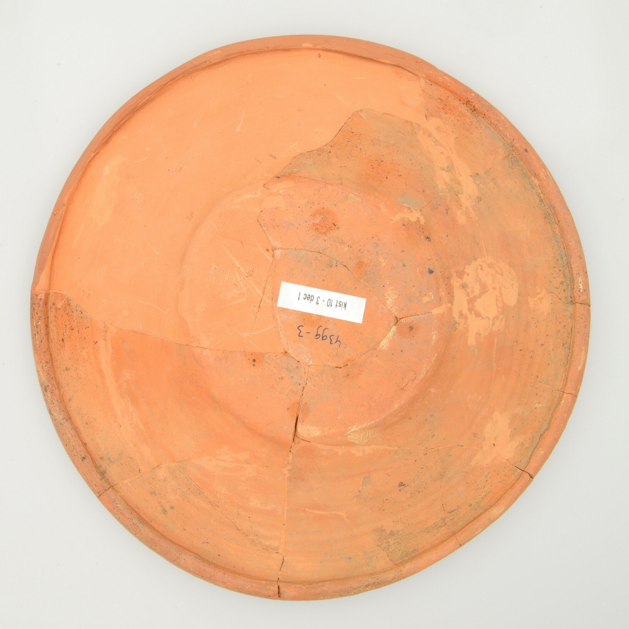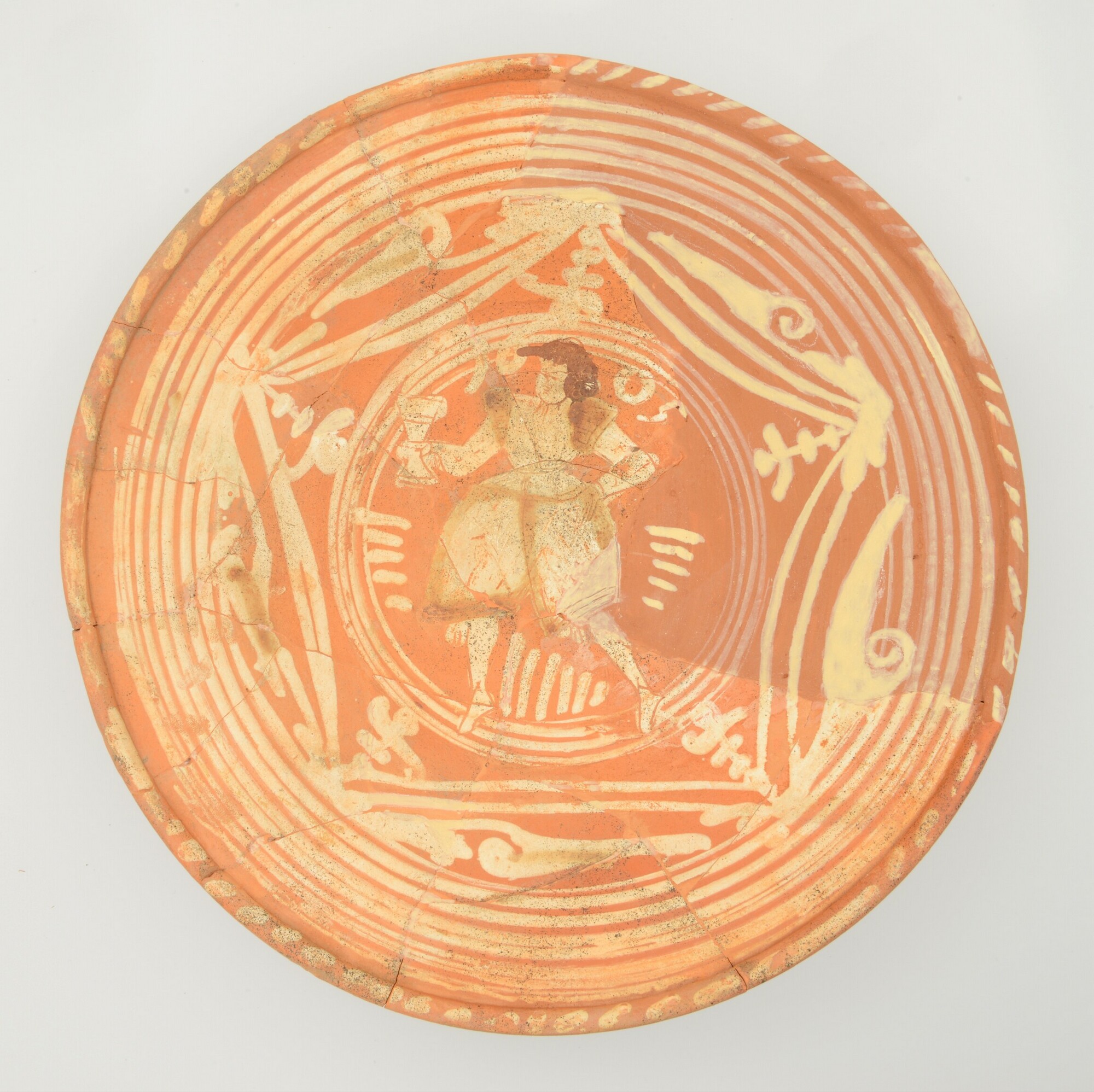 Schotel; wa-bor-1; roodbakkend; halffabricaat, biscuit; slibversiering, slib-krastechniek; vl: concentrische cirkels, ornamentbanden, sp: jongeman met kelk en jaartal 1605; standvlak; productieplaats: Enkhuizen
