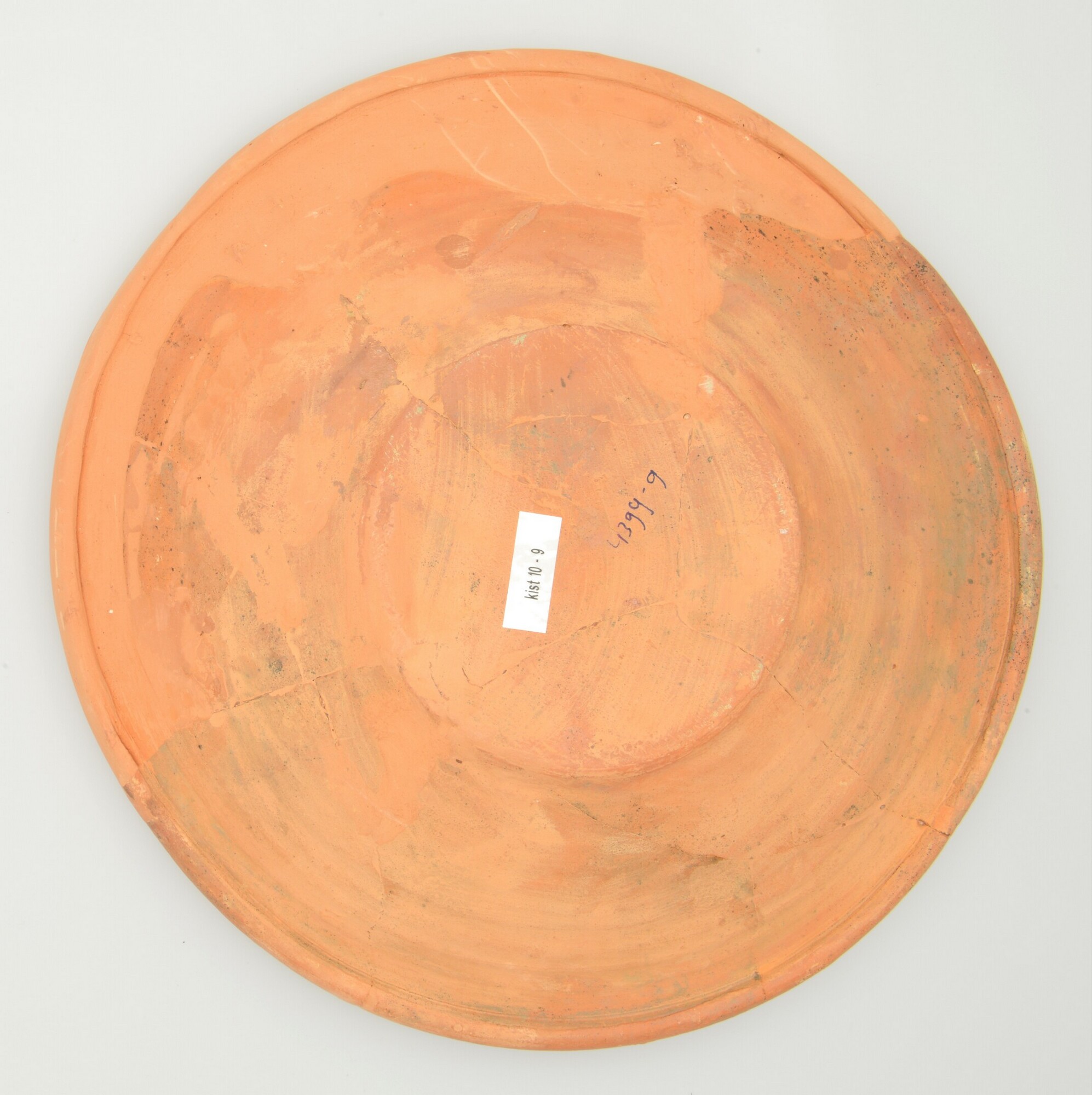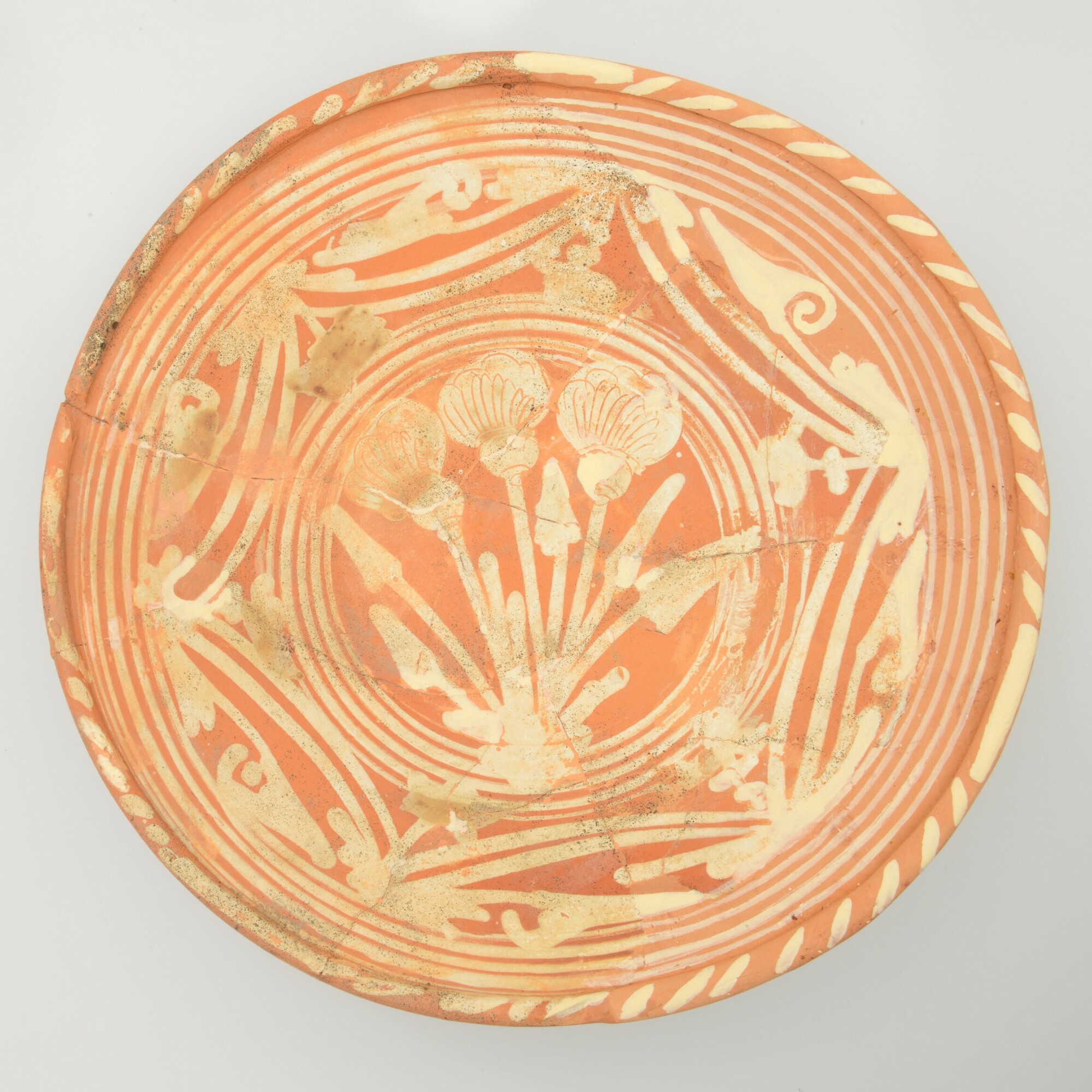 Schotel; wa-bor-1; roodbakkend; halffabricaat, biscuit; slibversiering, slib-krastechniek; vl: concentrische cirkels, ornamentbanden, sp: drie distelbloemen; standvlak; productieplaats: Enkhuizen