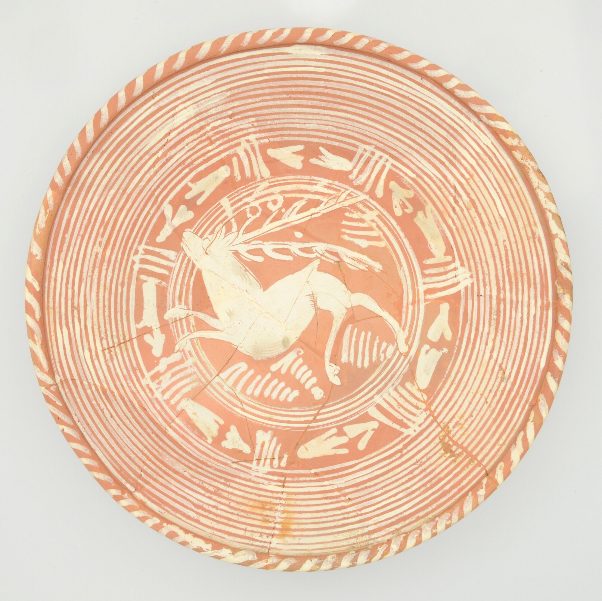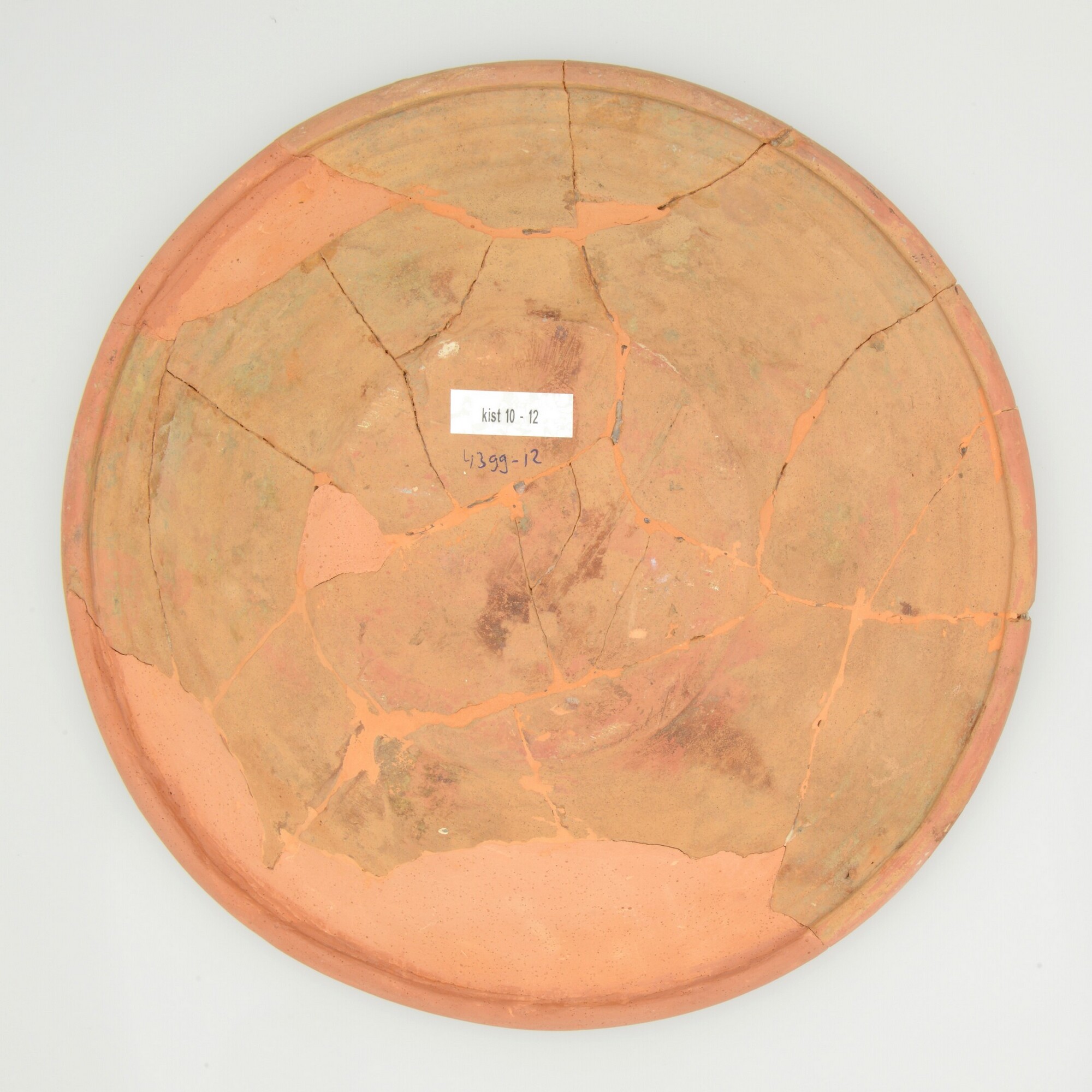 Schotel; wa-bor-1; roodbakkend; halffabricaat, biscuit; slibversiering, slib-krastechniek; vl: concentrische cirkels, ornamentbanden, sp: springend hert en jaartal 1605; standvlak; productieplaats: Enkhuizen