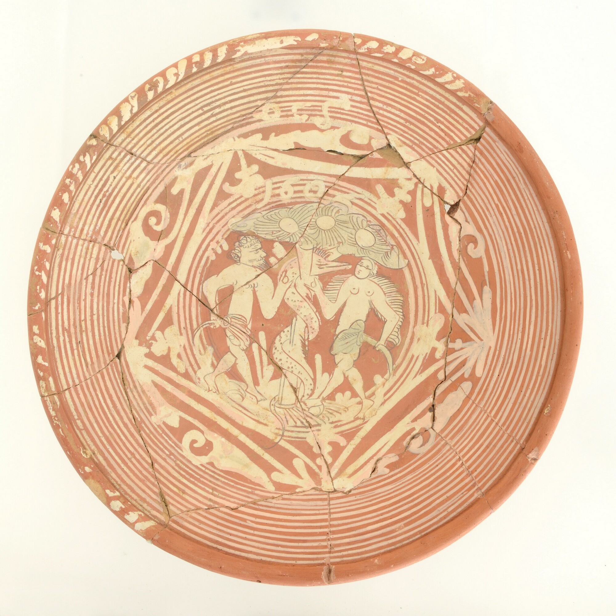 Schotel; wa-bor-1; roodbakkend; slibversiering, slib-krastechniek; loodglazuur, vl: concentrische cirkels, ornamentbanden, sp: adam en Eva, initialen DCS en jaartal 1606; standvlak; productieplaats: Enkhuizen