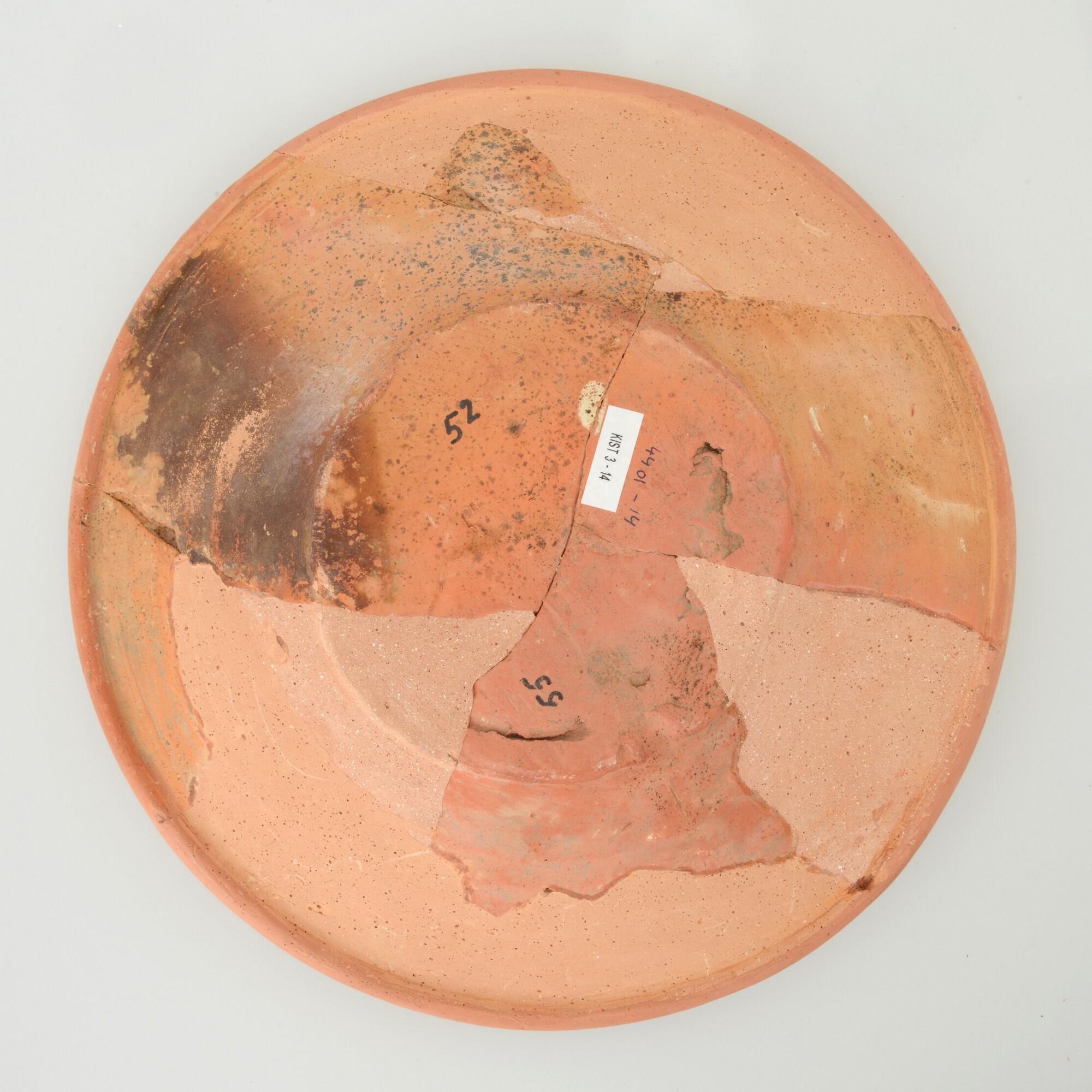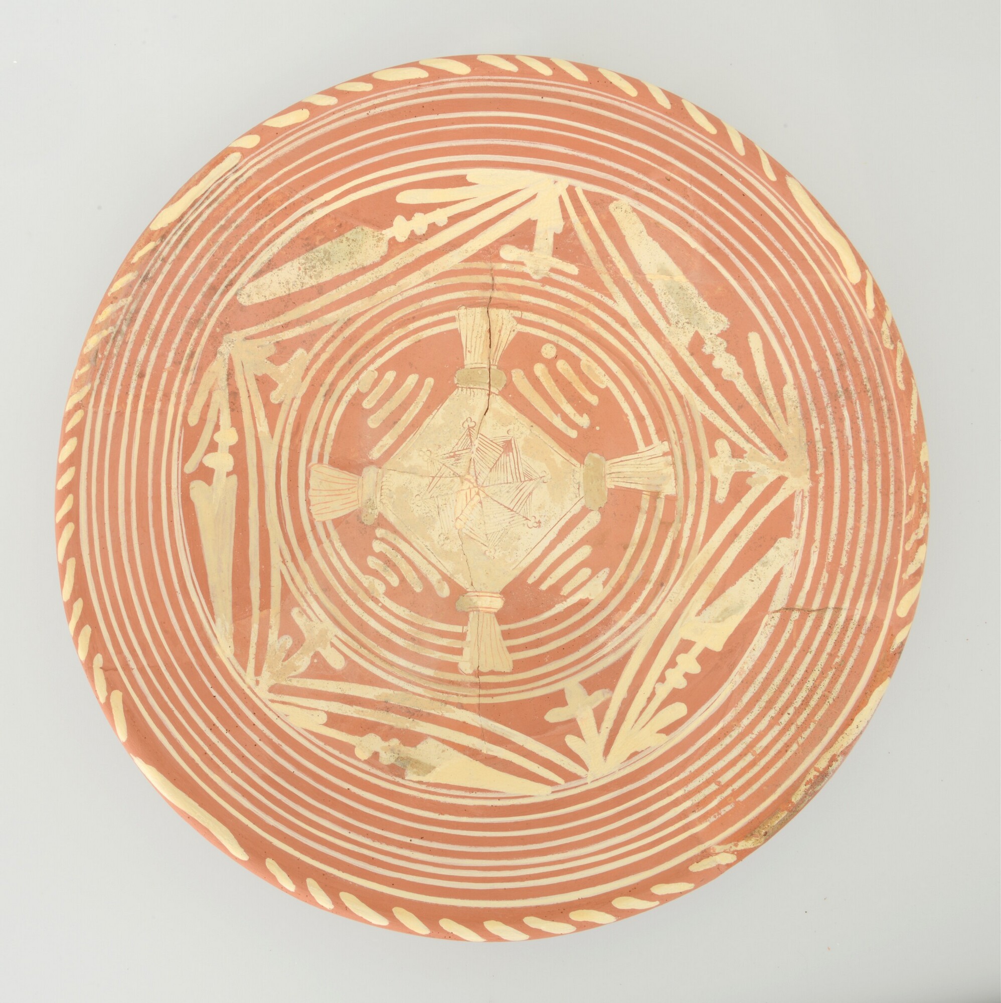 Schotel; wa-bor-1; roodbakkend; halffabricaat, biscuit; slibversiering, slib-krastechniek; vl: concentrische cirkels, ornamentbanden, sp: kussen; standvlak; productieplaats: Enkhuizen