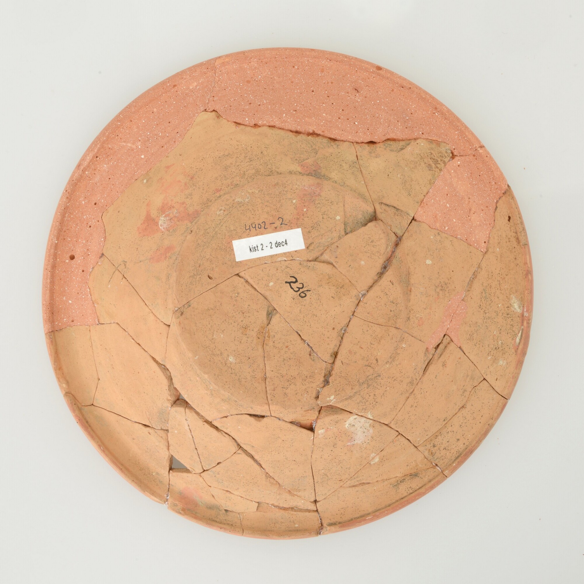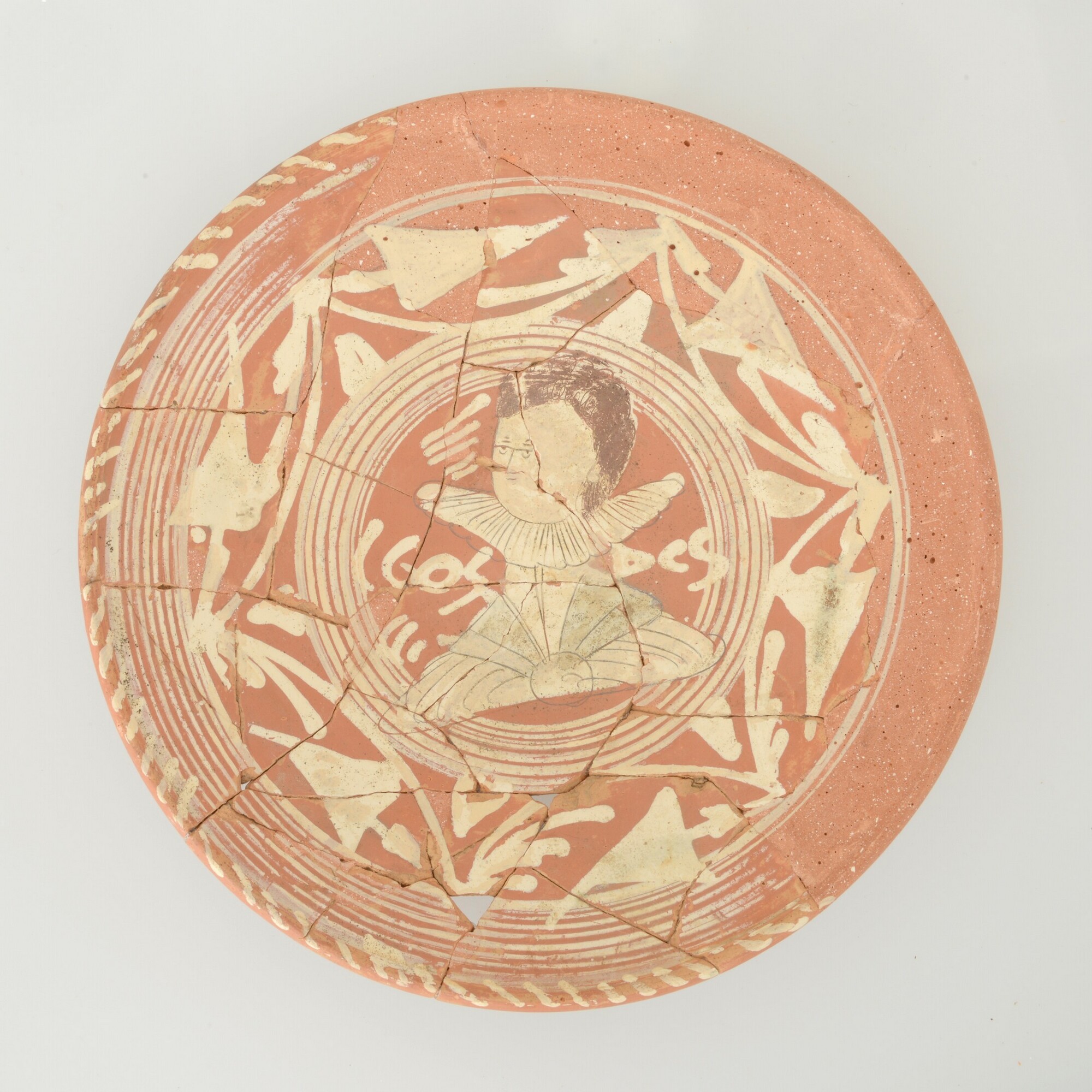 Schotel; wa-bor-1; roodbakkend; halffabricaat, biscuit; slibversiering, slib-krastechniek; vlag: concentrische cirkels, ornamentbanden, spiegel: kop, initialen DCS en jaartal 1605; standvlak; productieplaats: Enkhuizen