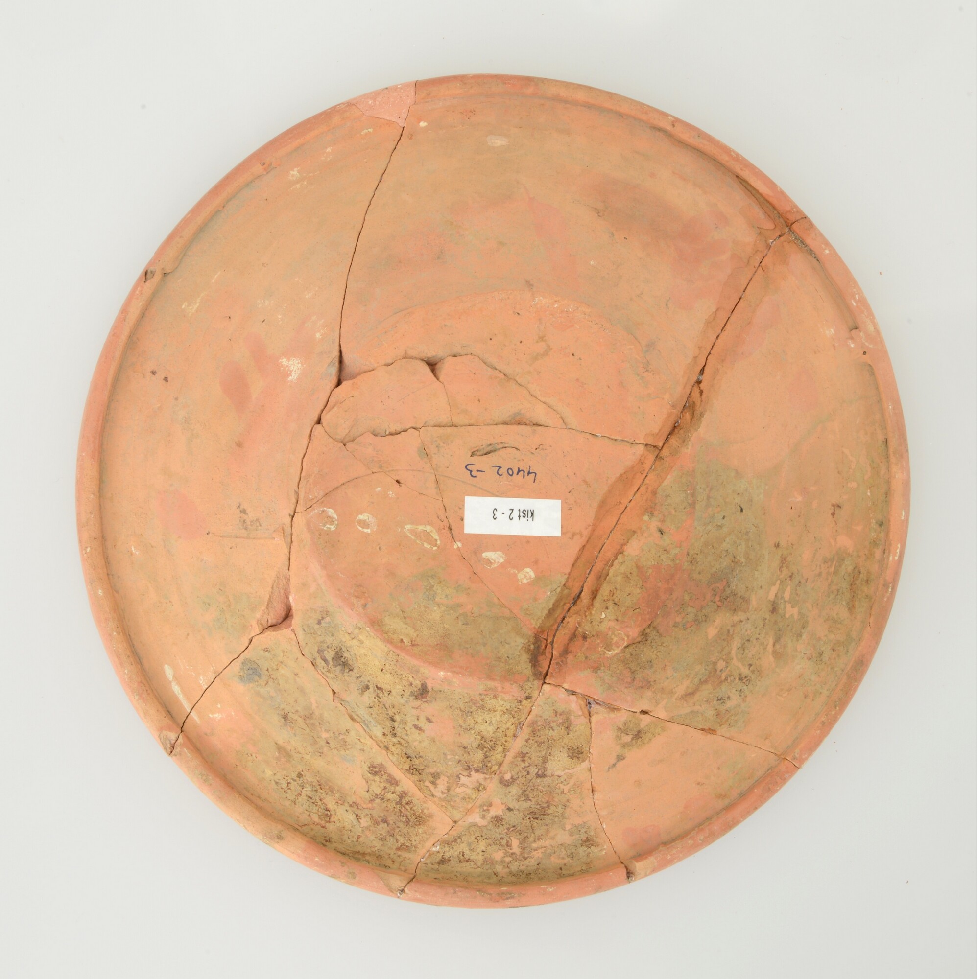 Schotel; wa-bor-1; roodbakkend; halffabricaat, biscuit; slibversiering, slib-krastechniek; vlag: concentrische cirkels, ornamentbanden, spiegel: kussen, initialen DCS en jaartal 1605; standvlak; productieplaats: Enkhuizen
