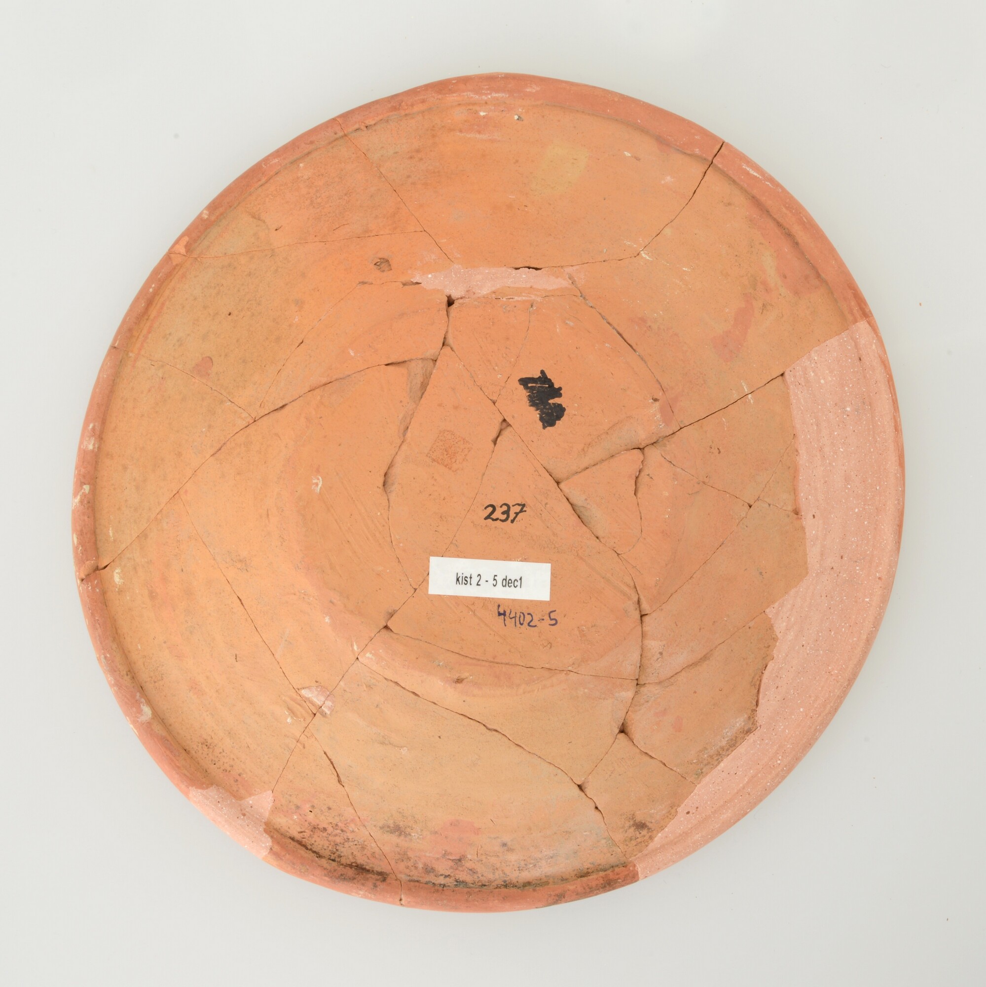 Schotel; wa-bor-1; roodbakkend; halffabricaat, biscuit; slibversiering, slib-krastechniek; vlag: concentrische cirkels, ornamentbanden, spiegel: jongeman met kelkbeker en jaartal 1605; standvlak; productieplaats: Enkhuizen