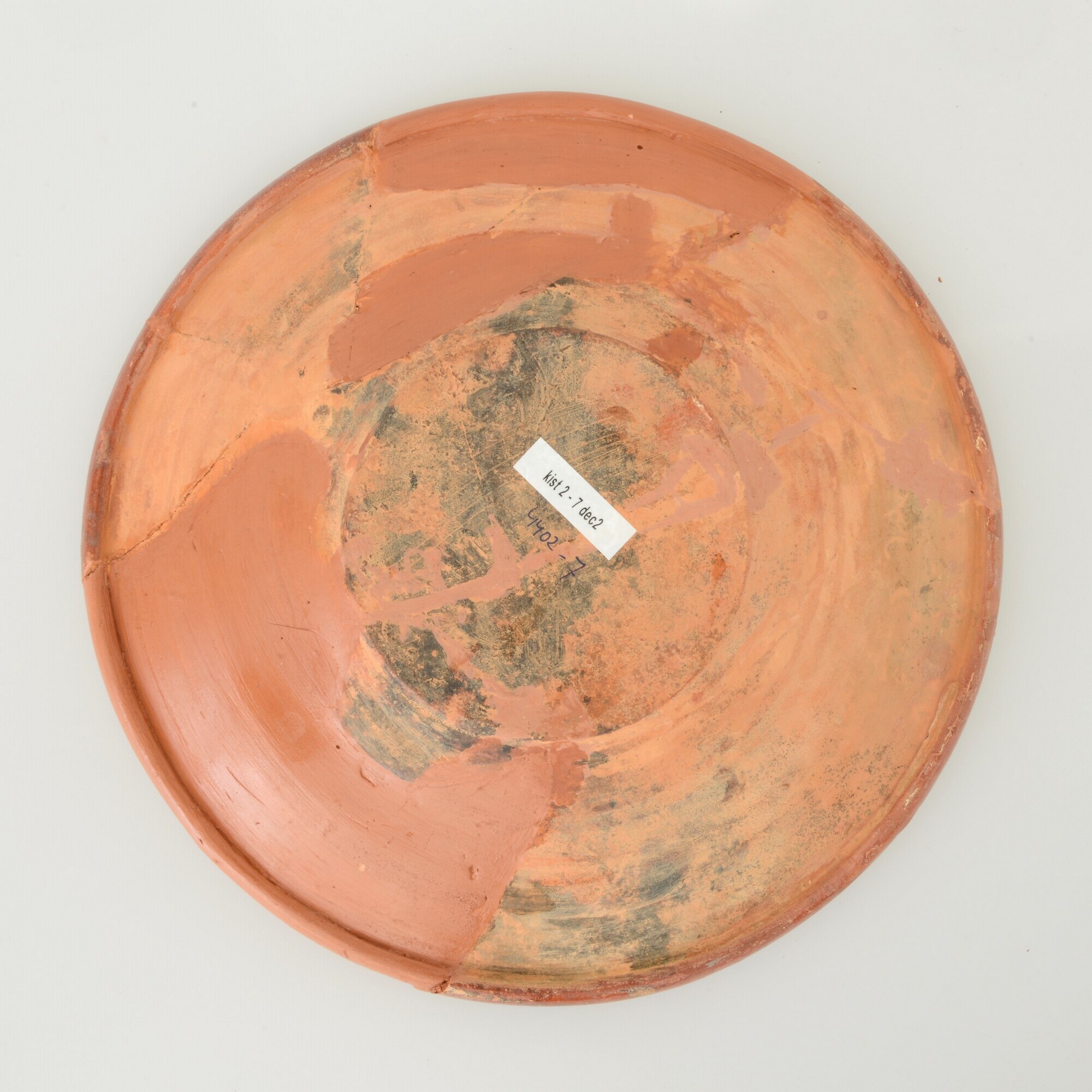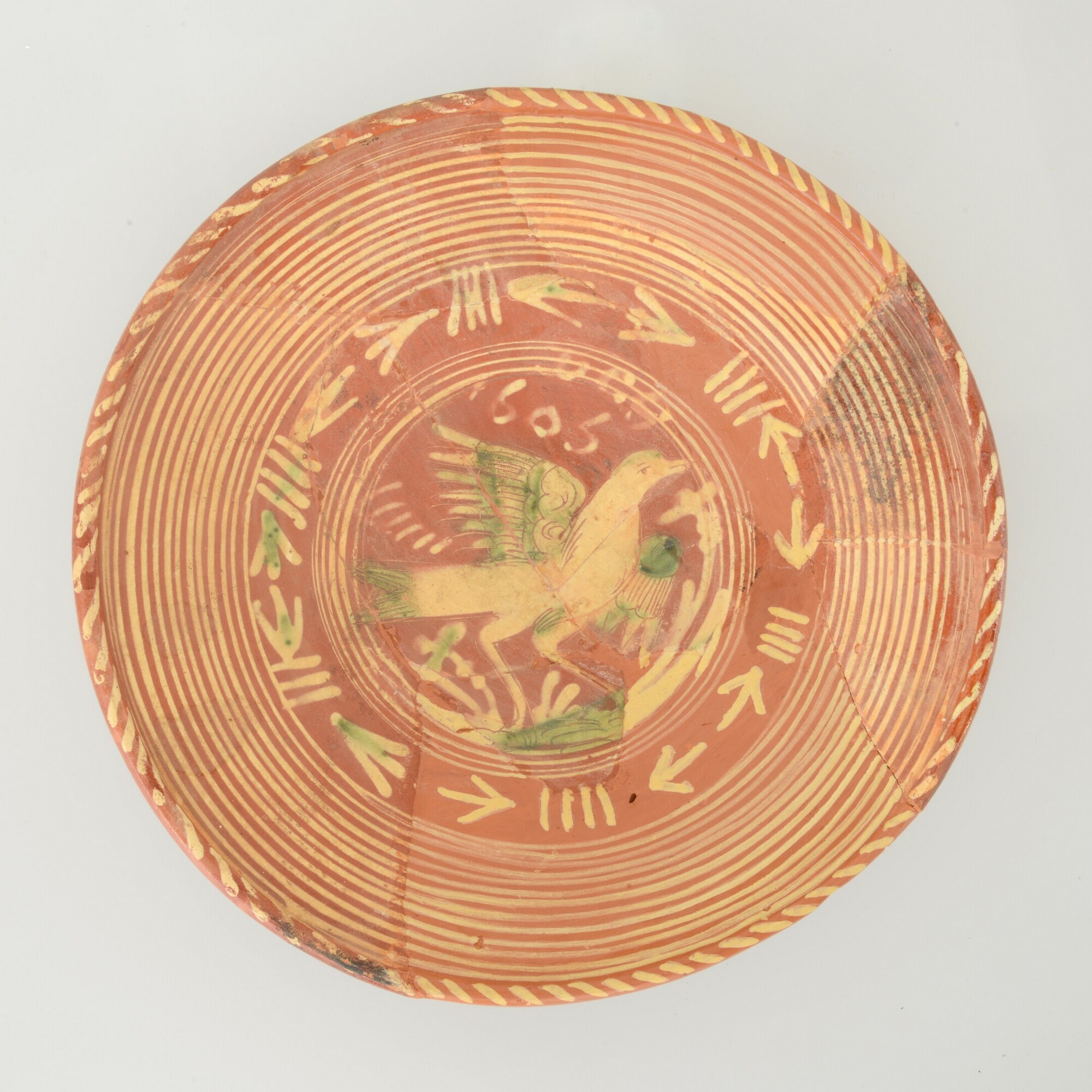 Schotel; wa-bor-1; roodbakkend, loodglazuur, slibversiering; slib-krastechniek; vlag: concentrische cirkels, ornamentbanden, spiegel: vogel met gespreide vleugels, initialen DCS en jaartal 1605; standvlak; productieplaats: Enkhuizen