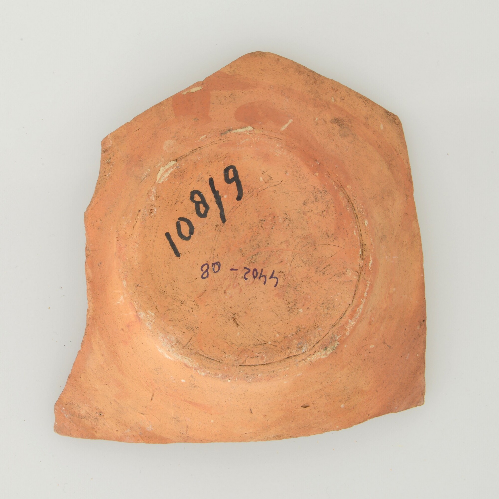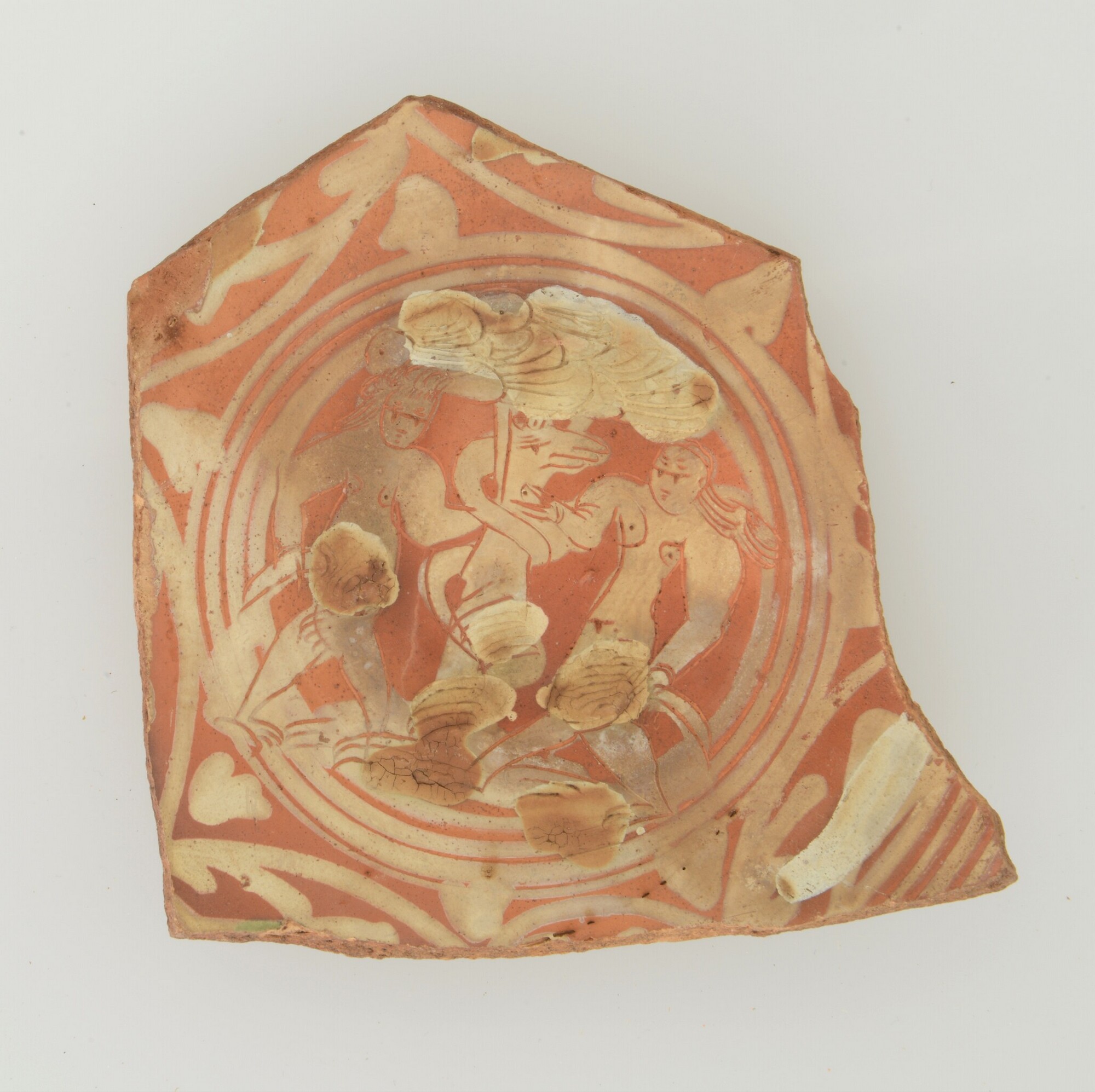 Schotel; wa-bor-1; bodemfragment; roodbakkend; halffabricaat, biscuit; slibversiering, slib-krastechniek; vlag: concentrische cirkels, ornamentbanden, spiegel: Adam en Eva; standvlak; productieplaats: Enkhuizen