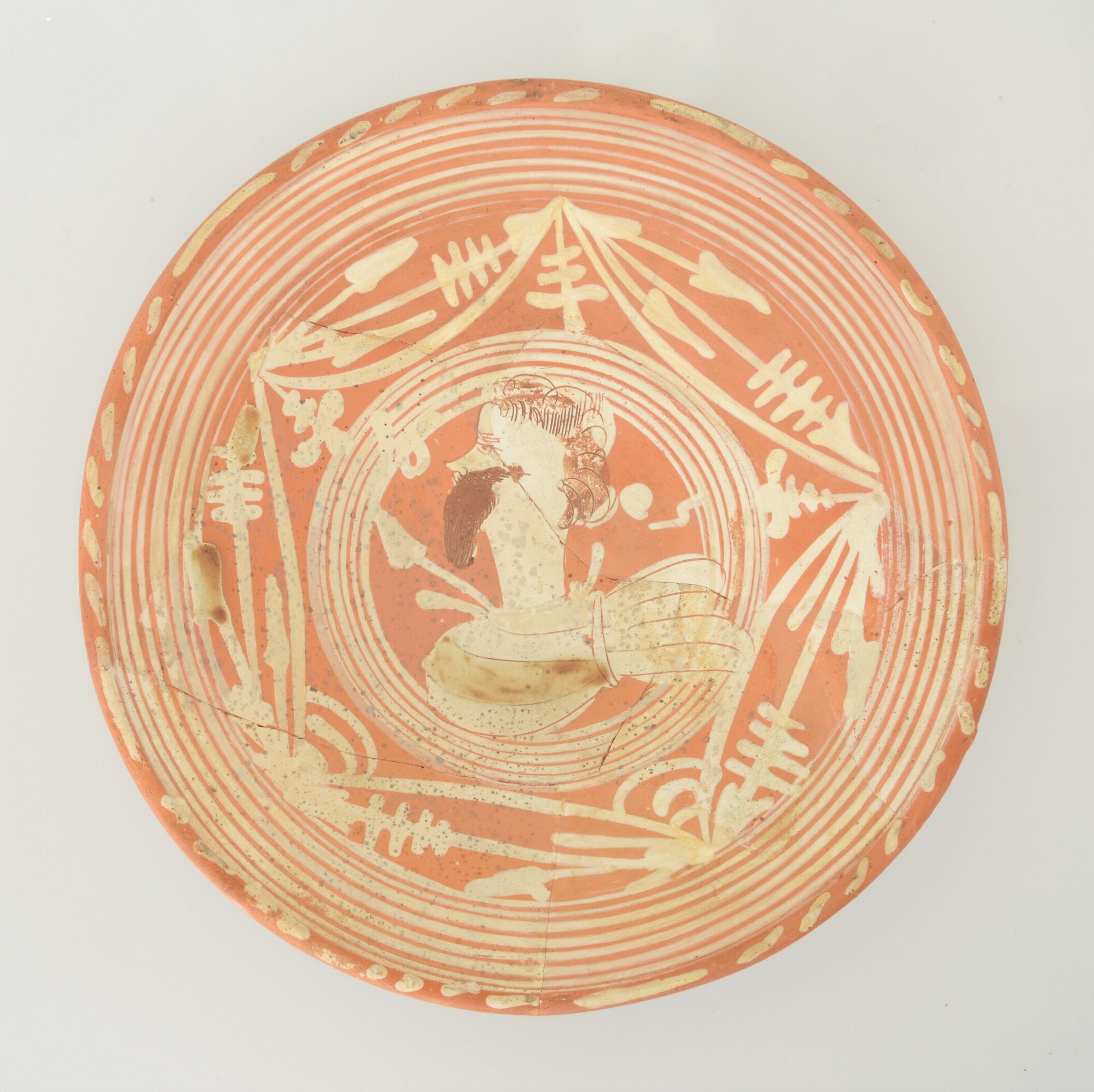 Schotel; wa-bor-1; roodbakkend; halffabricaat, biscuit; slibversiering, slib-krastechniek; vlag: concentrische cirkels, ornamentbanden, spiegel: mannenkop en jaartal 1605; standvlak; productieplaats: Enkhuizen