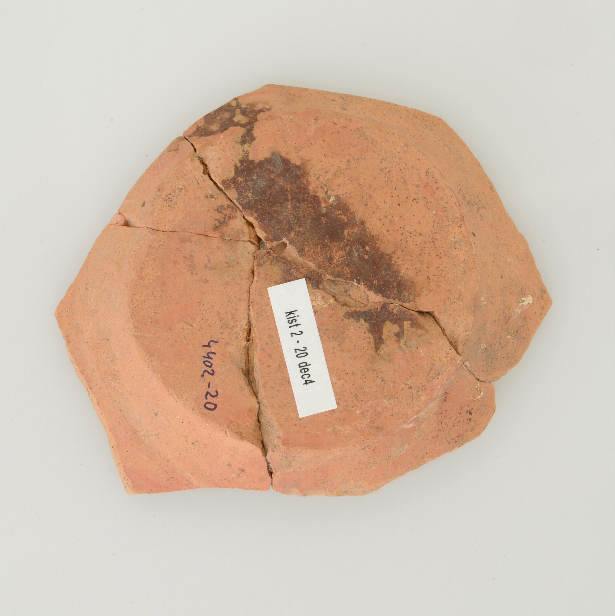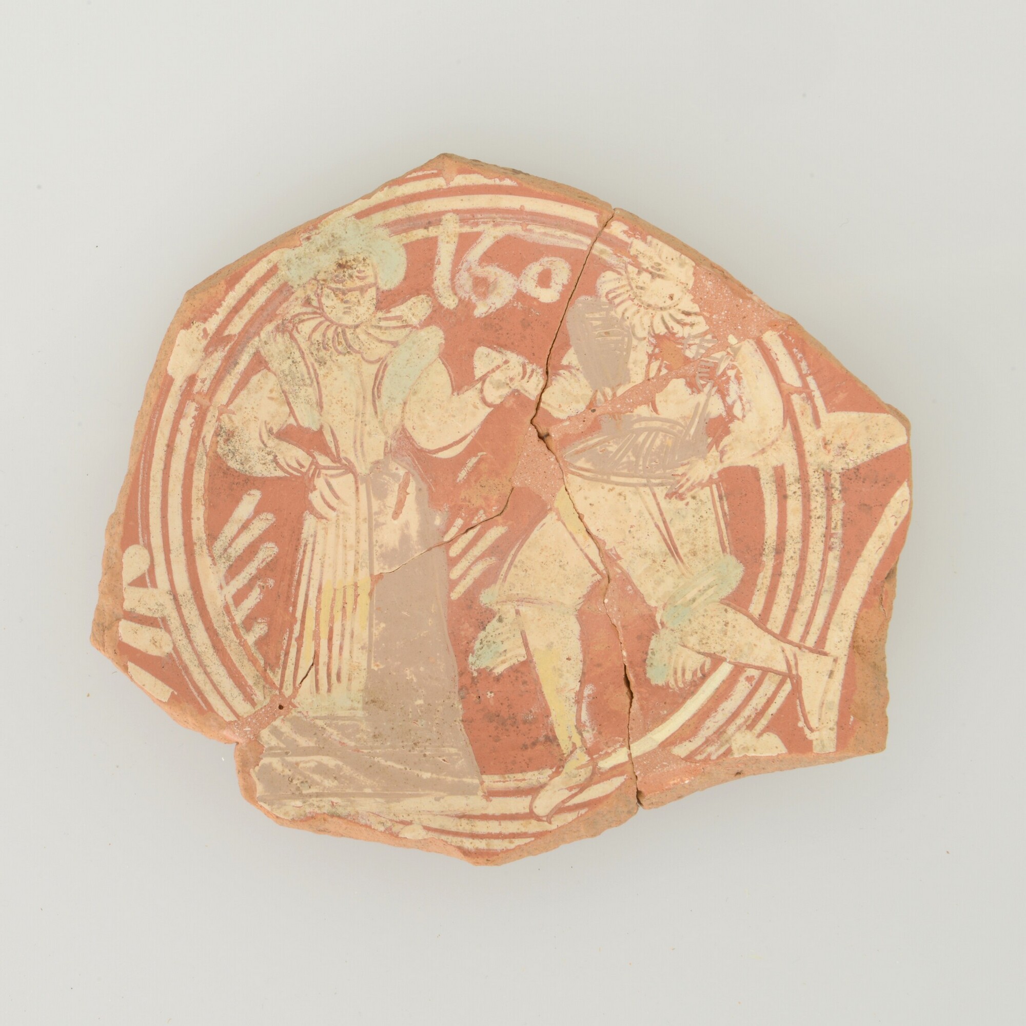 Schotel; wa-bor-1; roodbakkend; halffabricaat, biscuit; slibversiering, slib-krastechniek; vlag: concentrische cirkels, ornamentbanden, spiegel: danspaar en jaartal 1605; standvlak; productieplaats: Enkhuizen