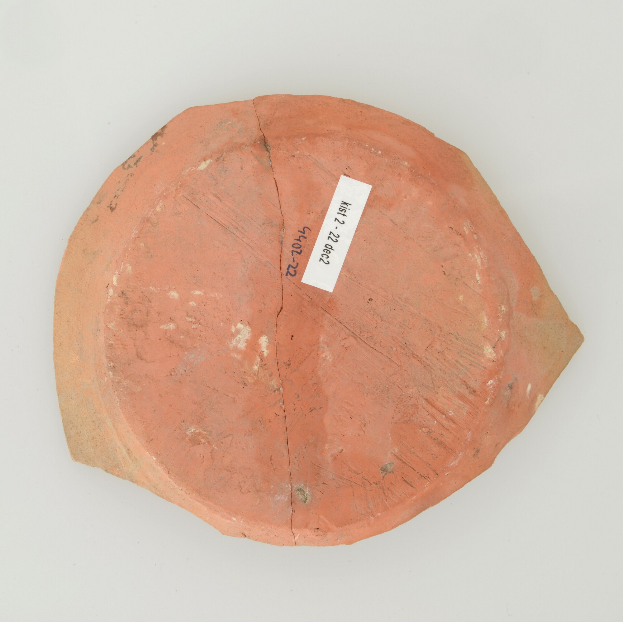 Schotel; wa-bor-1; roodbakkend; halffabricaat, biscuit; slibversiering, slib-krastechniek; vlag: concentrische cirkels, ornamentbanden, spiegel: jongeman met stok jaartal 1605 en initialen DCS; standvlak; productieplaats: Enkhuizen