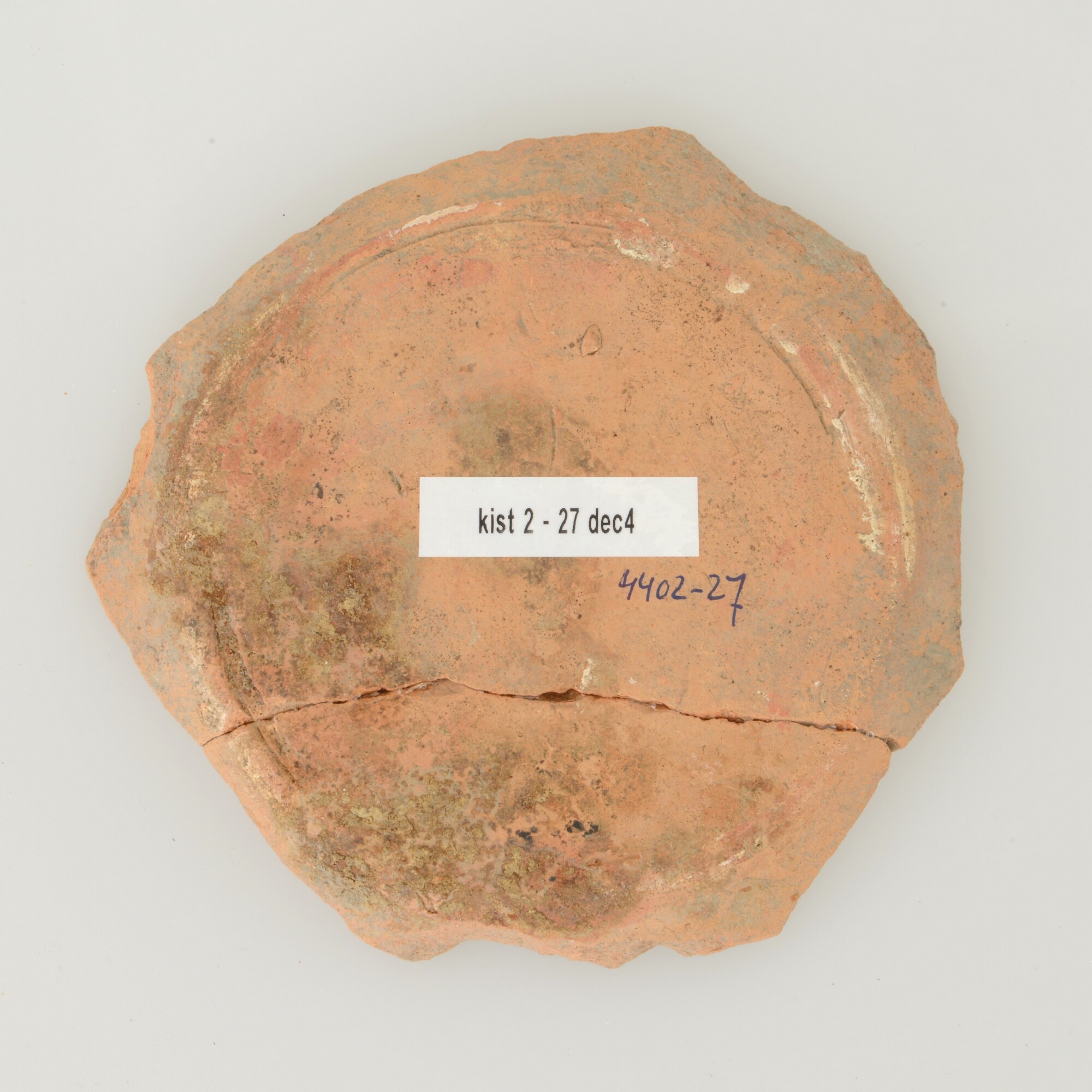 Schotel; wa-bor-1; roodbakkend; halffabricaat, biscuit; slibversiering, slib-krastechniek; vlag: concentrische cirkels, ornamentbanden, spiegel: kop, initialen DCS en jaartal 1605; standvlak; productieplaats: Enkhuizen