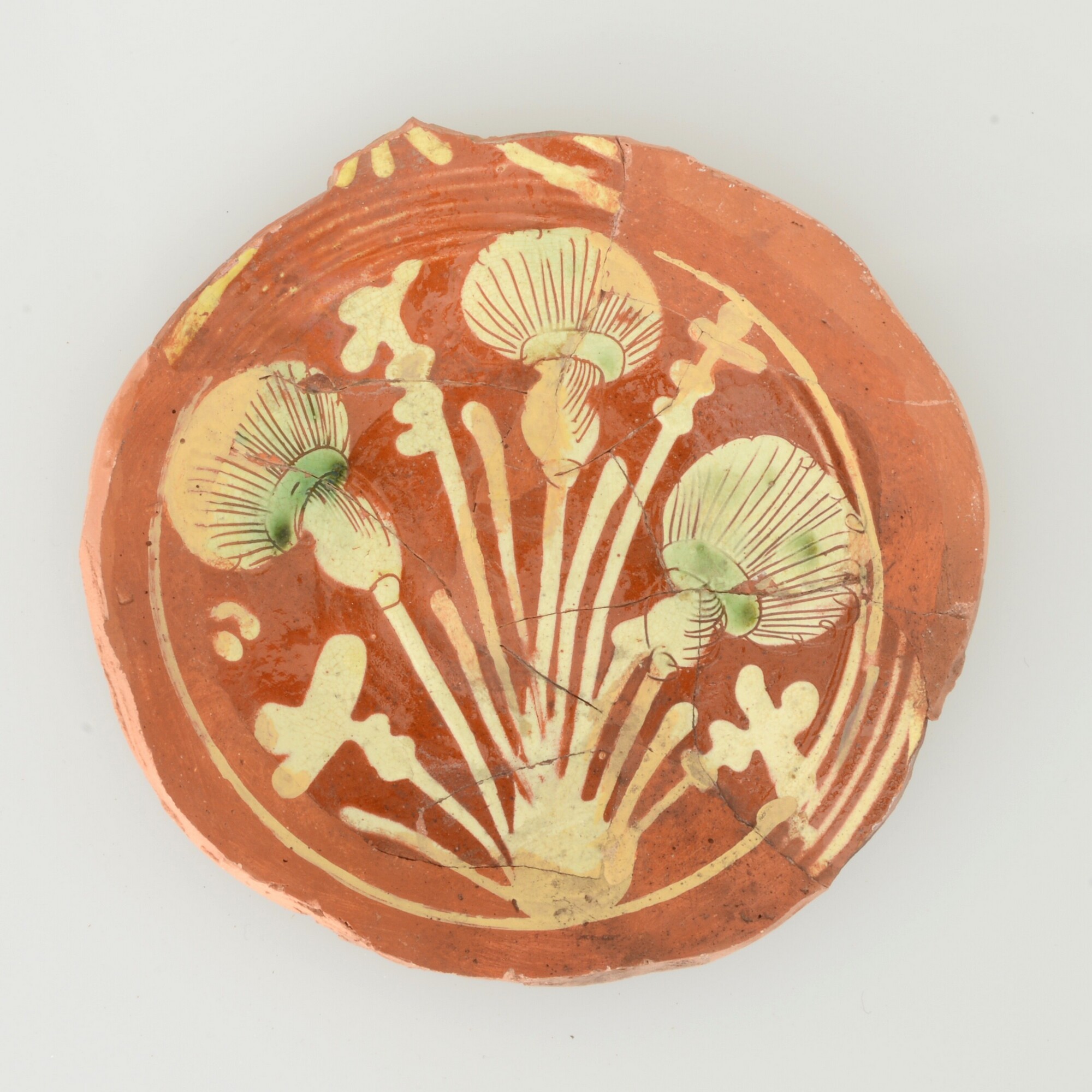 Schotel; wa-bor-1; roodbakkend; loodglazuur; slibversiering, slib-krastechniek; vlag: concentrische cirkels, ornamentbanden, spiegel: drie distelbloemen; standvlak; productieplaats: Enkhuizen