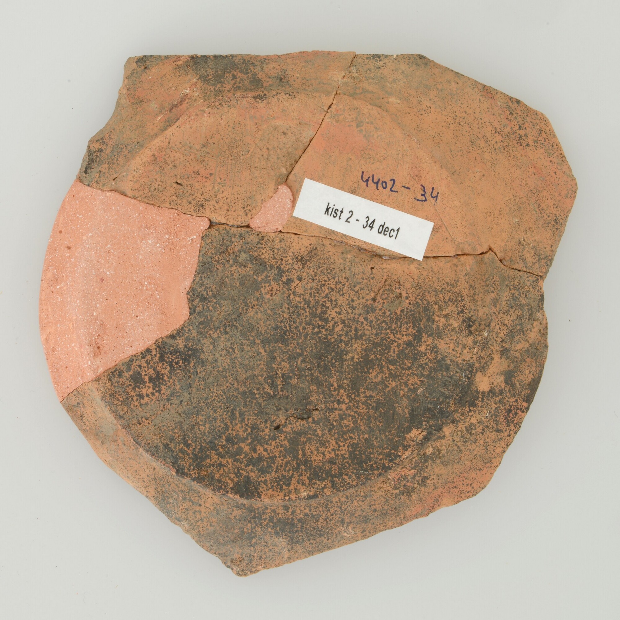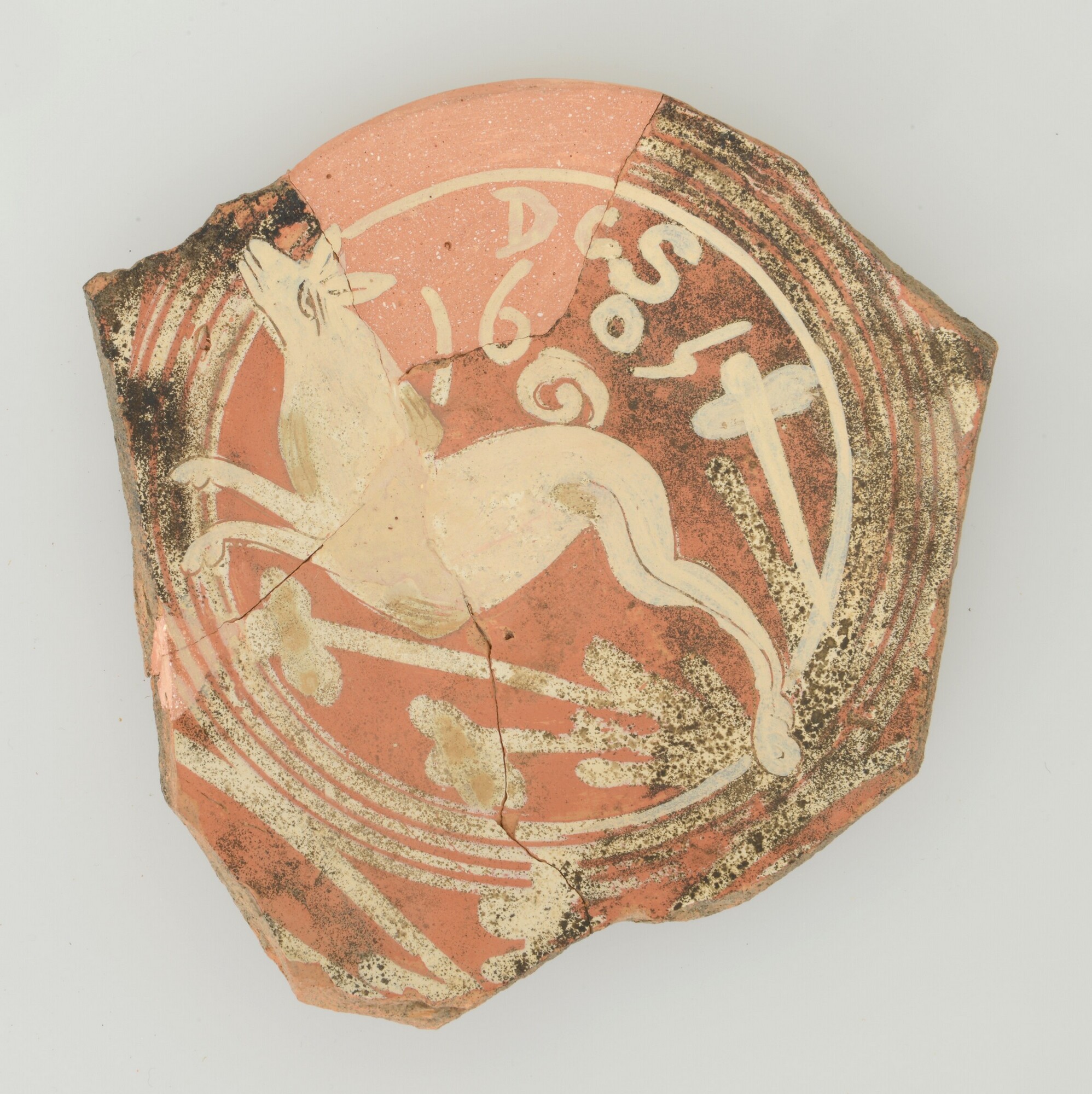 Schotel; wa-bor-1; roodbakkend; halffabricaat, biscuit; slibversiering, slib-krastechniek; vlag: concentrische cirkels, ornamentbanden, spiegel: springender hond, initialen DCS en jaartal 1605; standvlak; productieplaats: Enkhuizen