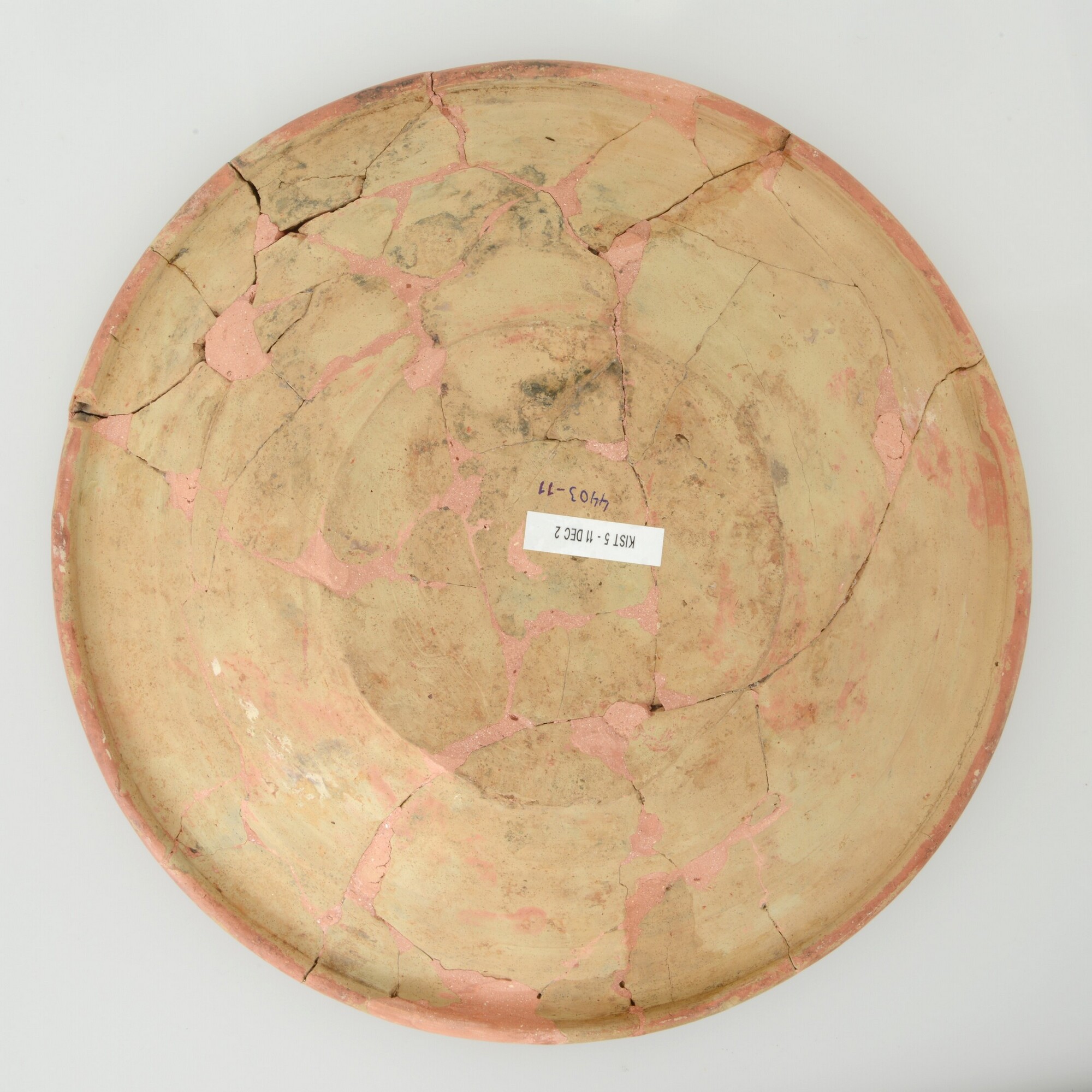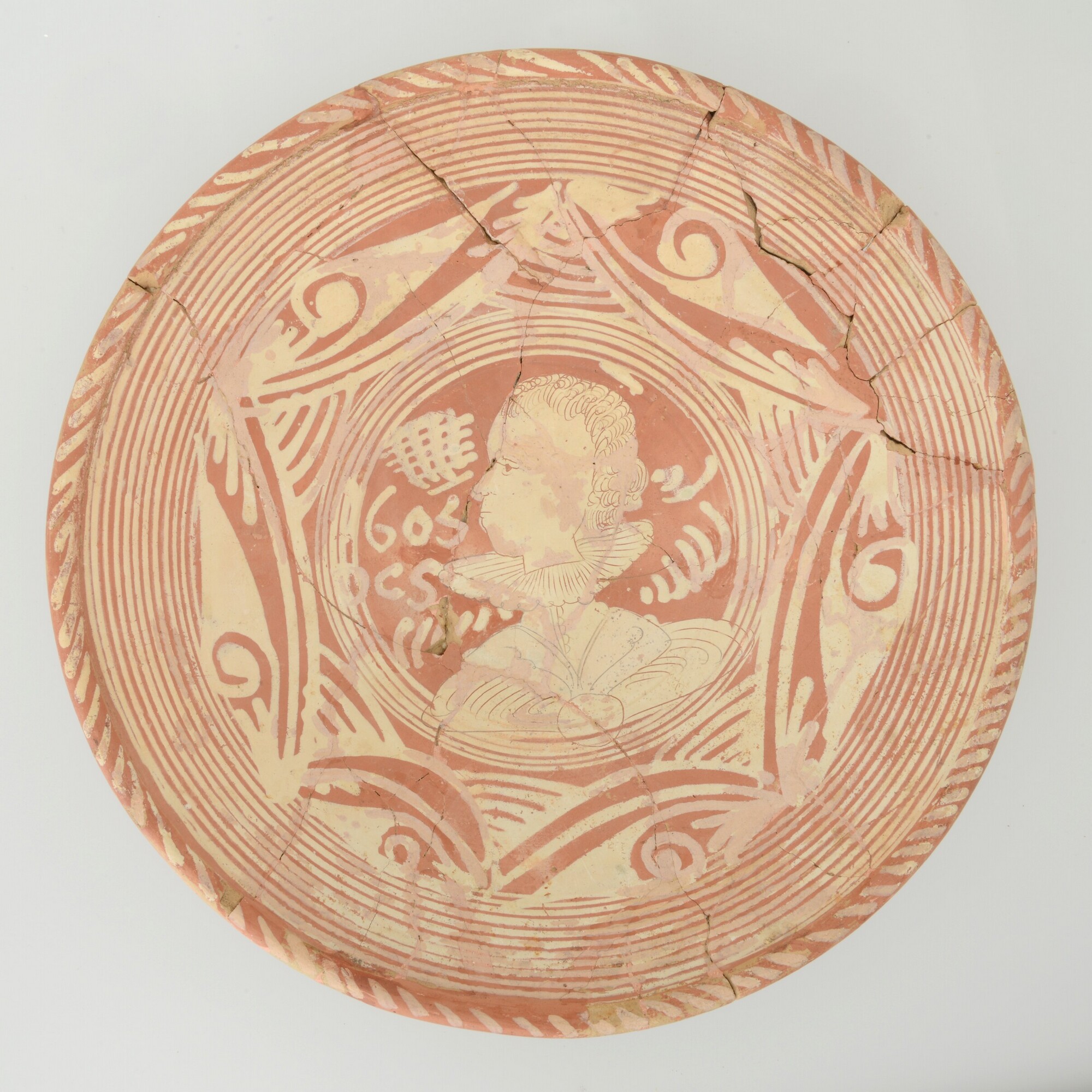 Schotel; wa-bor-1; roodbakkend; halffabricaat, biscuit; slibversiering, slib-krastechniek; vl: concentrische cirkels, ornamentbanden, sp: Vrouwenkop (?), initialen DCS en jaartal 1605; standvlak; productieplaats: Enkhuizen