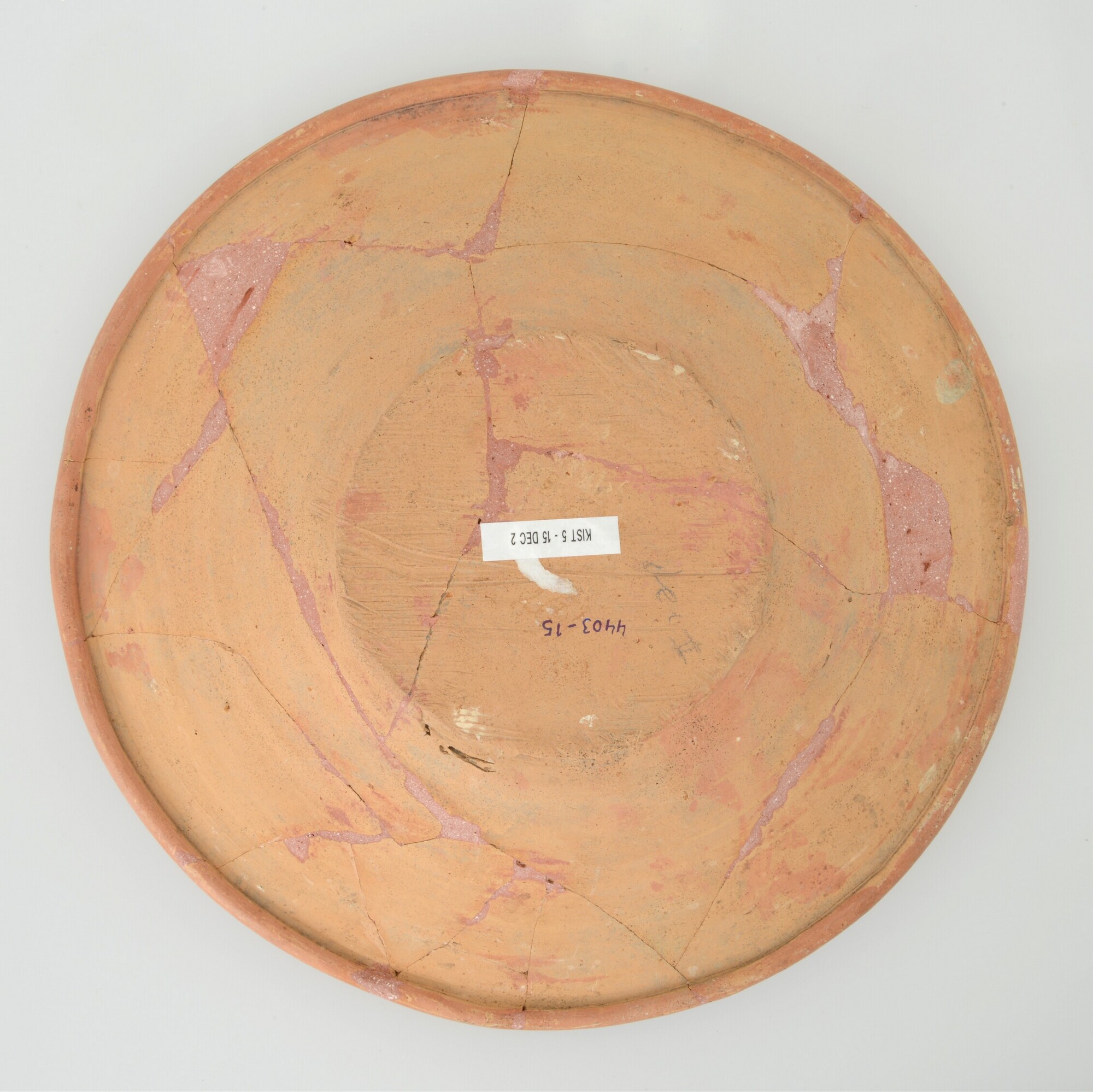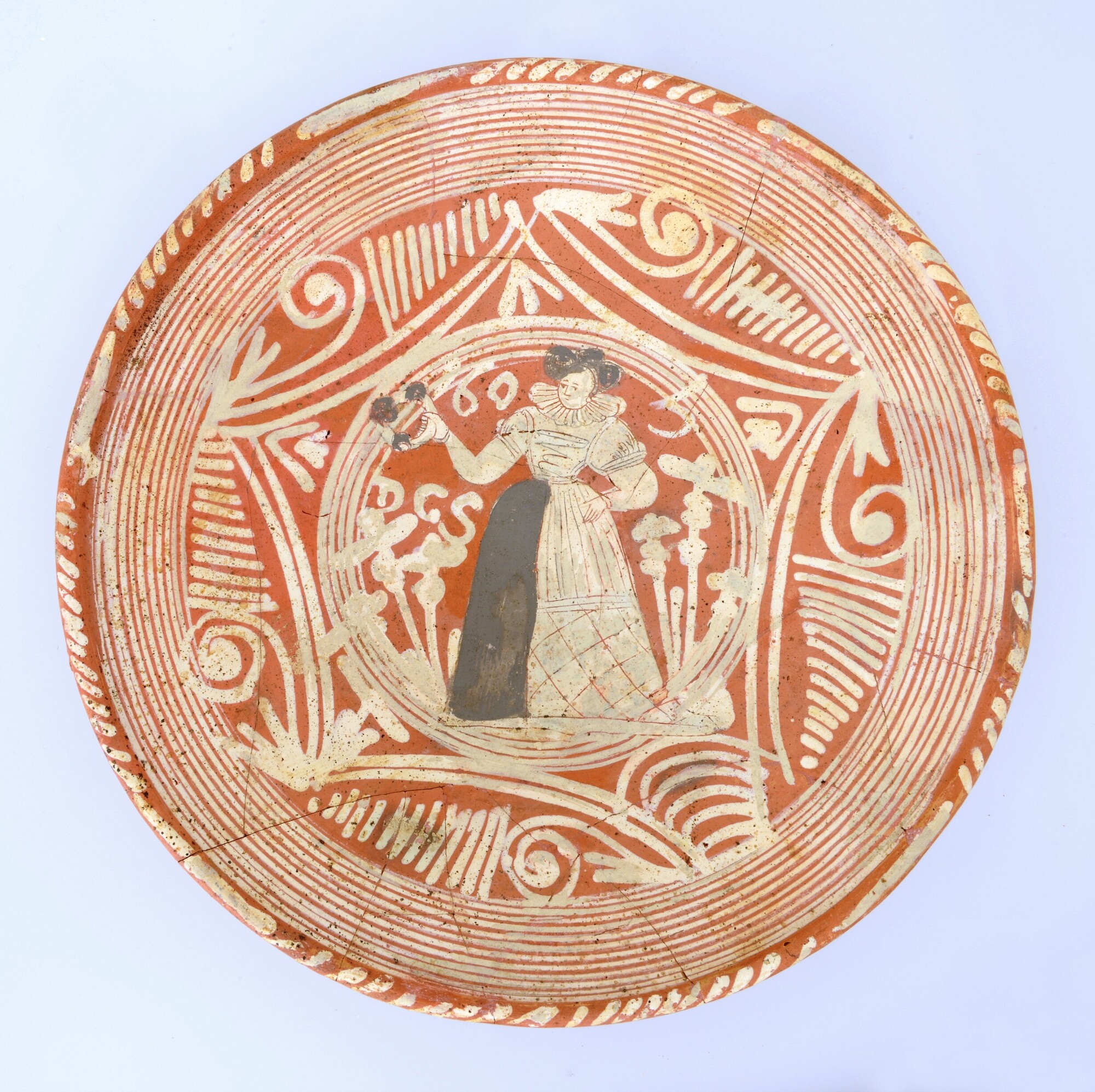 Schotel; wa-bor-1; roodbakkend; halffabricaat, biscuit; slibversiering, slib-krastechniek; sp: dame met krans of tamboerijn, initialen DCS en jaartal 1605; standvlak; productieplaats: Enkhuizen