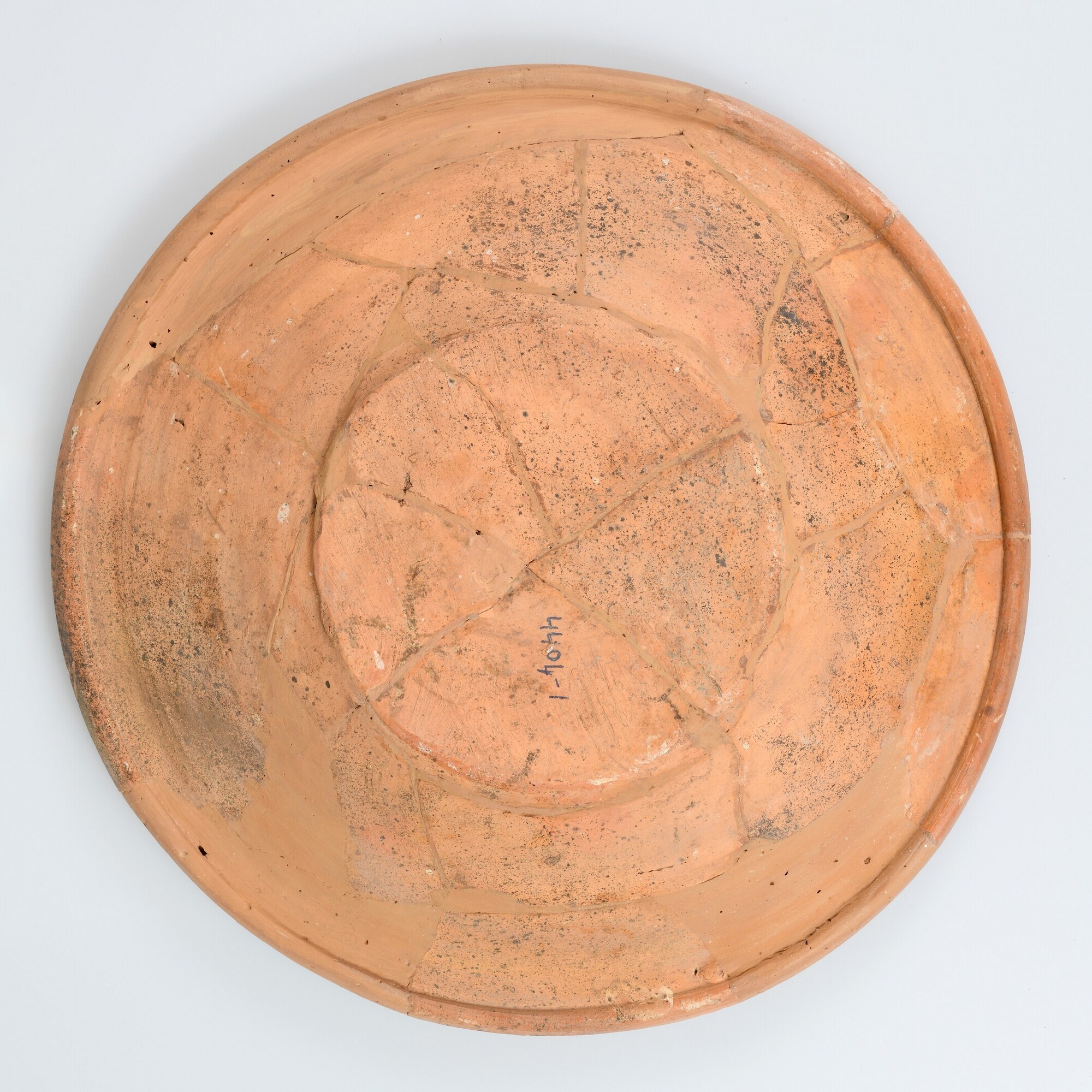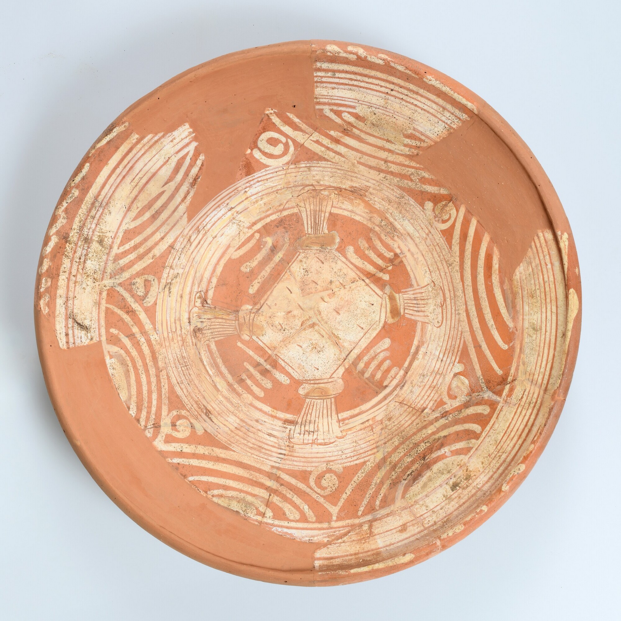 Schotel; wa-bor-1; roodbakkend; halffabricaat, biscuit; slibversiering, slib-krastechniek; vl: concentrische cirkels, ornamentbanden, sp: kussen; standvlak; productieplaats: Enkhuizen