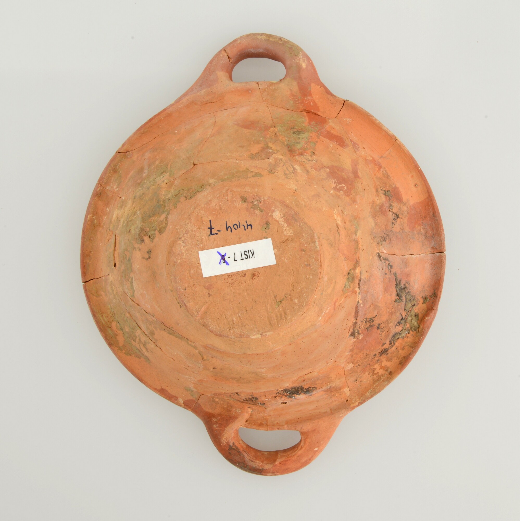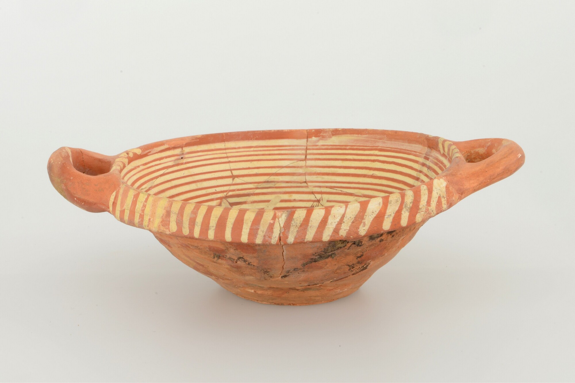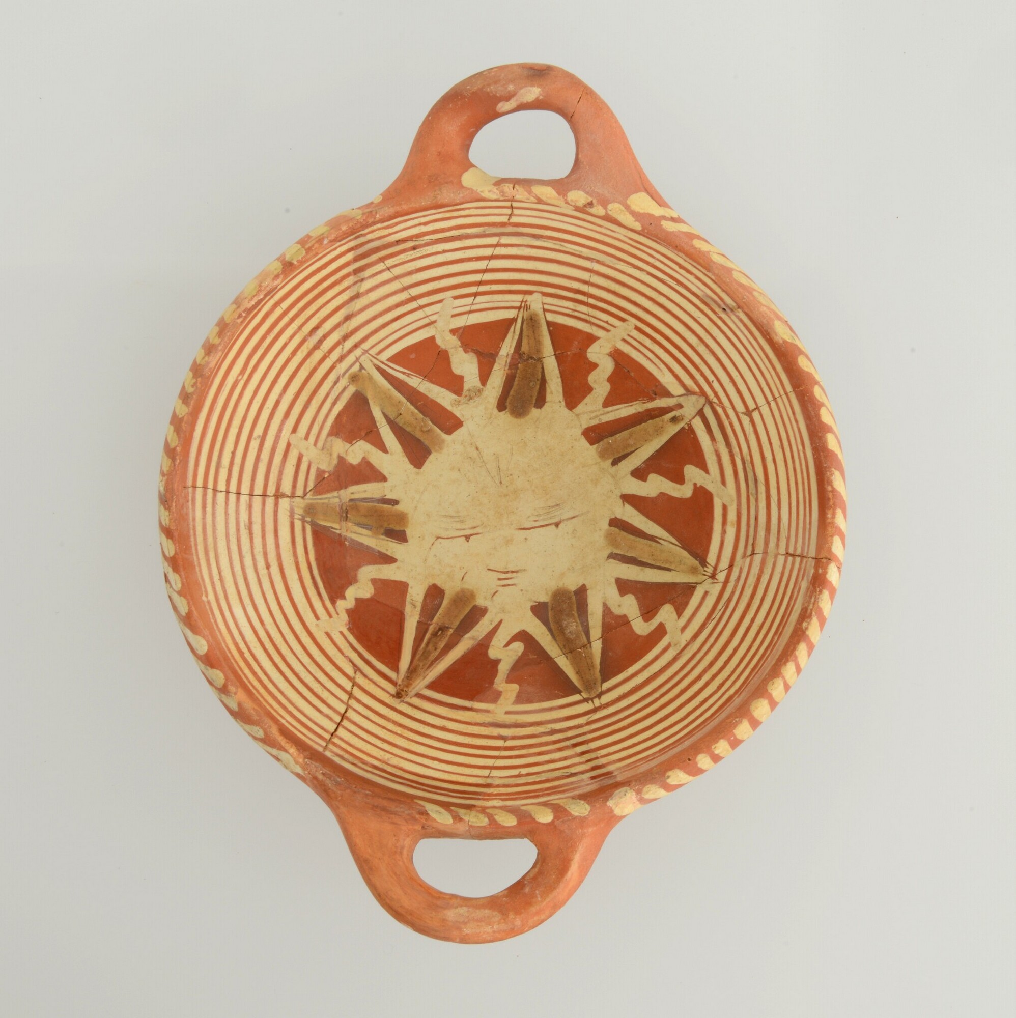 Kom; wa-kom-1; roodbakkend; loodglazuur; slibversiering, slib-krastechniek; vl: concentrische cirkels, ornamentbanden, sp: zevenpuntige zon; standvlak; twee horizontale worstoren; productieplaats: Enkhuizen