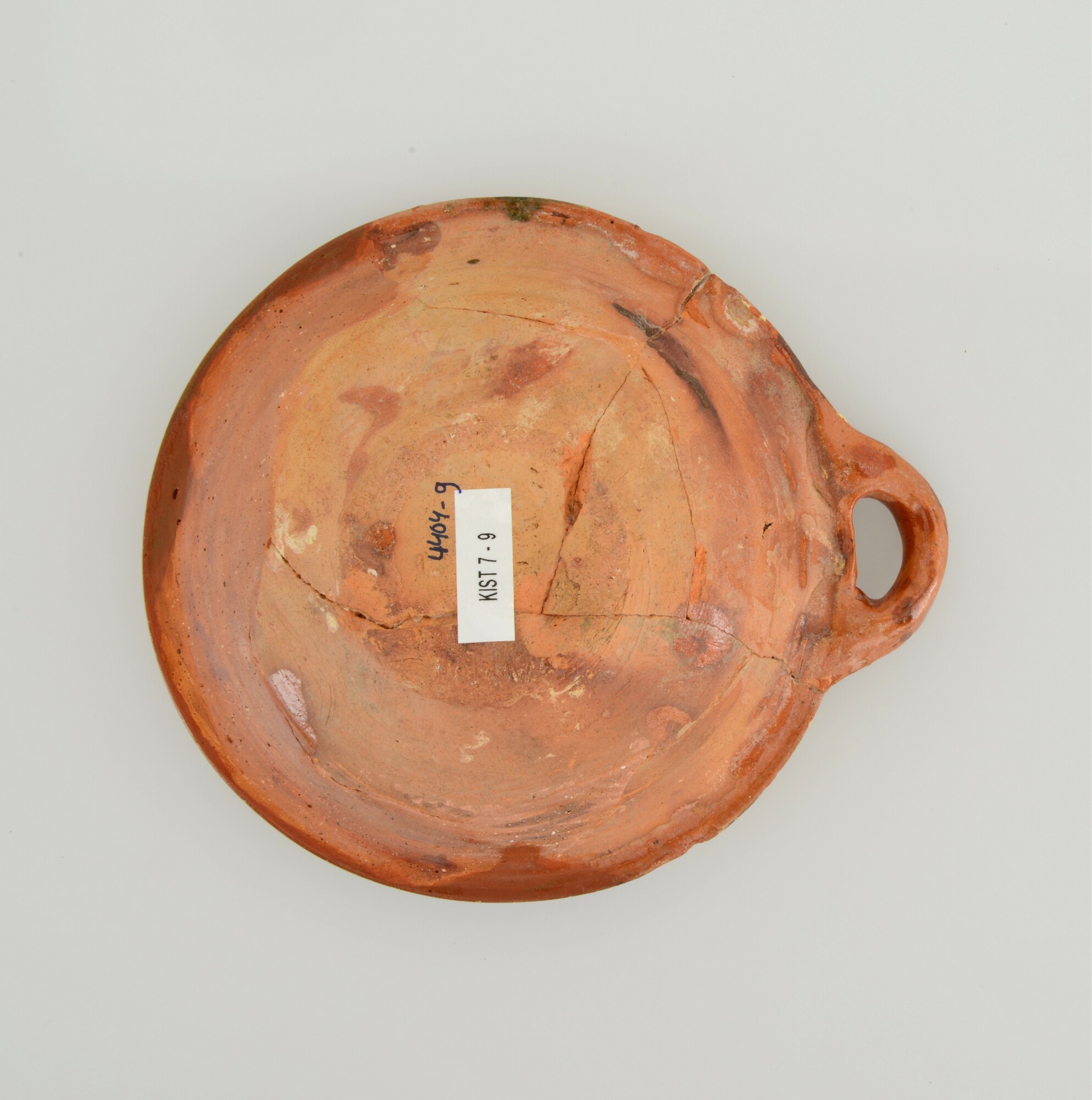 Kom; wa-kom-1; roodbakkend; loodglazuur; slibversiering, slib-krastechniek;vl: concentrische cirkels, ornamentbanden, sp: kussen; standvlak; één horizontaal worstoor; productieplaats: Enkhuizen