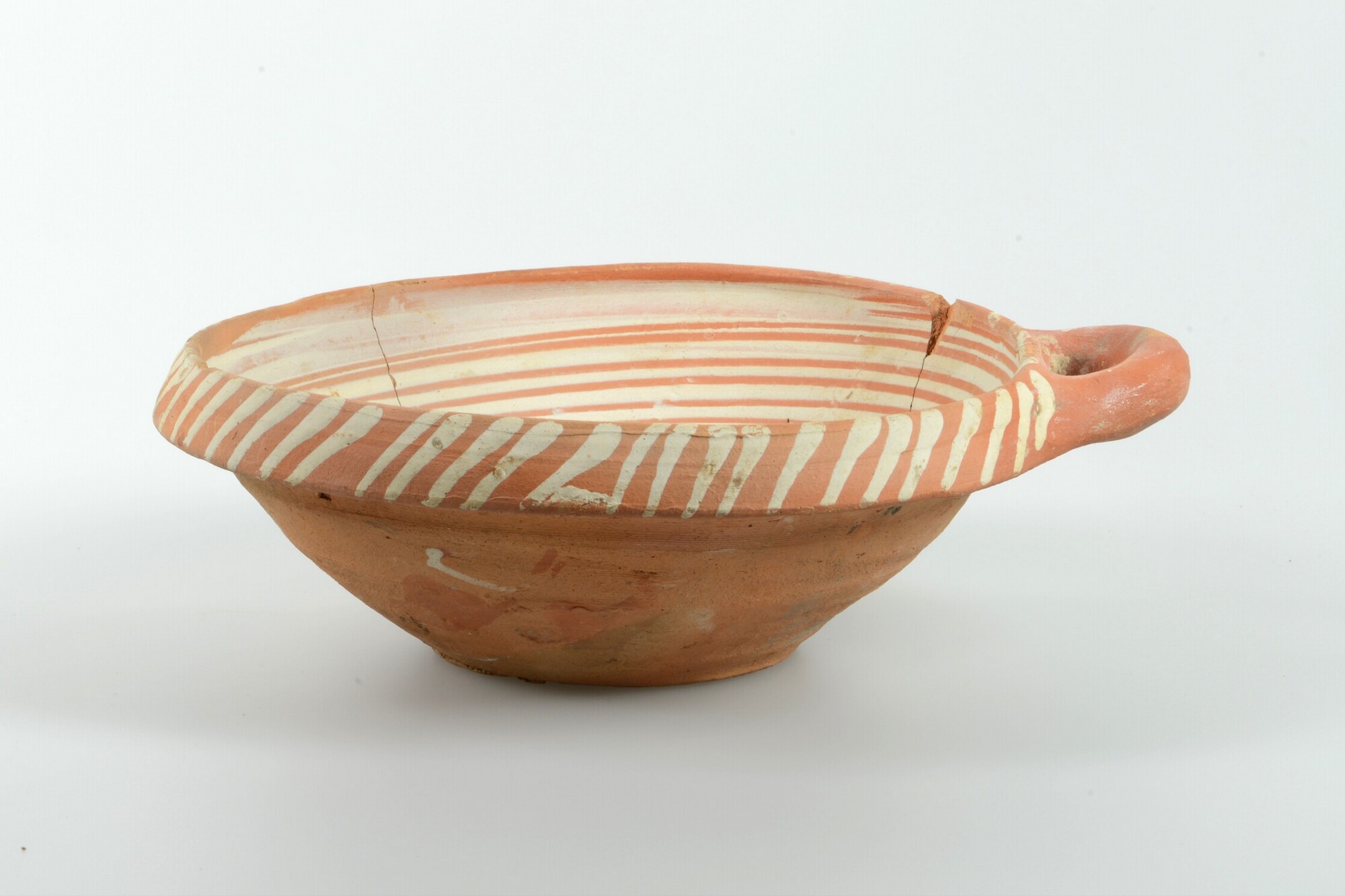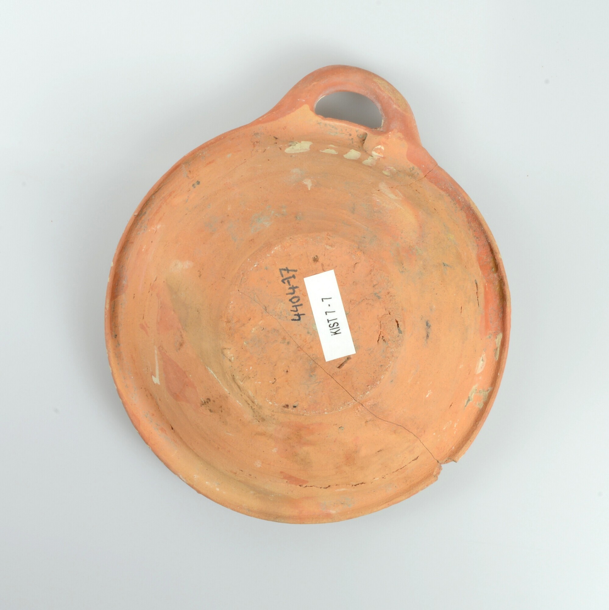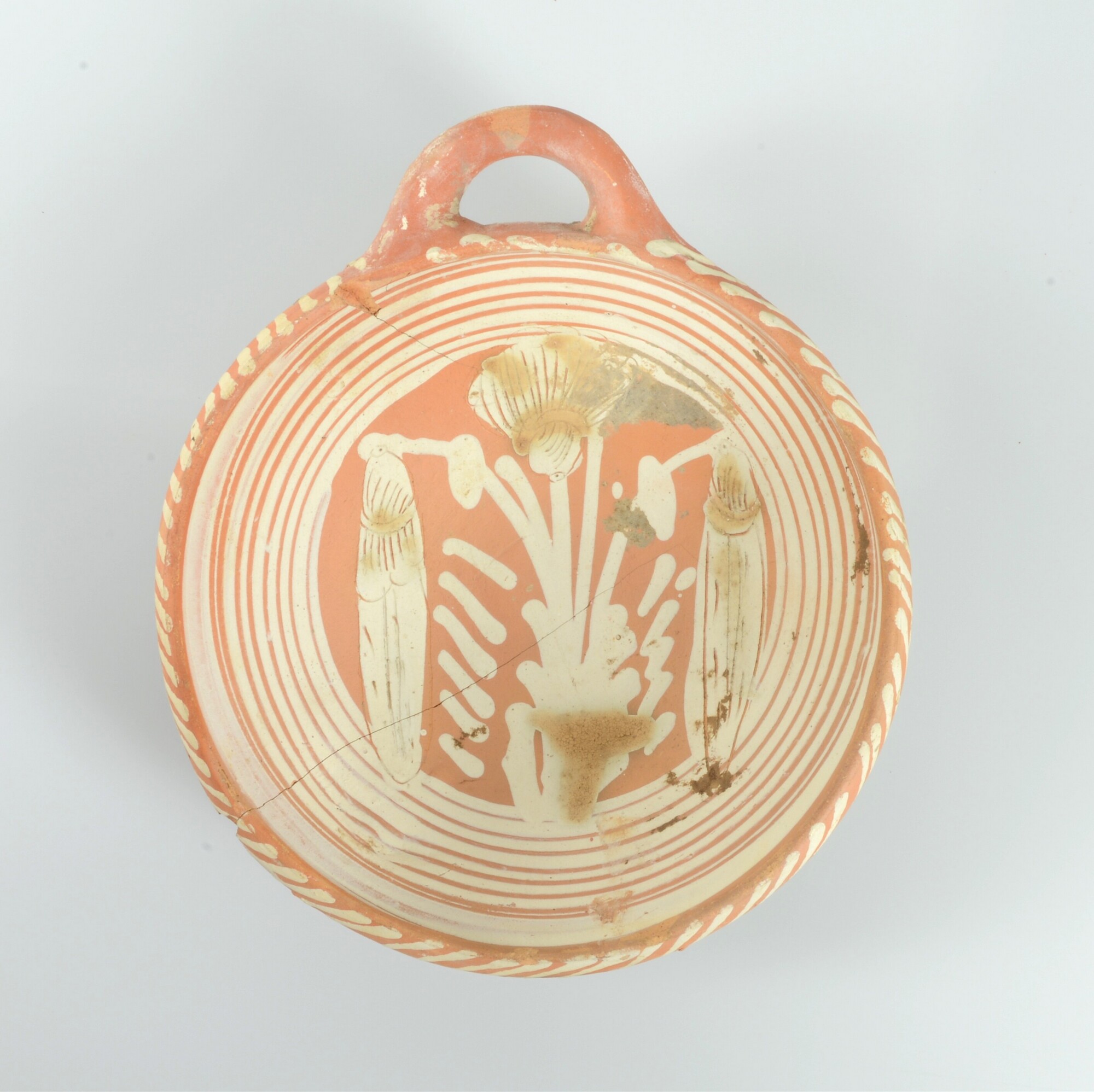 Kom; wa-kom-1; roodbakkend; halffabricaat, biscuit; slibversiering, slib-krastechniek; vl: concentrische cirkels, ornamentbanden, sp: twee peulen met distel; standvlak; één horizontaal worstoor; productieplaats: Enkhuizen