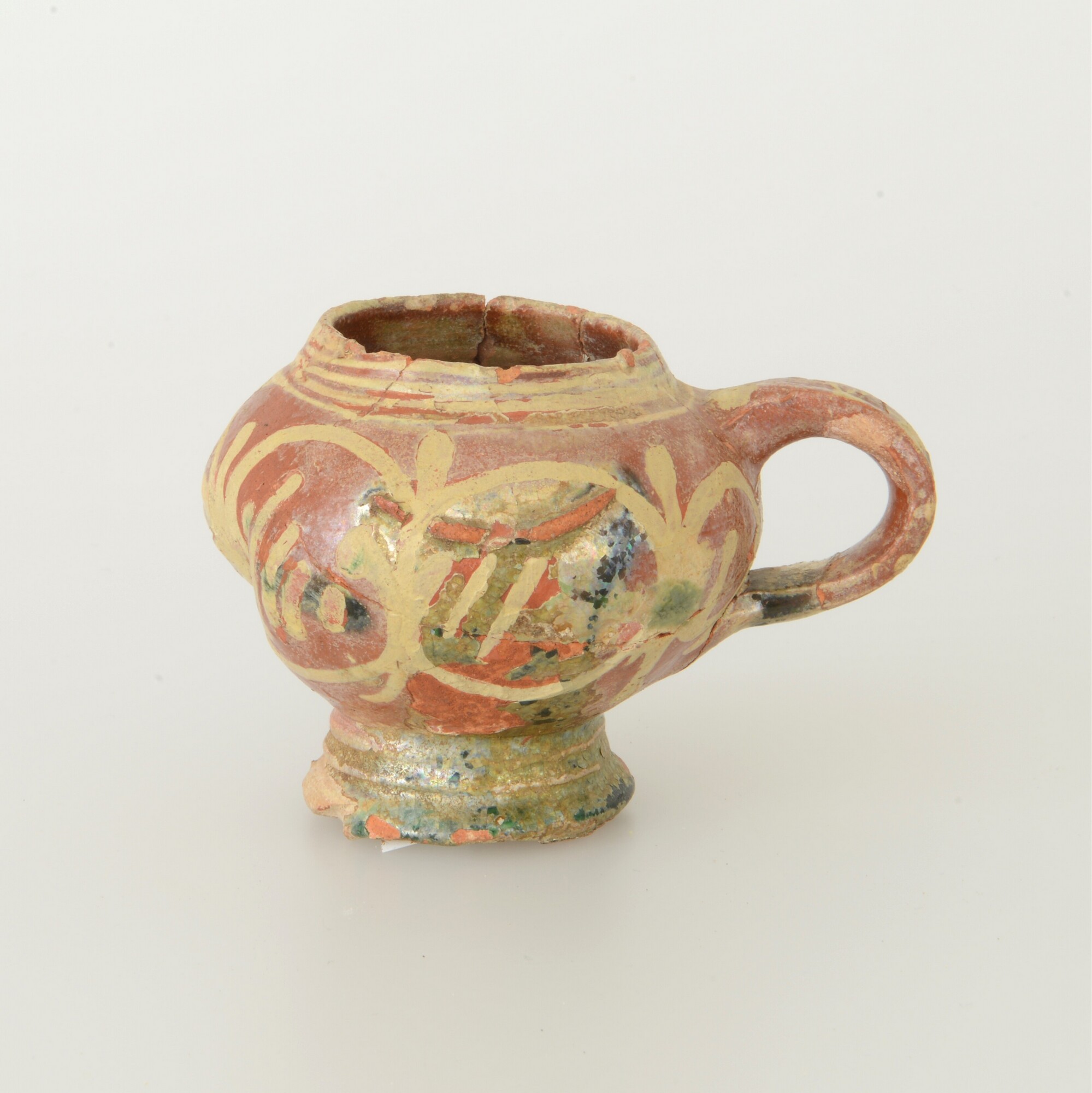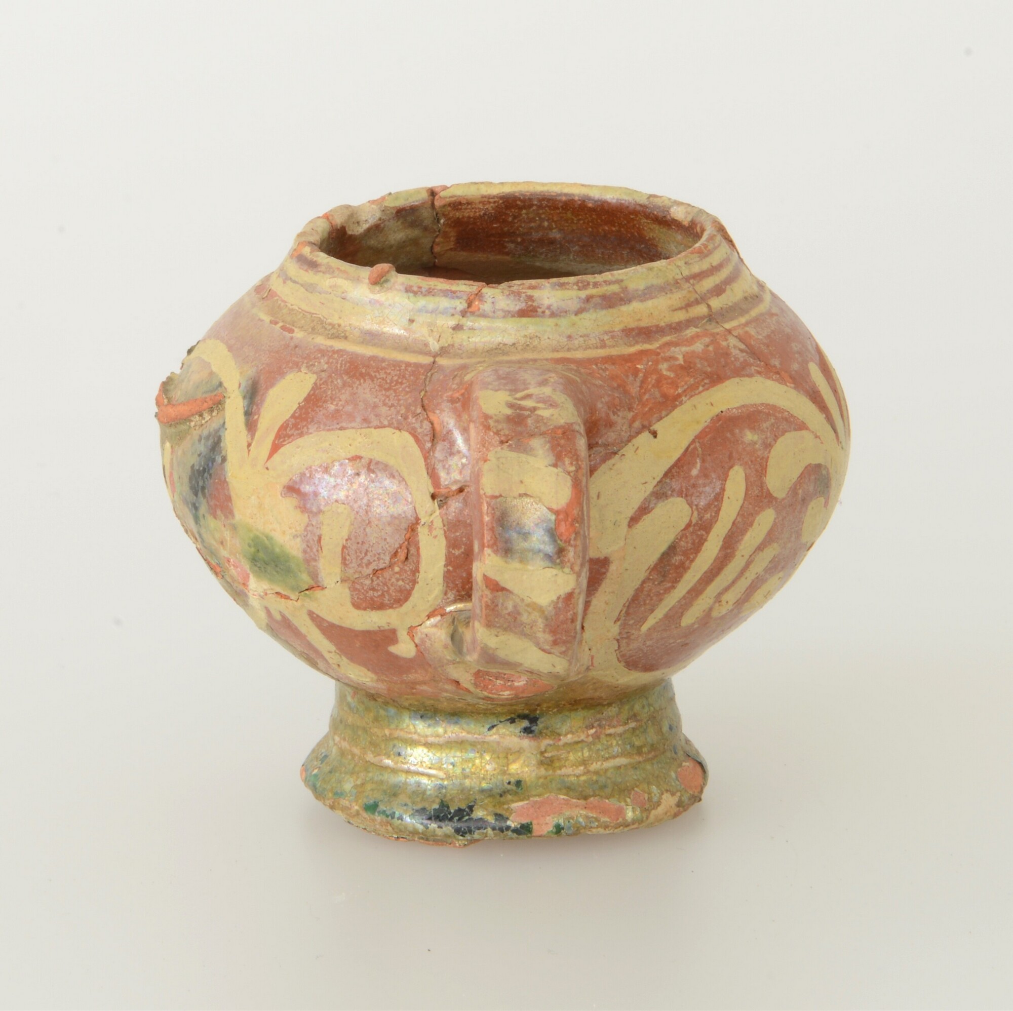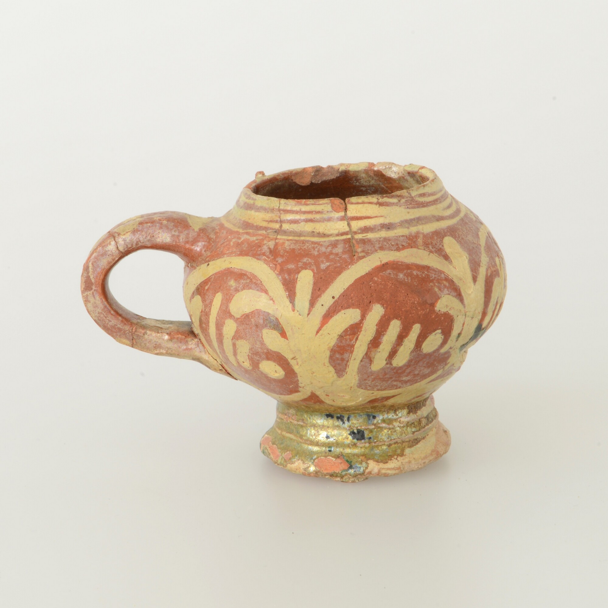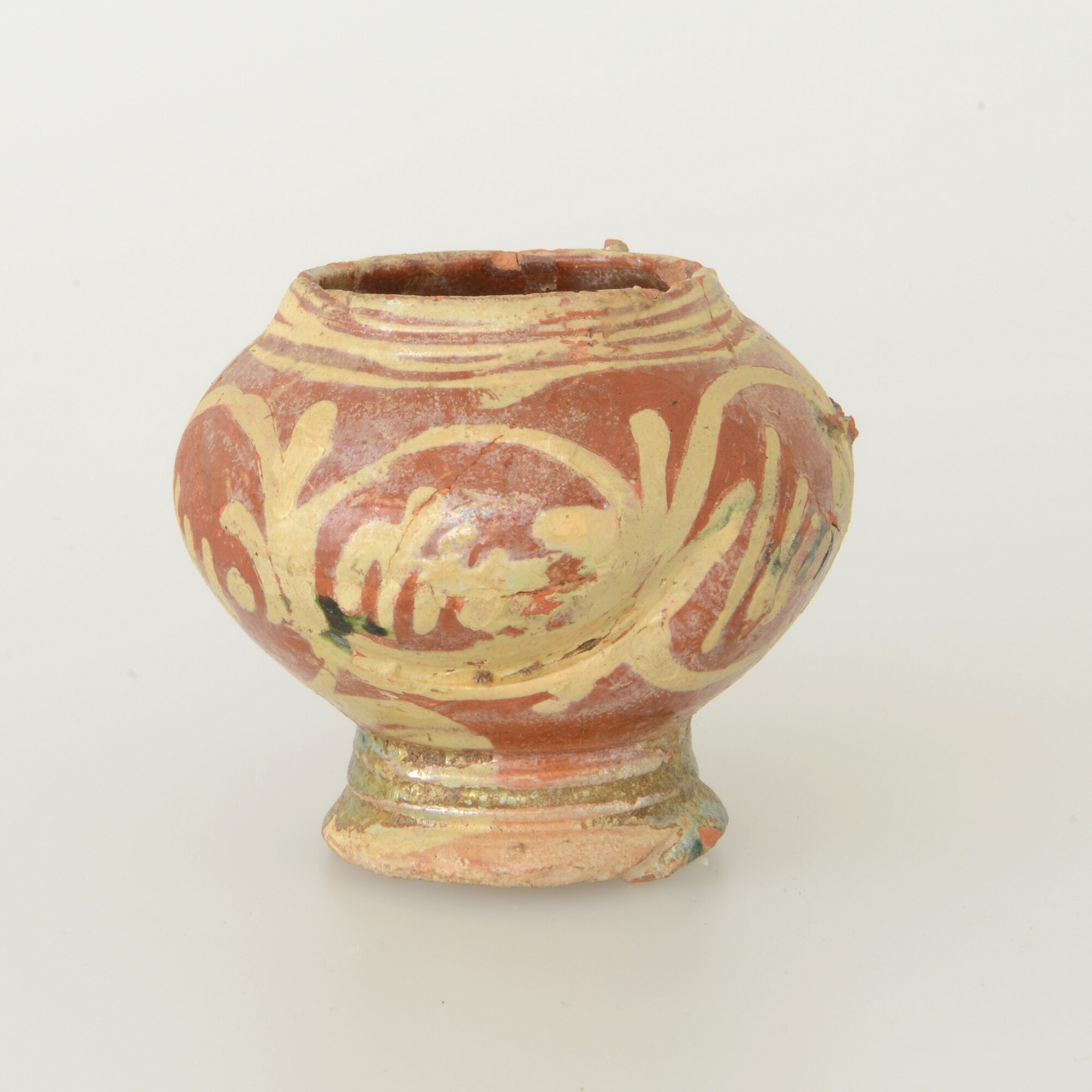 Mosterdpot; roodbakkend; loodglazuur; slibversiering; verticaal lintoor; standvoet; productieplaats: Enkhuizen