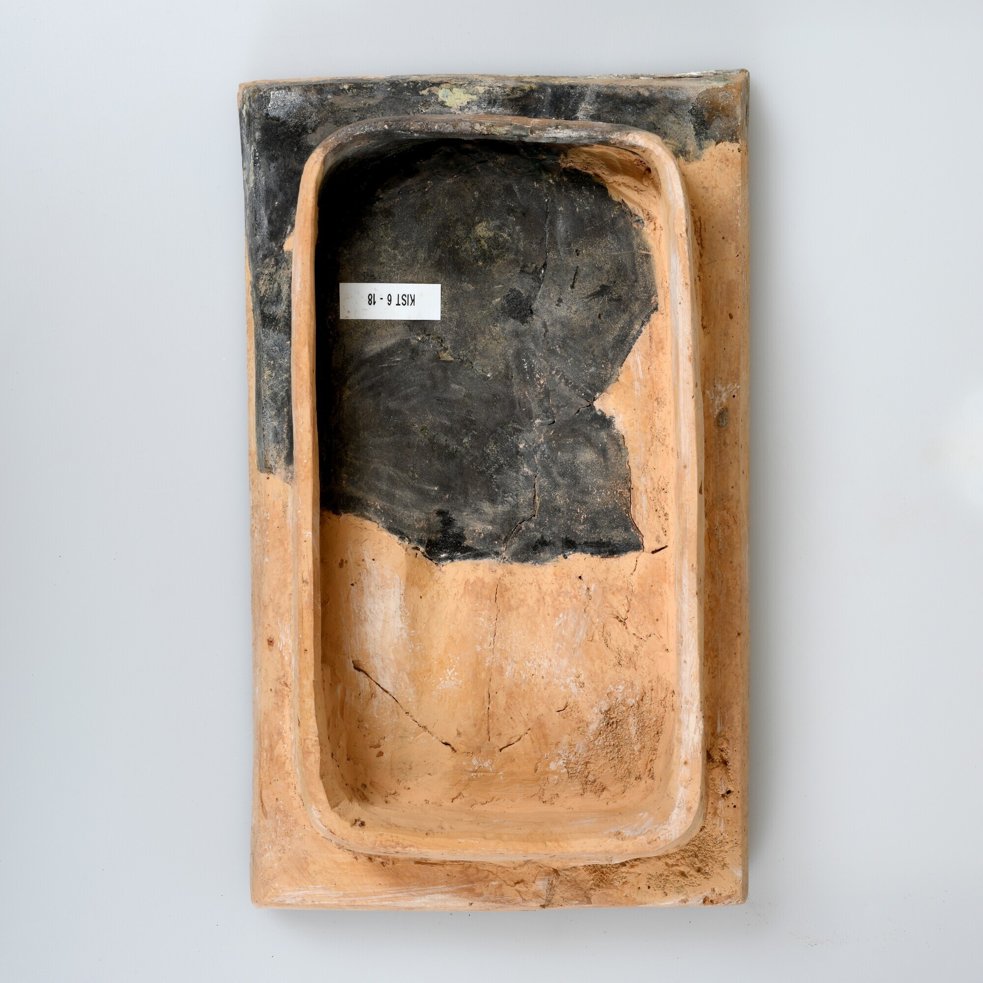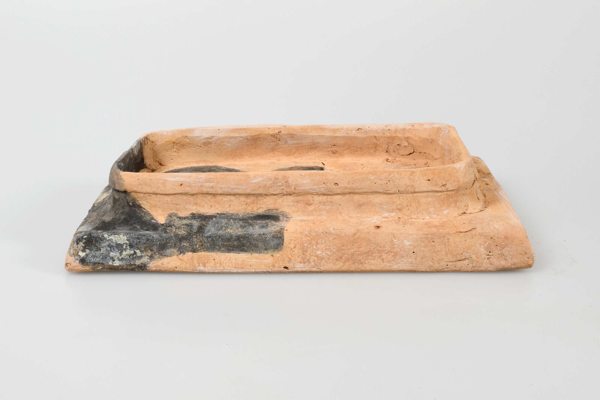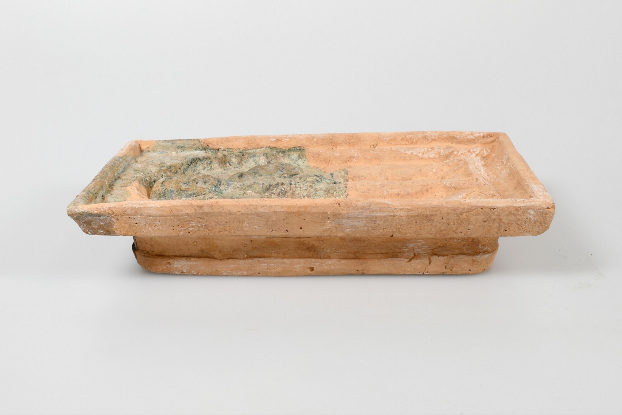 Kacheltegel; reliëftegel type C; loodglazuur met koperoxide; rechthoekige tegel. De bandbreedte is ongeveer 3,5 cm. Het hoofdmotief is een bijna naakt jongetje met vogel op de arm. Opschrift: .METRIA; productieplaats: Enkhuizen