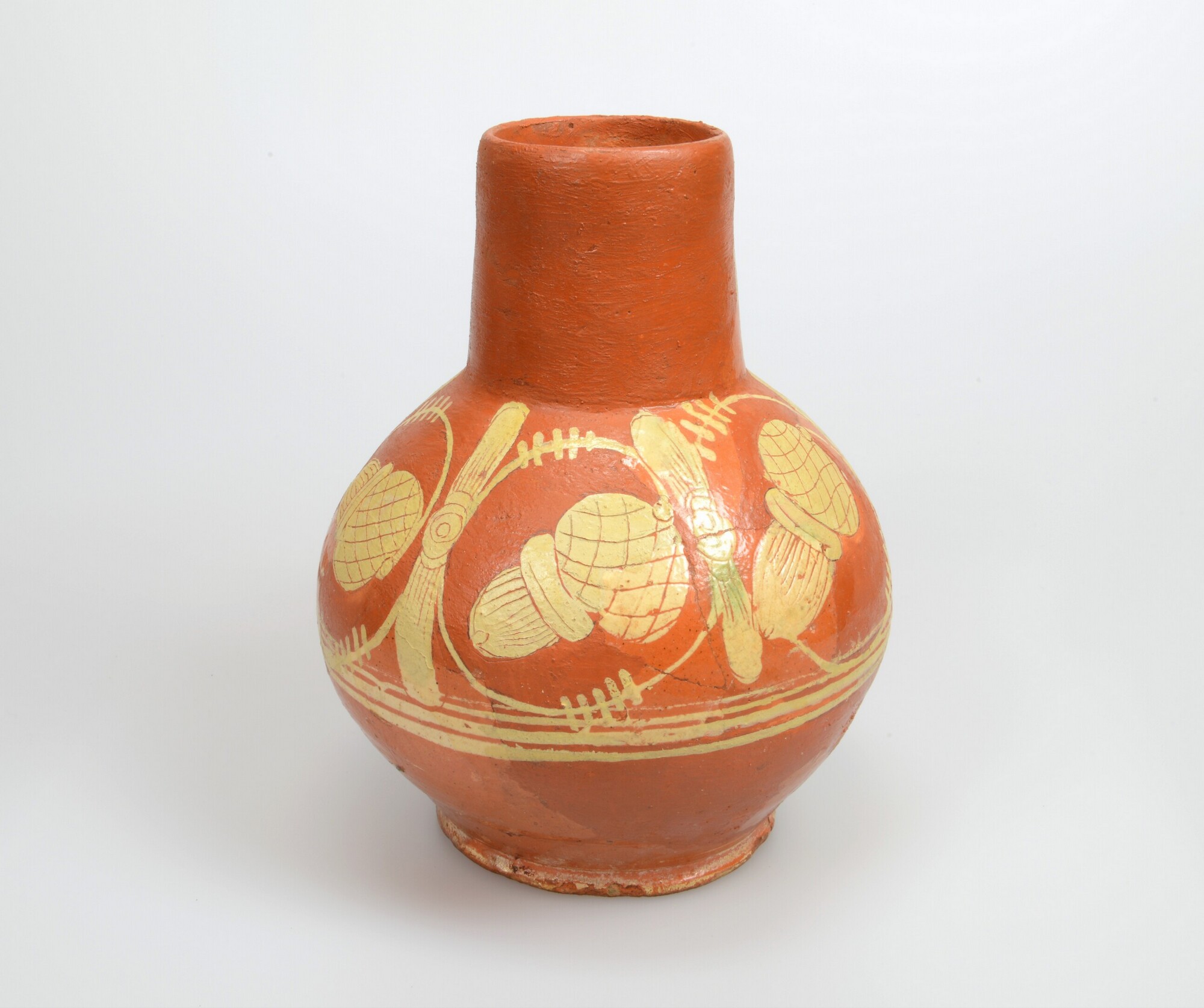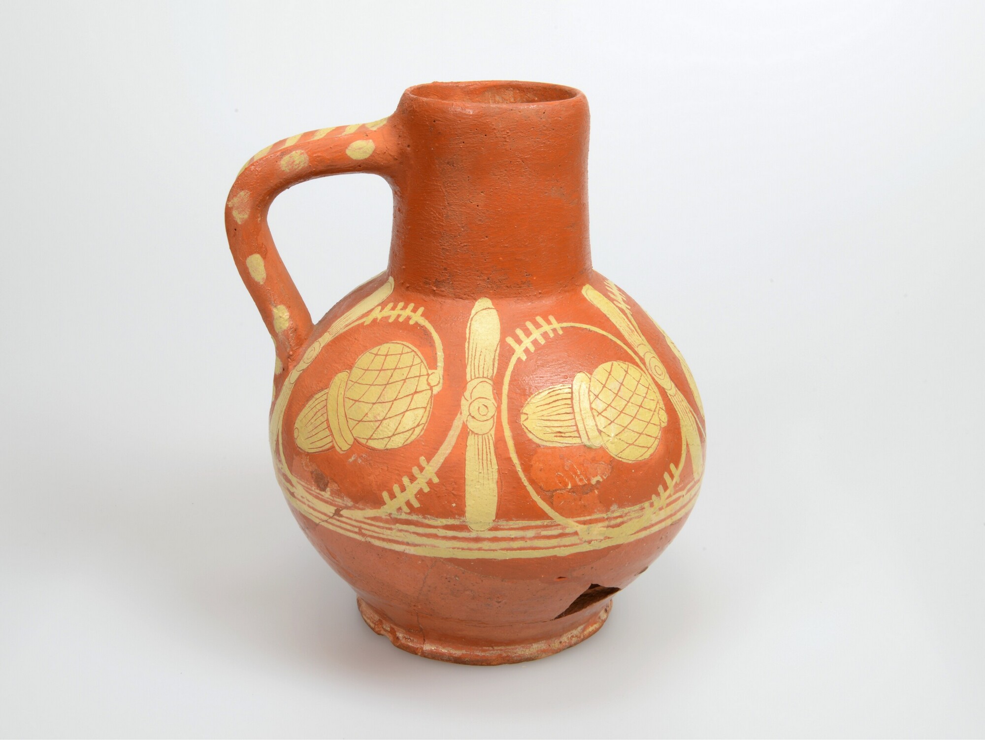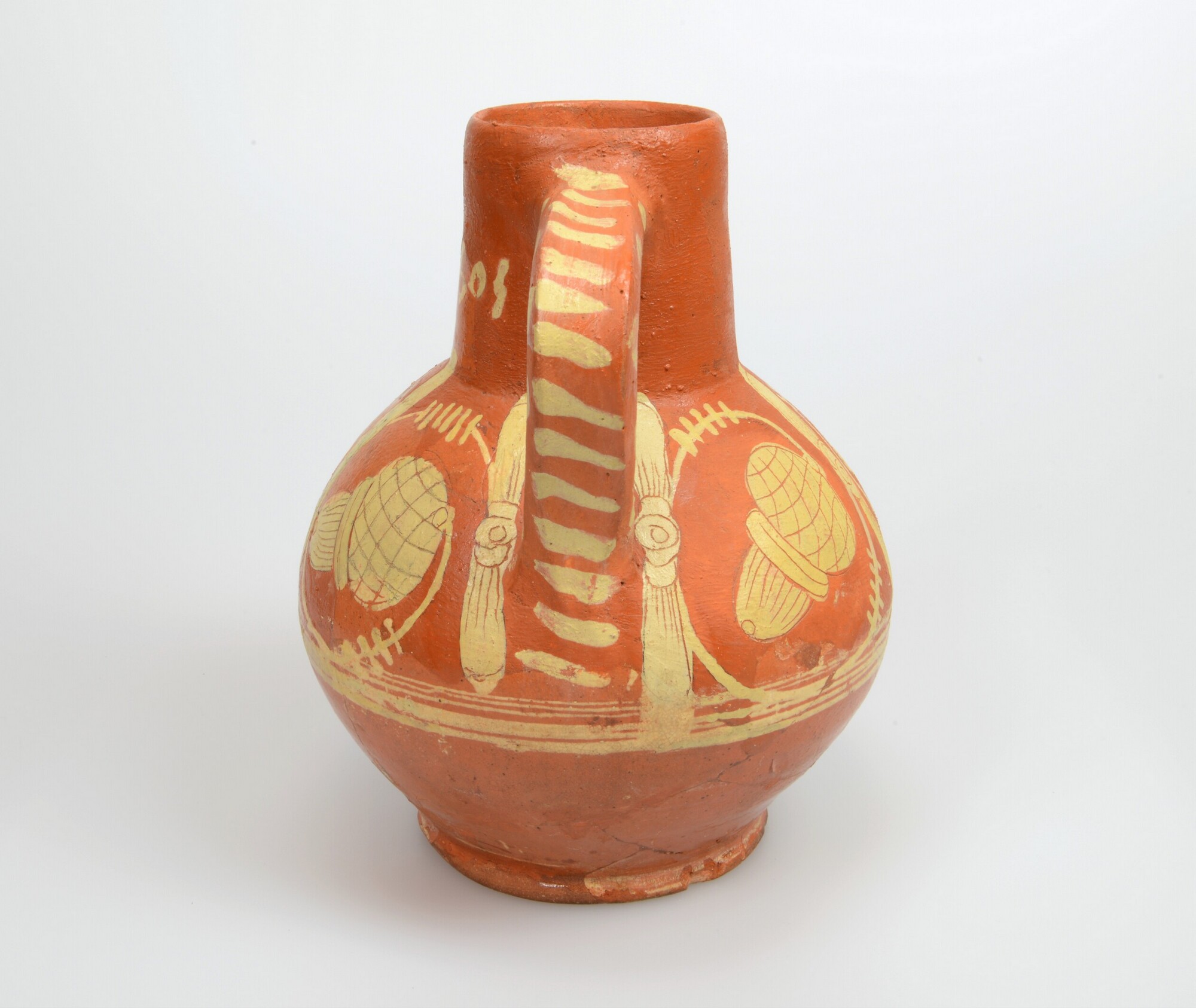 Kan; wa-kan-1; bolle kan met cilindrische hals met rechte rand, standvlak, verticaal worstoor; roodbakkend Werra-aardewerk; loodglazuur; slibversiering, slib-krastechniek; eikels en bladmotieven op buik, jaartal 1605 op hals, stippen en streepjes op oor; productieplaats: Enkhuizen