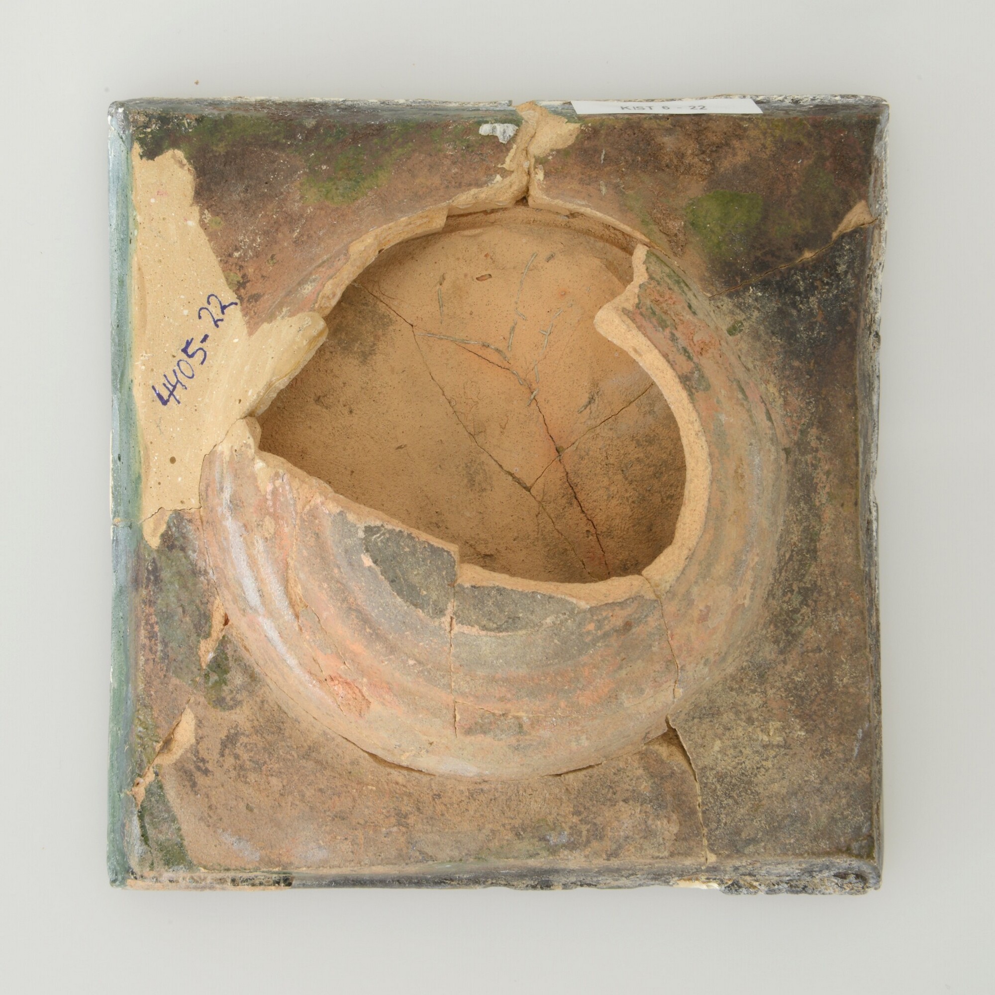 Kacheltegel; reliëftegel type A; koperhoudend loodglazuur. vierkante tegel. aan de achterzijde is hij voorzien van een kleine, op schijf gedraaide van roodbakkende klei vervaardigde schaalvorm van ongeveer 10.5 cm doorsnede bij een hoogte van 4 cm. Het reliëf toont Delila, de vrouw van Samson uit het Bijbelverhaal zittend op een leeuw en met een afgebroken ...