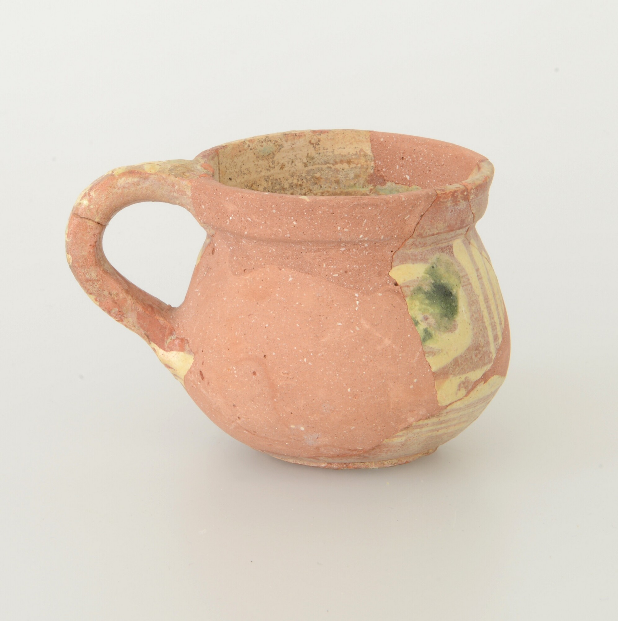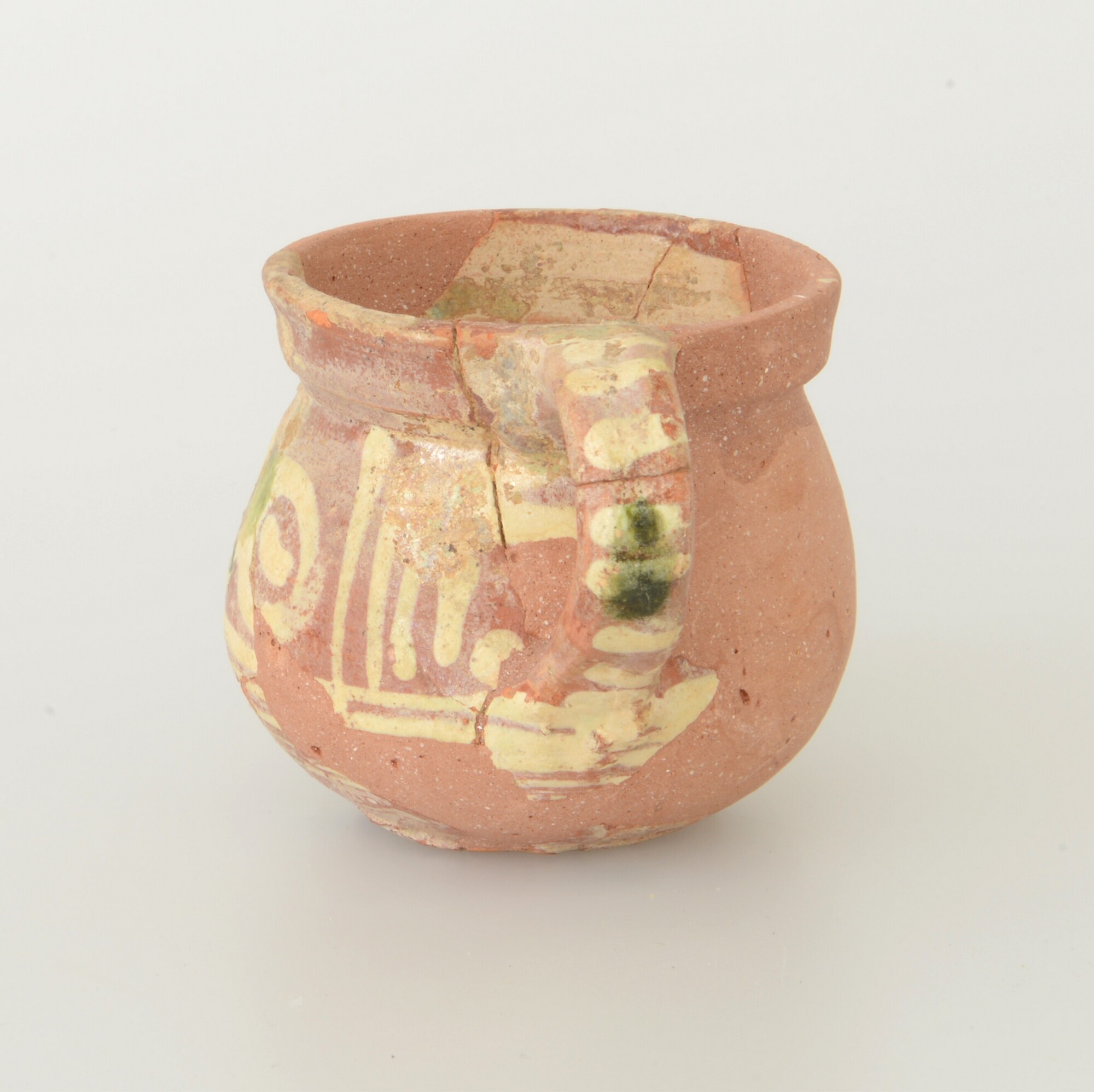 Kop/drinkvorm; r-kop; roodbakkend aardewerk; in- en uitwendig loodglazuur; uitwendige slibversiering: spiralen, concentrische cirkels, begrensd door een drietal horizontale spiraalwindingen; verticaal lintoor; standvlak; productieplaats: Enkhuizen