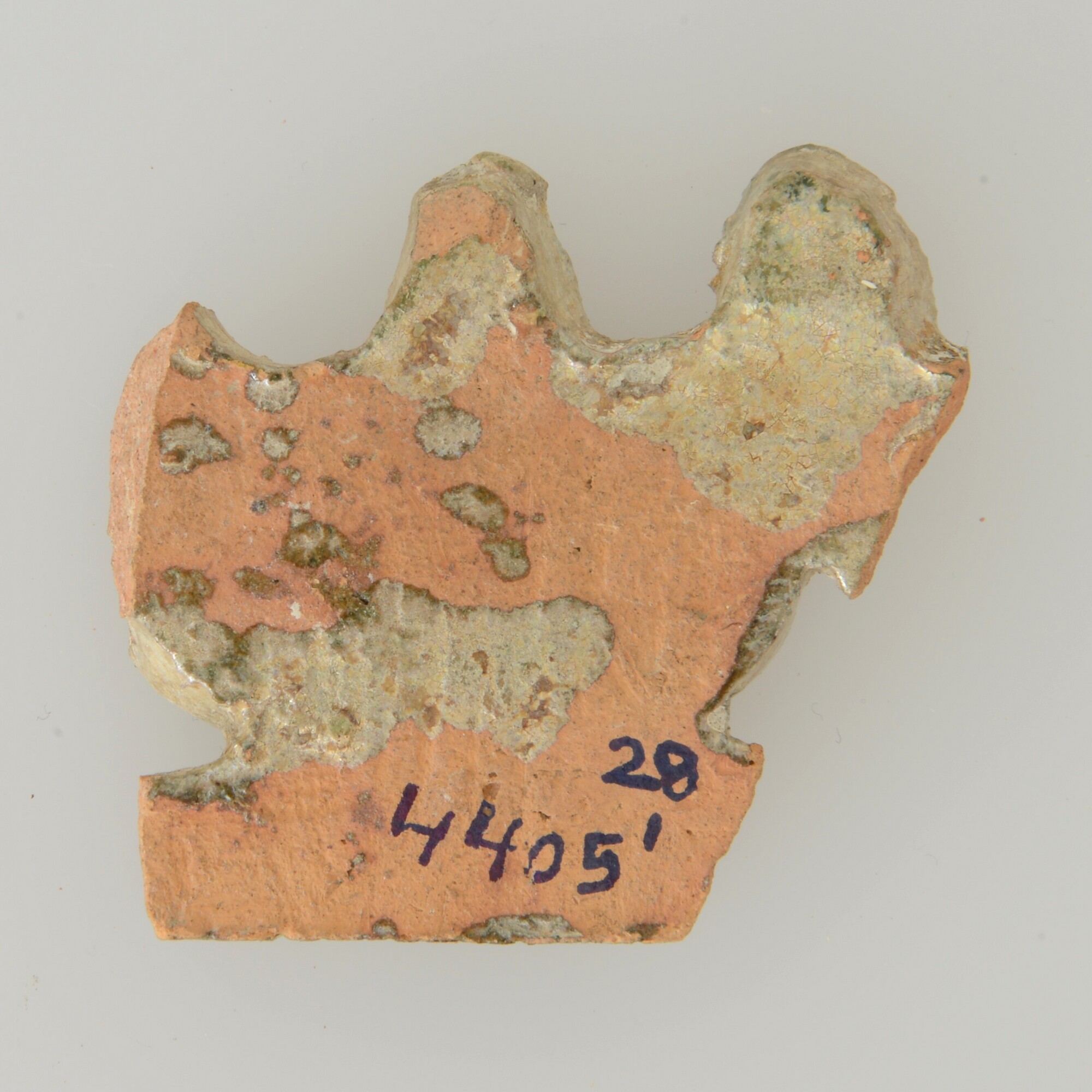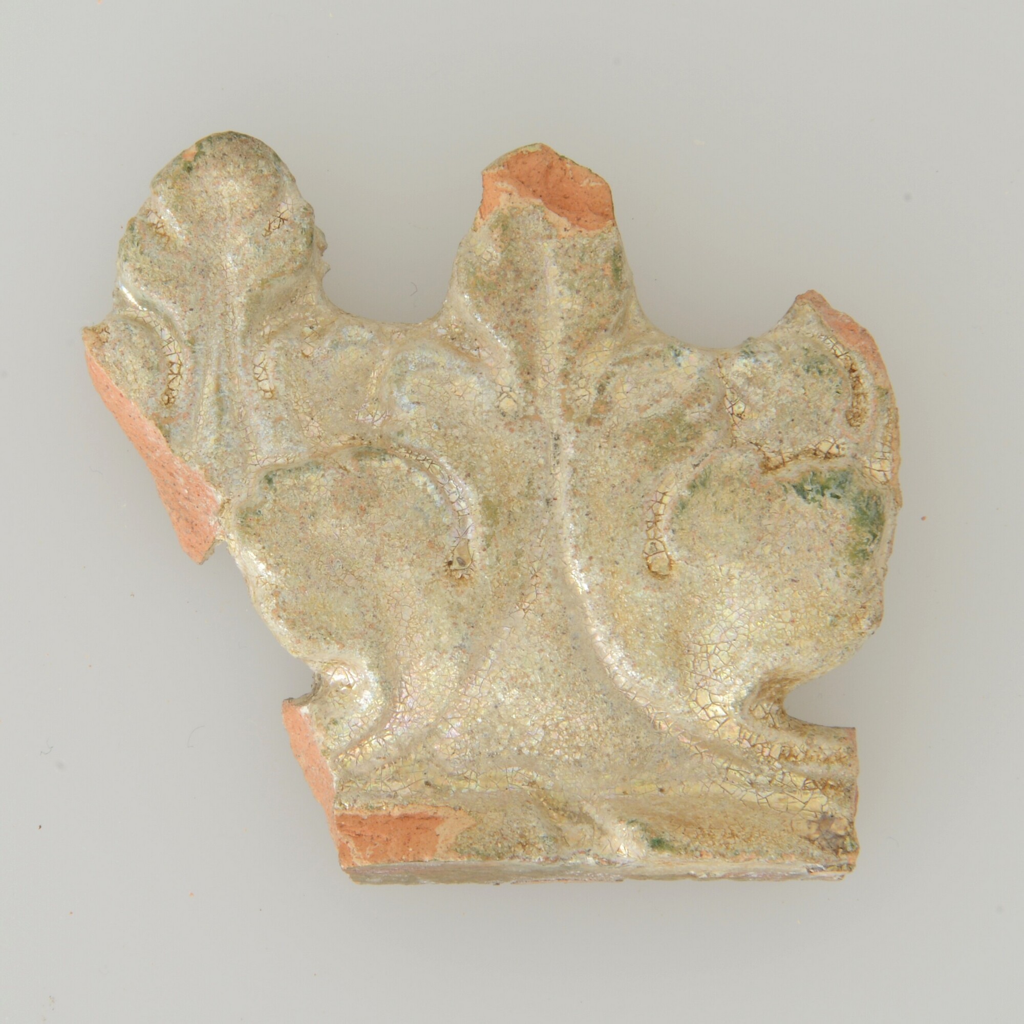 Kroonlijst type F; onderdeel van een kacheloven; roodbakkend; loodglazuur met koperoxide; bladmotieven; productieplaats: Enkhuizen