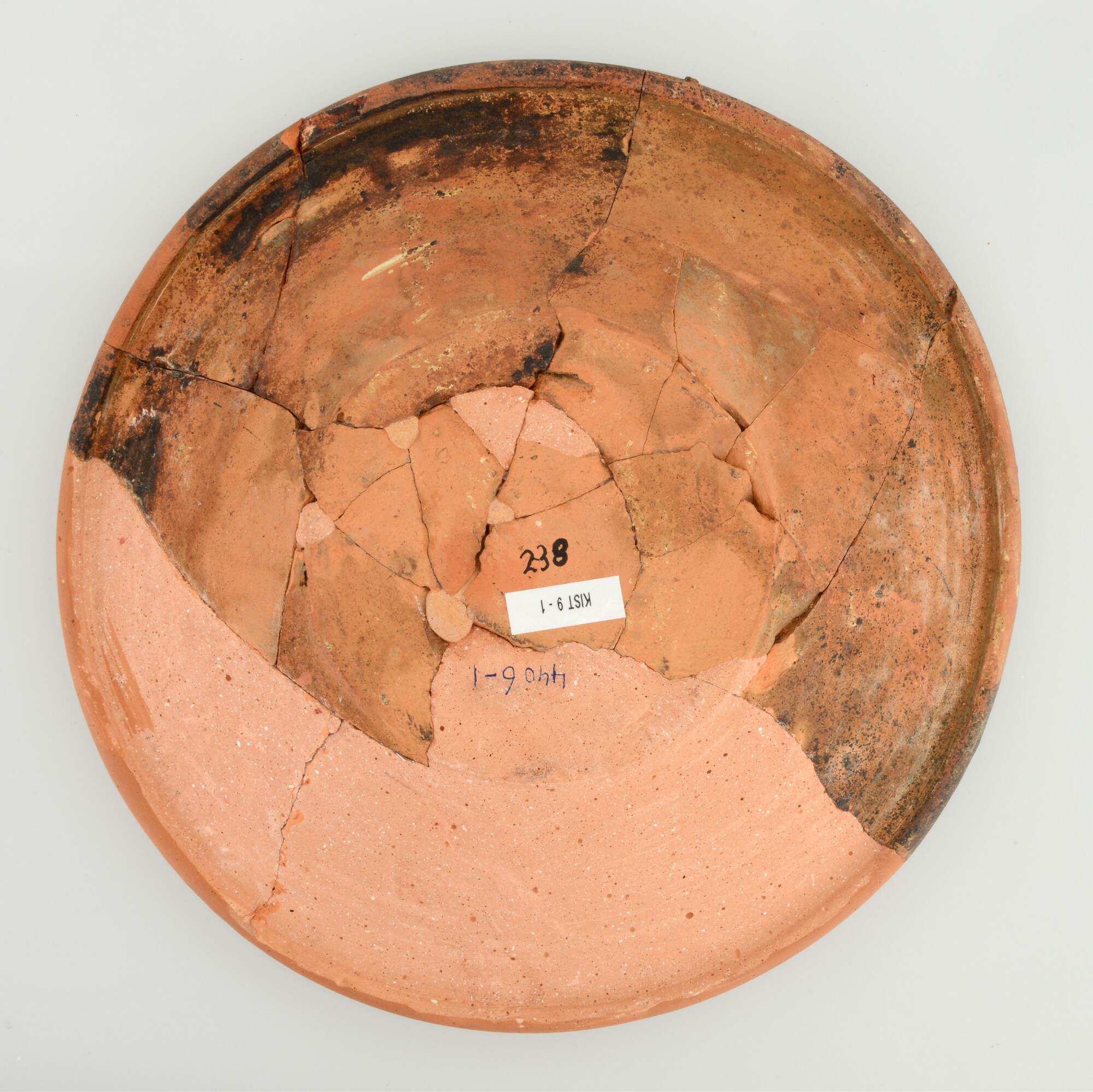Schotel; wa-bor-1; roodbakkend; halffabricaat, biscuit; slibversiering, slib-krastechniek; vl: concentrische cirkels, ornamentbanden, sp: Jongeman met kelk, initialen DCS en jaartal 1605; standvlak; productieplaats: Enkhuizen