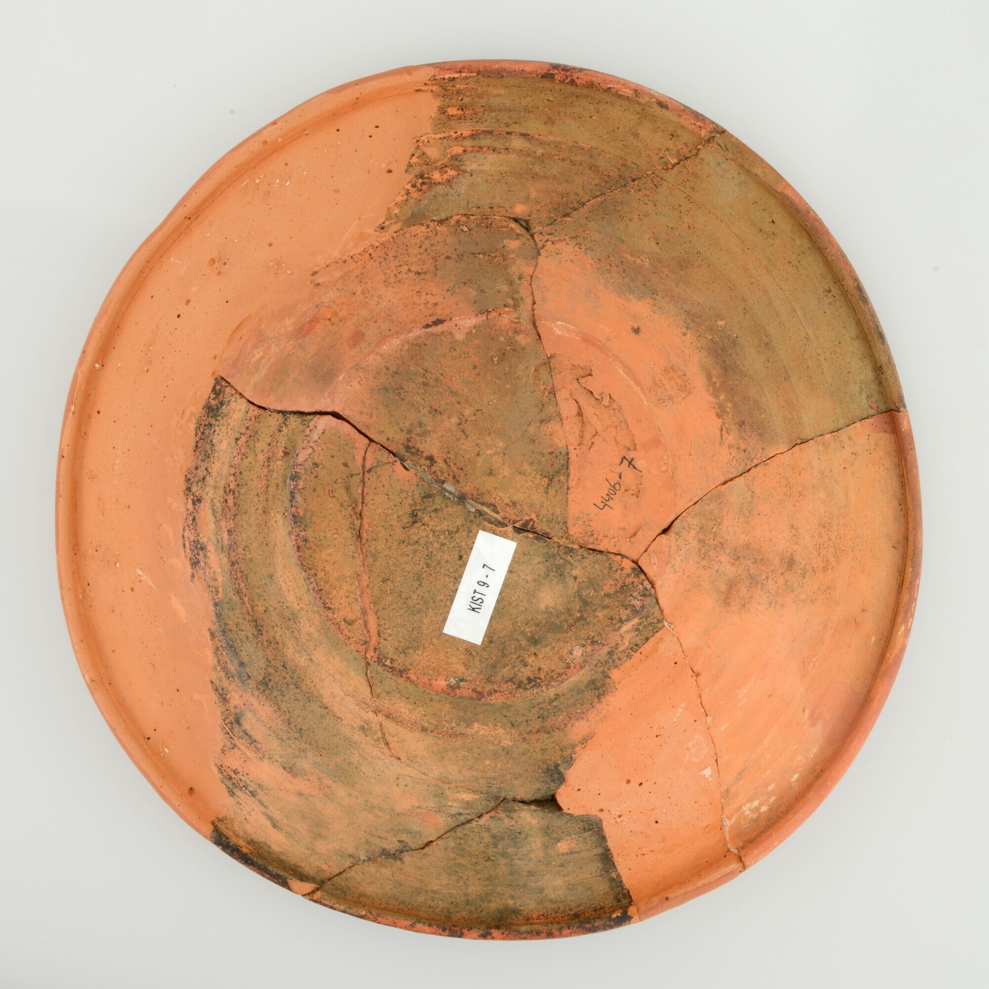 Schotel; wa-bor-1; roodbakkend; halffabricaat, biscuit; slibversiering, slib-krastechniek; vl: concentrische cirkels, ornamentbanden, sp: Heilige Laurentius en jaartal 1605; standvlak; productieplaats: Enkhuizen