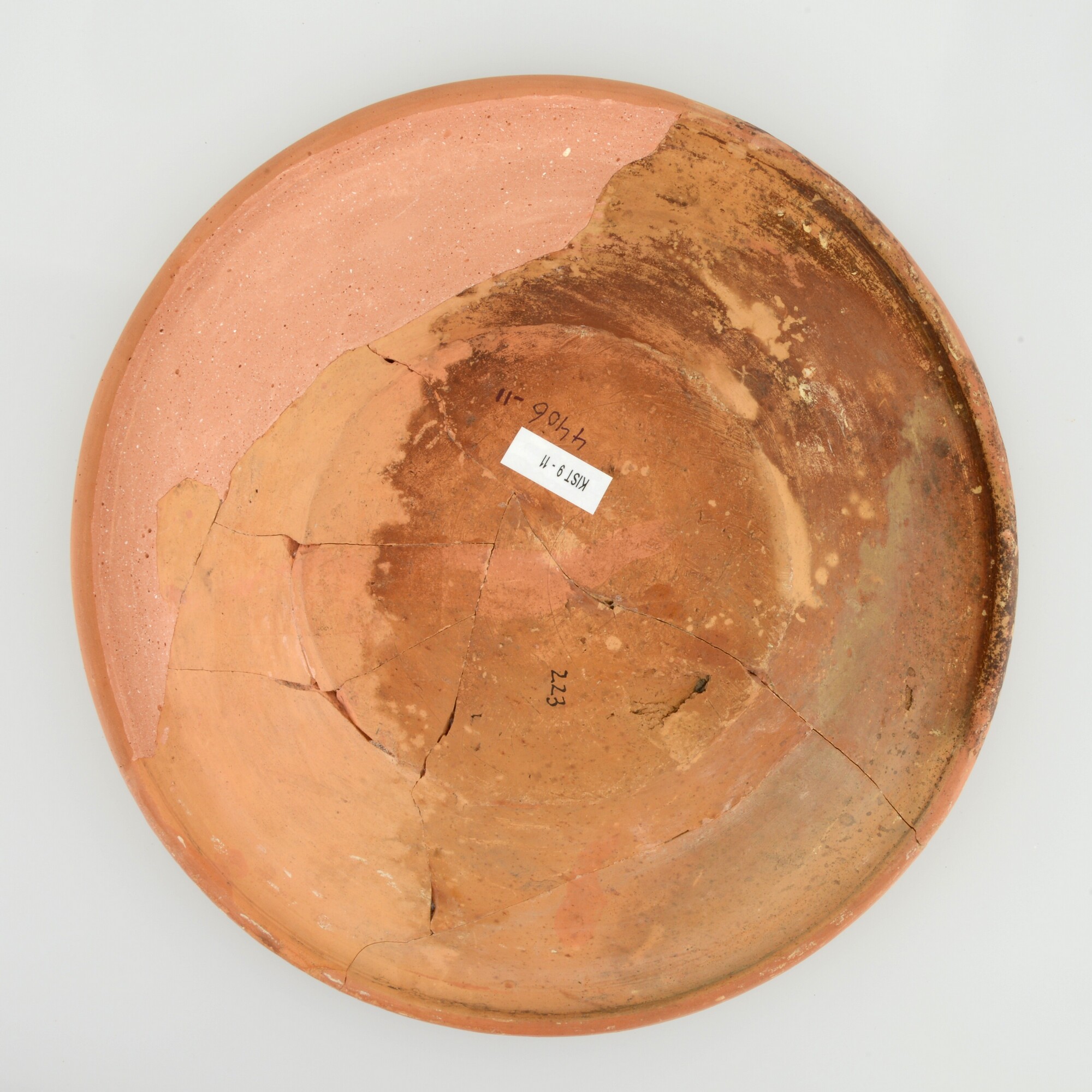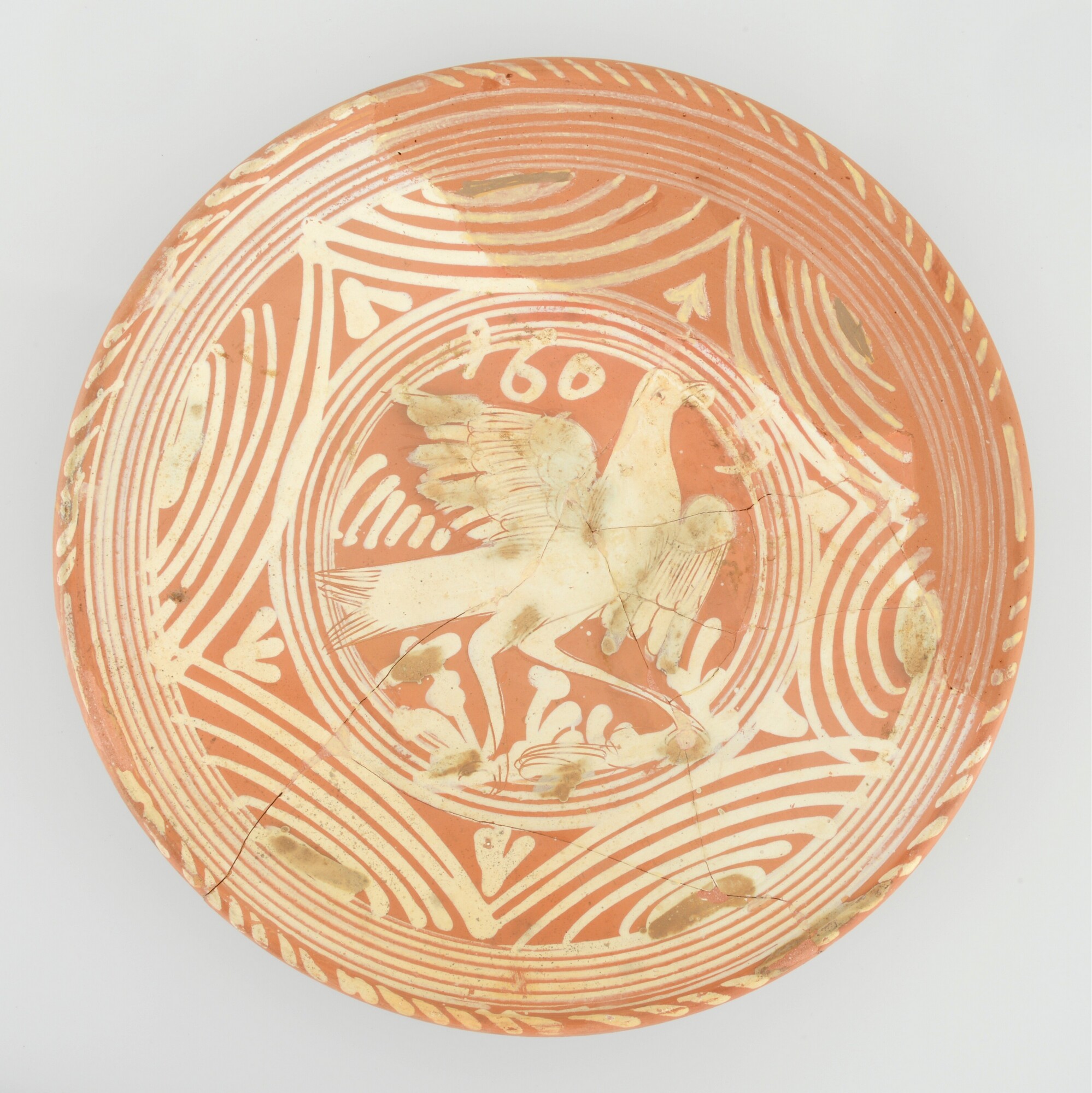 Schotel; wa-bor-1; roodbakkend; halffabricaat, biscuit; slibversiering, slib-krastechniek; vl: concentrische cirkels, ornamentbanden, sp: Vogel met gespreide vleugels en jaartal 1605; standvlak; productieplaats: Enkhuizen