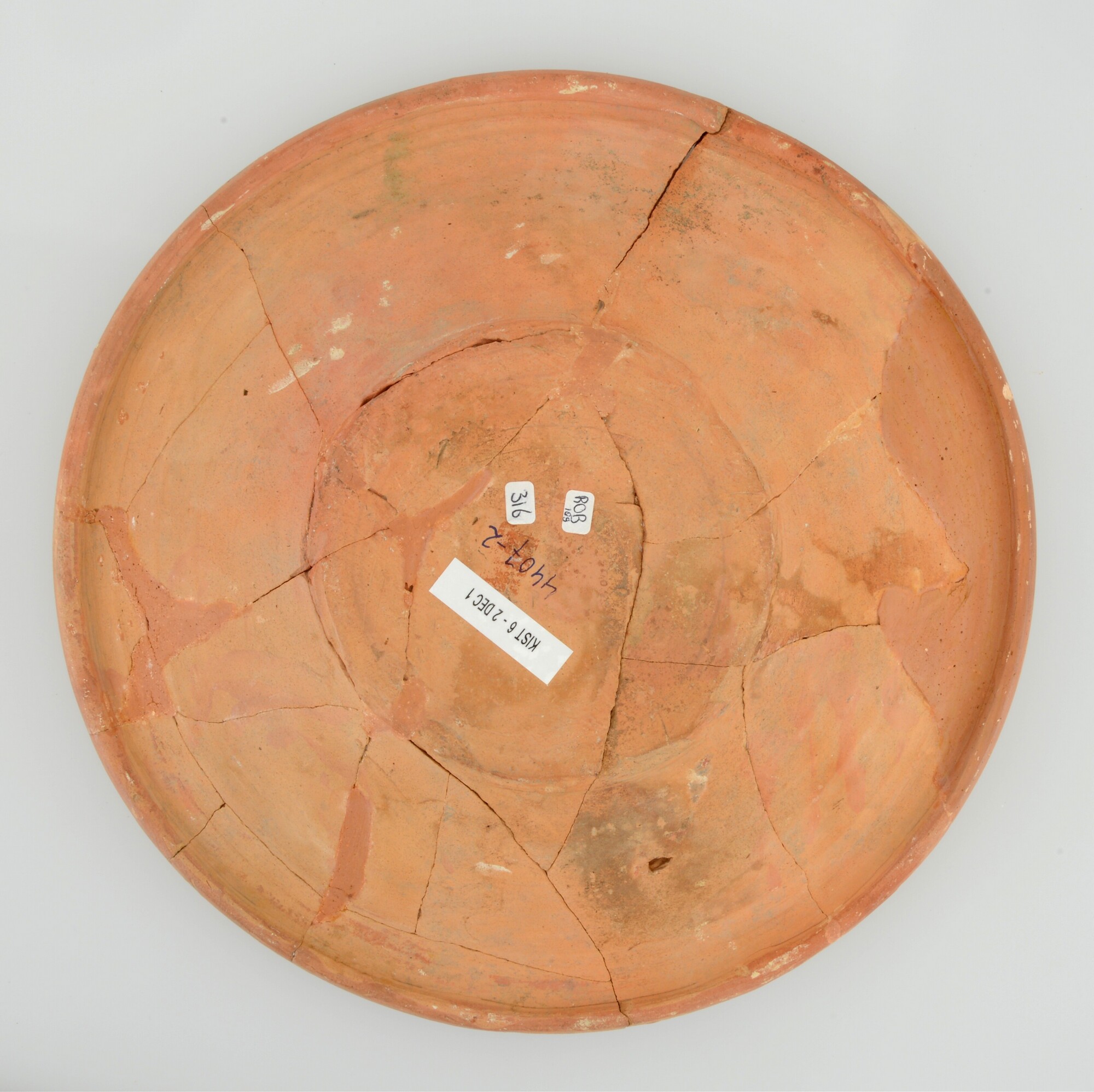 Schotel; wa-bor-1; roodbakkend; halffabricaat, biscuit; slibversiering, slib-krastechniek; vl: concentrische cirkels, ornamentbanden, sp: adelaar met hart en nimbus en jaartal 1605; standvlak; productieplaats: Enkhuizen