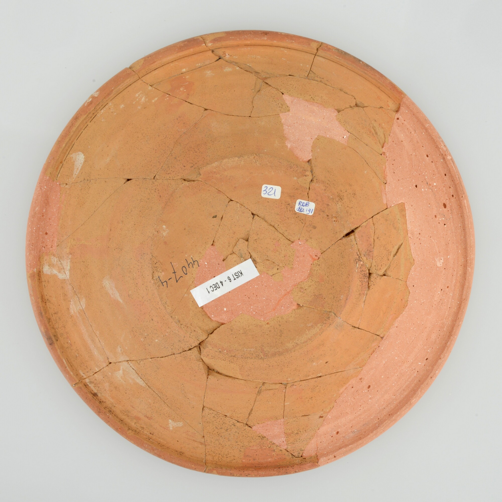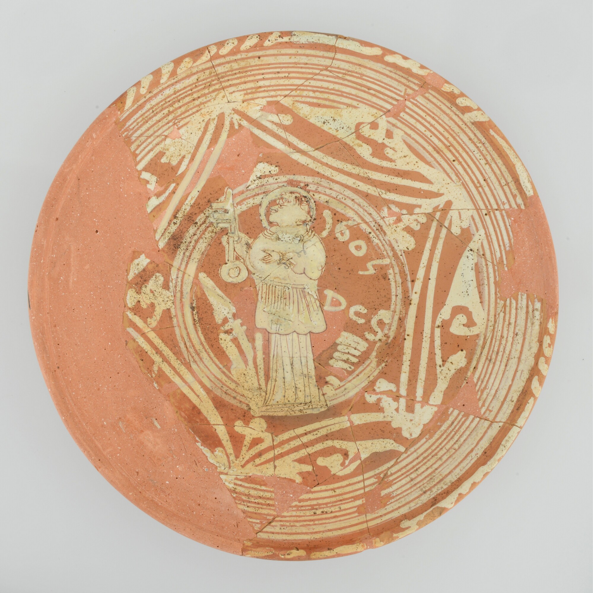 Schotel; wa-bor-1; roodbakkend; halffabricaat, biscuit; slibversiering, slib-krastechniek; vl: concentrische cirkels, ornamentbanden, sp: Heilige Petrus, jaartal 1605 en initialen; standvlak; productieplaats: Enkhuizen