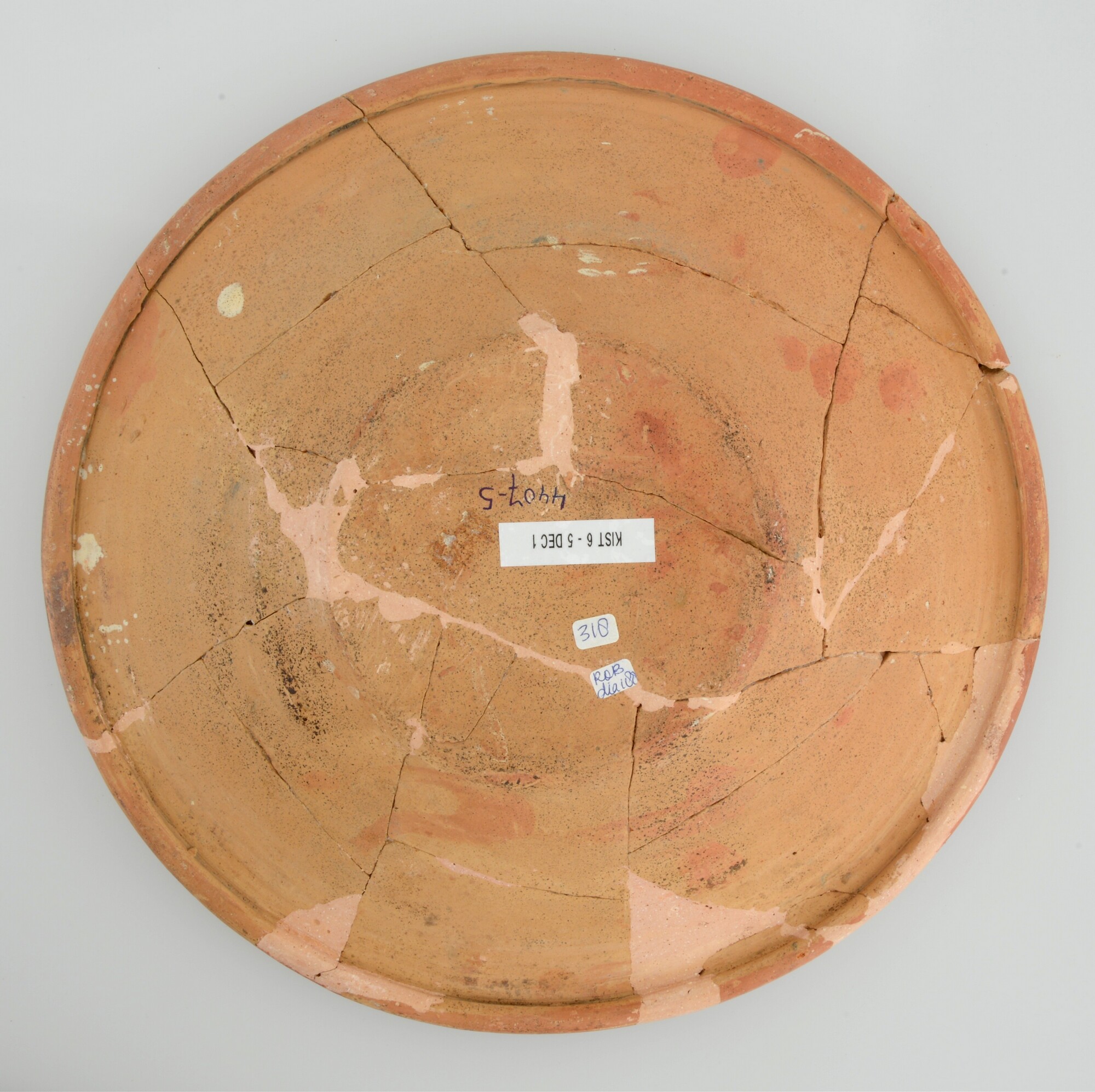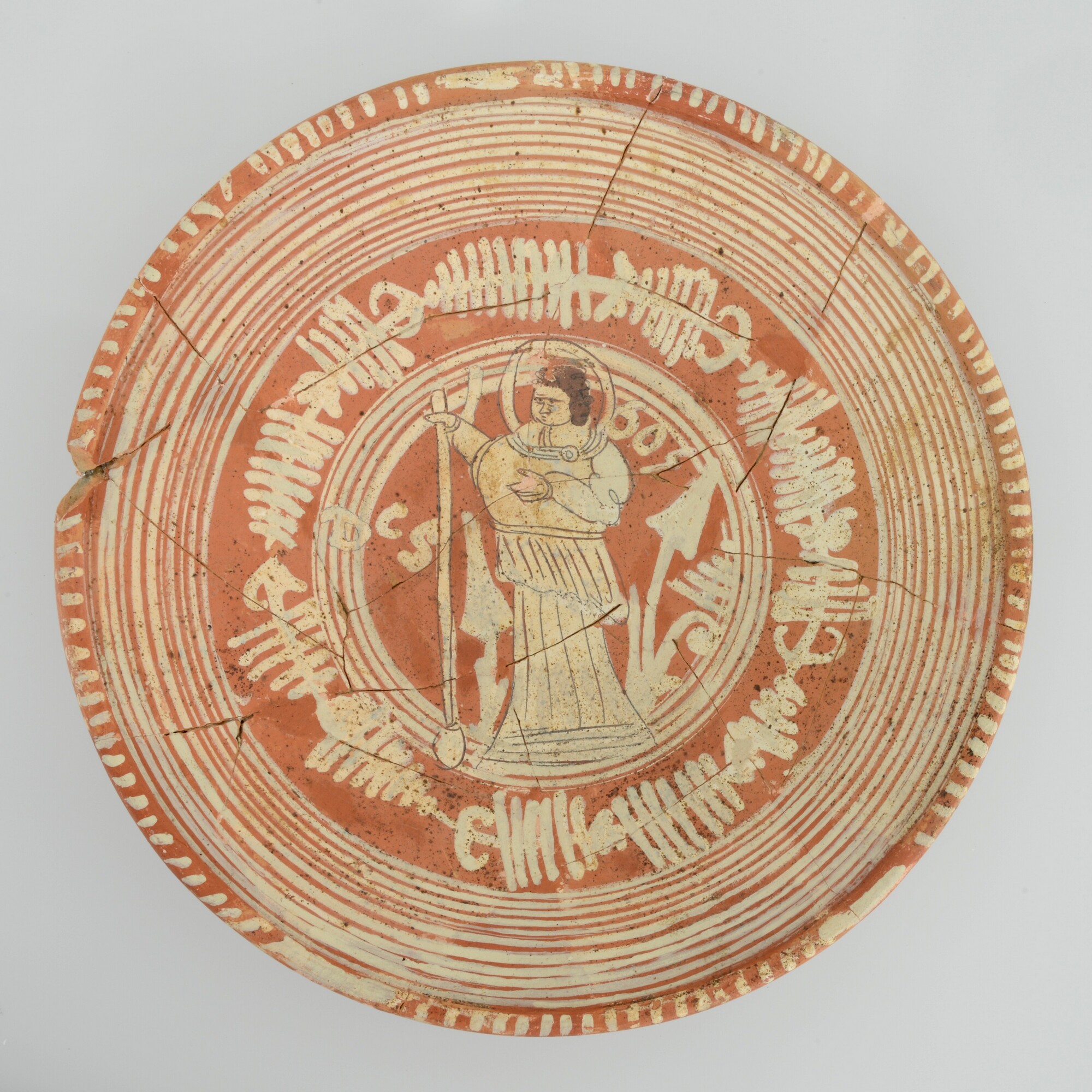 Schotel; wa-bor-1; roodbakkend; halffabricaat, biscuit; slibversiering, slib-krastechniek; vl: concentrische cirkels, ornamentbanden, sp: Heilige Thomas, initialen DCS en jaartal 1605; standvlak; productieplaats: Enkhuizen