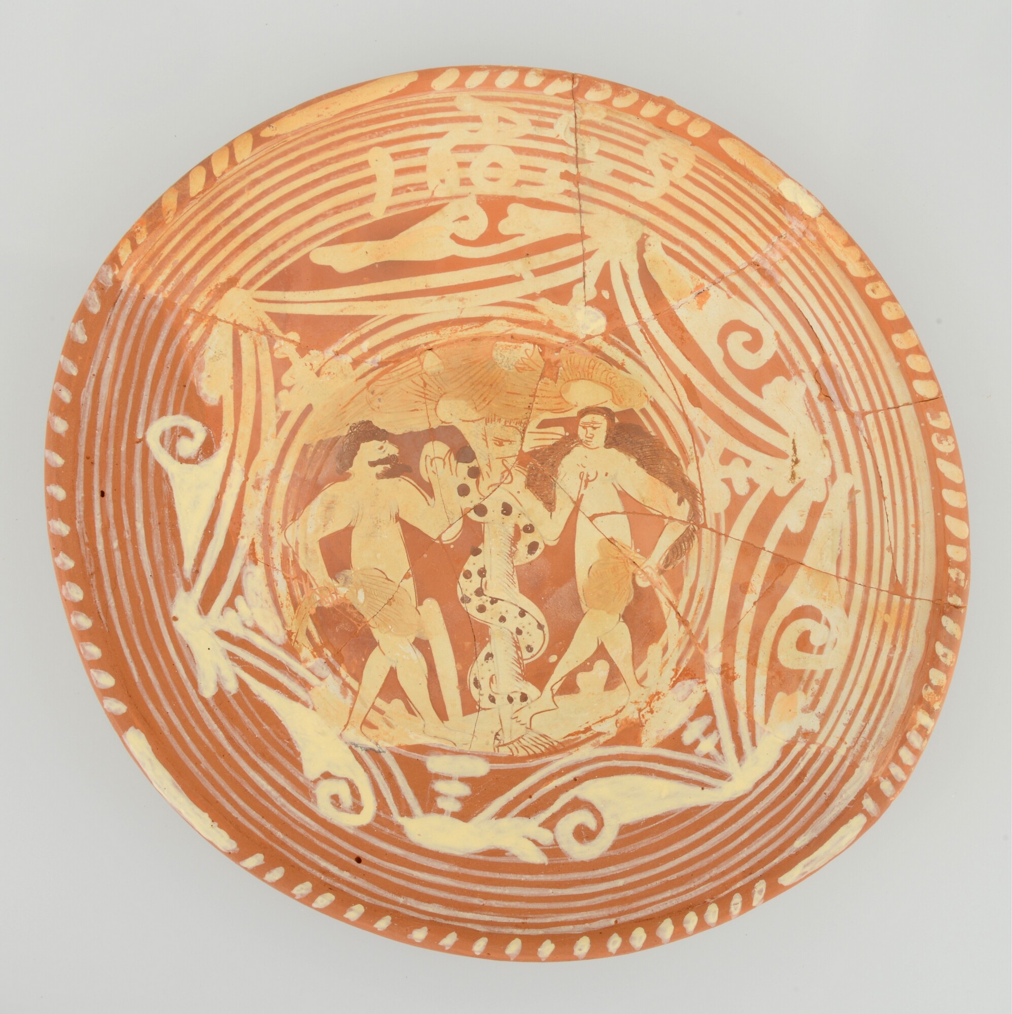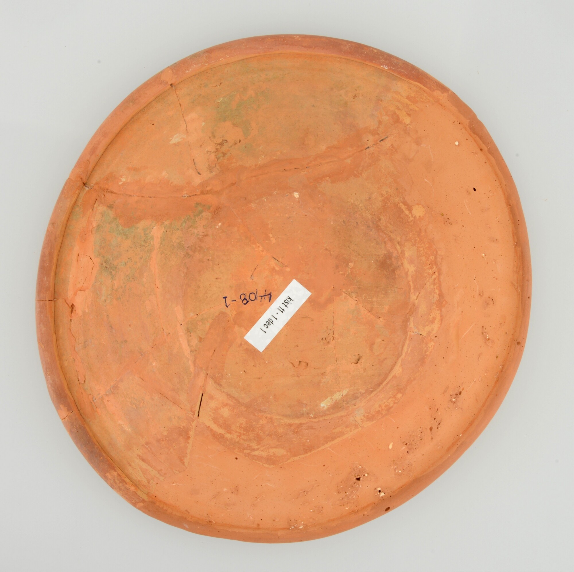 Schotel; wa-bor-1; roodbakkend; halffabricaat, biscuit; slibversiering, slib-krastechniek; vl: concentrische cirkels, ornamentbanden, initialen DCS en jaartal 1605; sp: Adam en Eva; standvlak; productieplaats: Enkhuizen