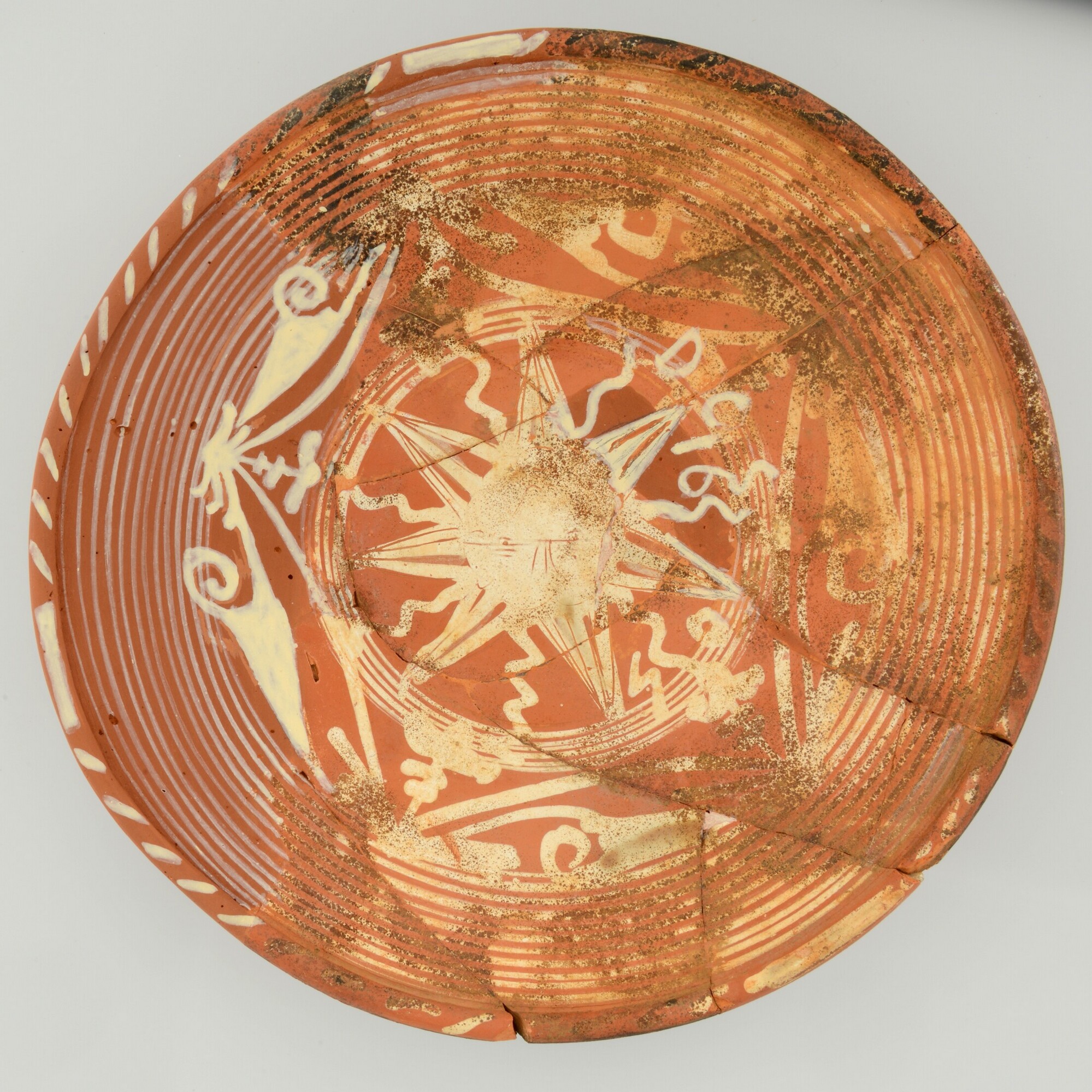 Schotel; wa-bor-1; roodbakkend; halffabricaat, biscuit; slibversiering, slib-krastechniek; vl: concentrische cirkels, ornamentbanden, sp: zevenpuntige zon, initialen DCS en jaartal 1605; standvlak; productieplaats: Enkhuizen