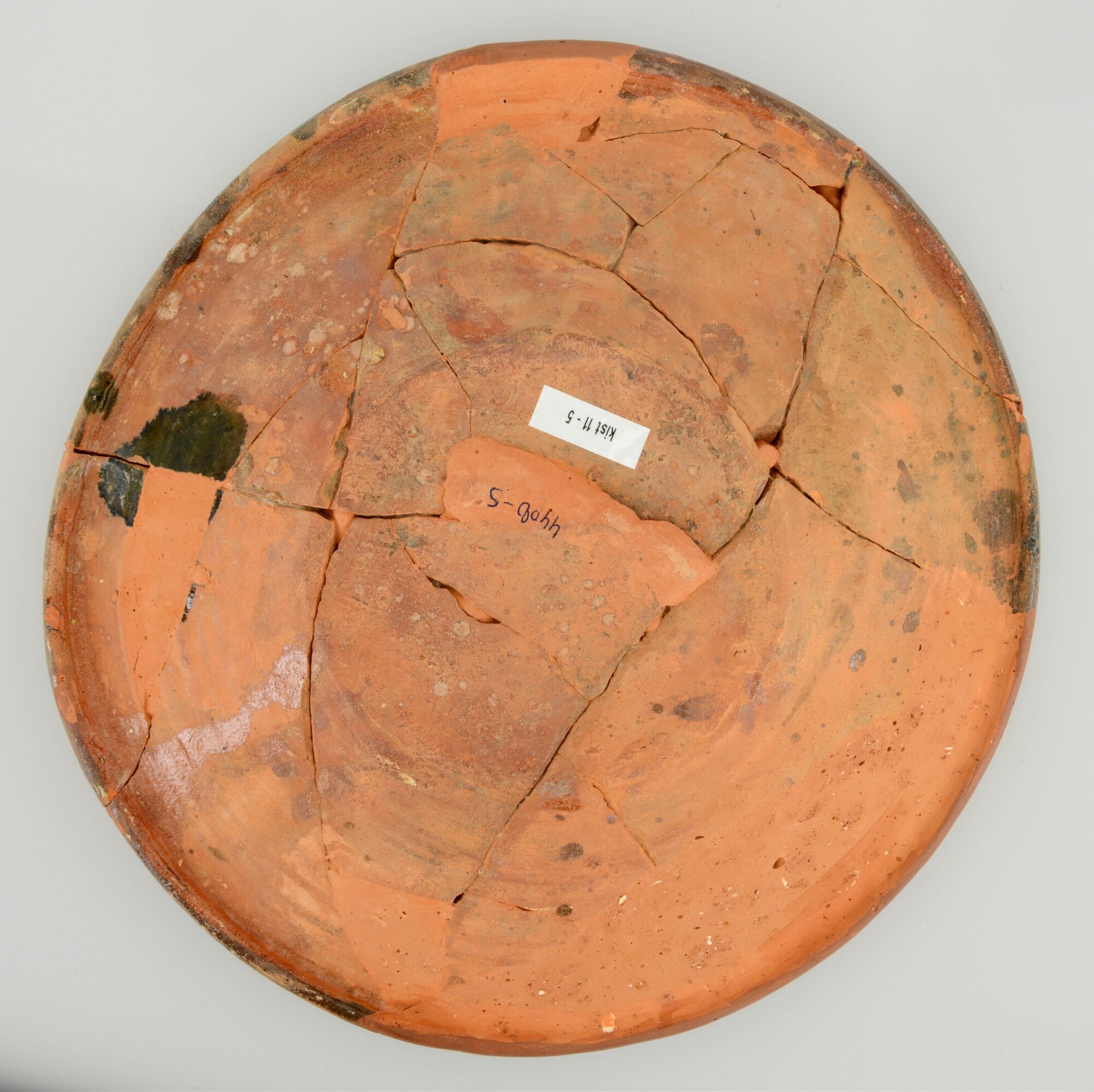 Schotel; wa-bor-1; roodbakkend; verbrand; loodglazuur, biscuit; slibversiering, slib-krastechniek; vl: concentrische cirkels, ornamentbanden, sp: drie distelbloemen; standvlak; productieplaats: Enkhuizen