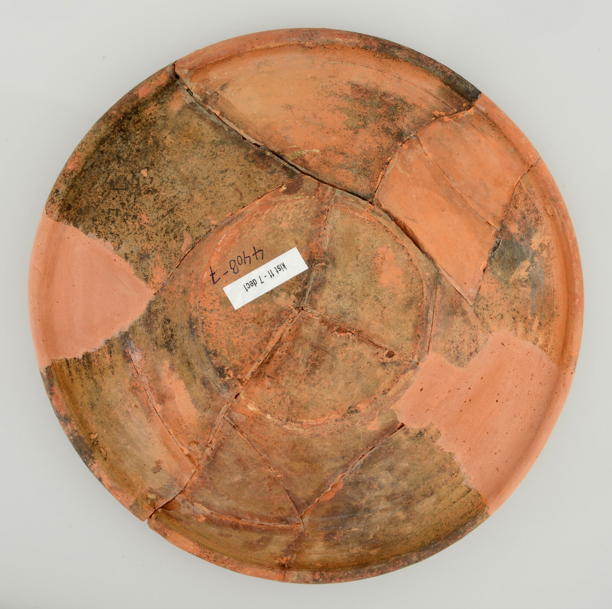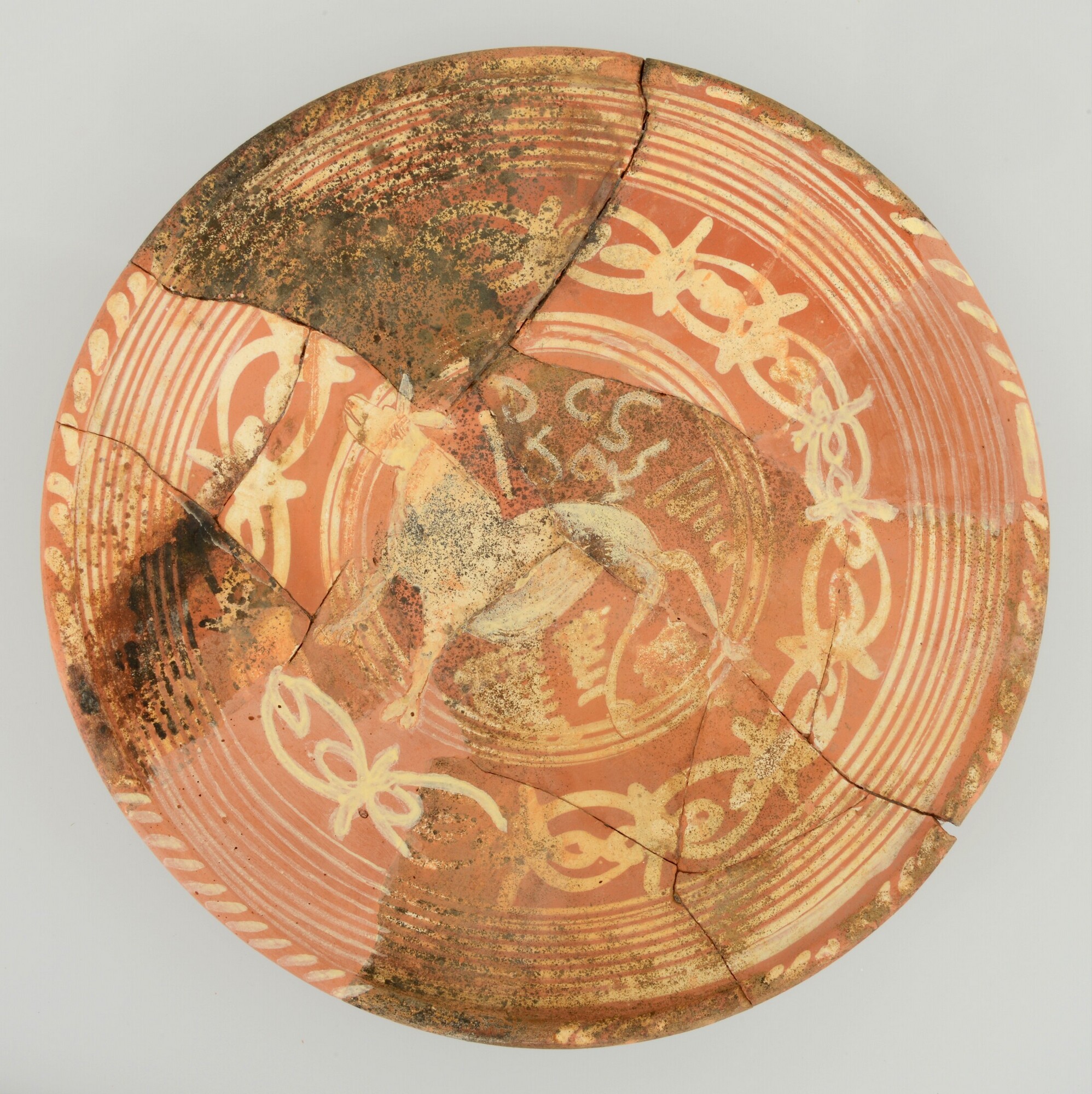 Schotel; wa-bor-1; roodbakkend; halffabricaat, biscuit; slibversiering, slib-krastechniek; vl: concentrische cirkels, ornamentbanden, sp: springende hinde?, initialen DCS en jaartal 1605; standvlak; productieplaats: Enkhuizen